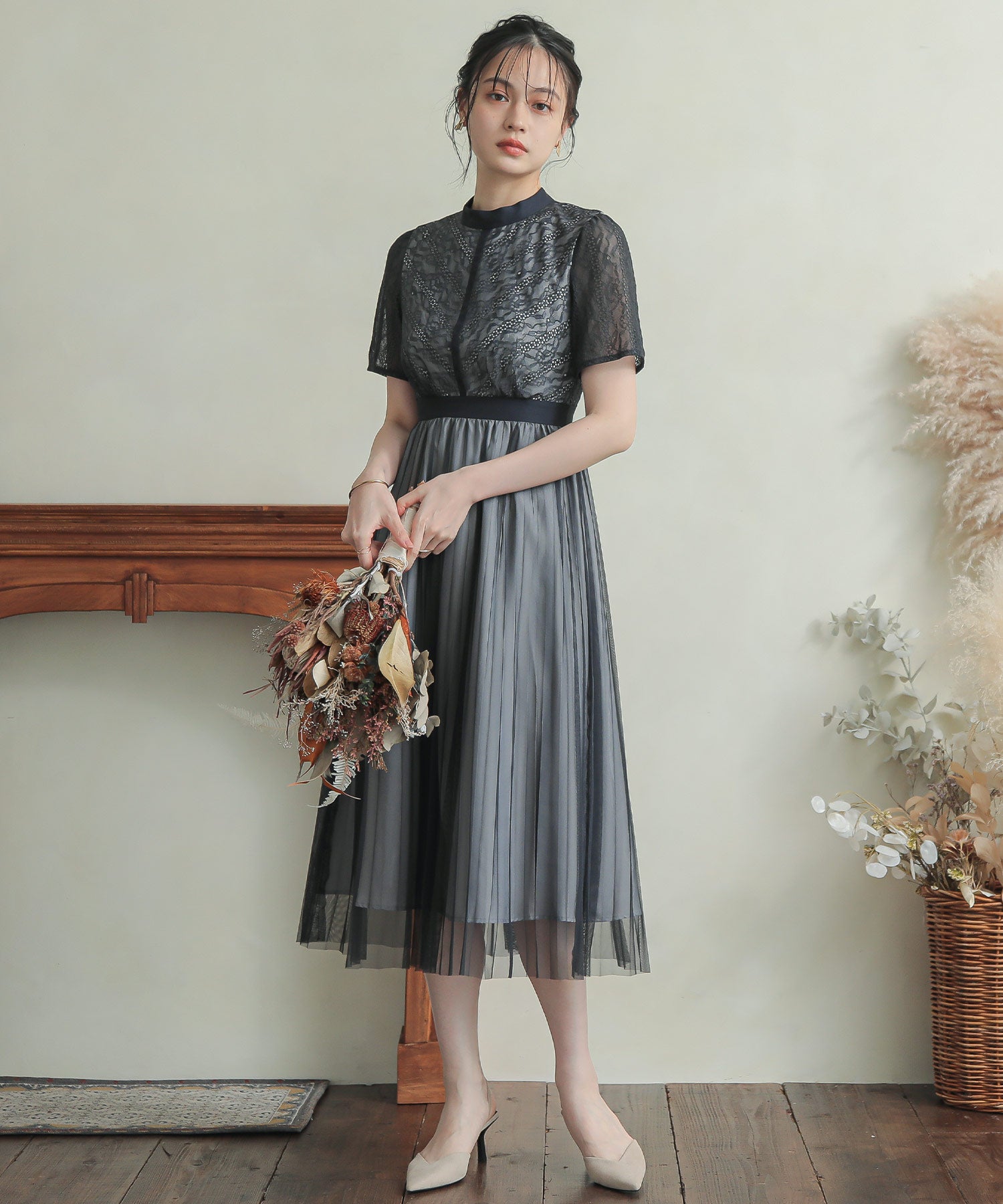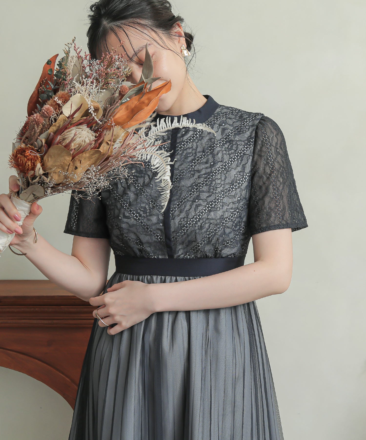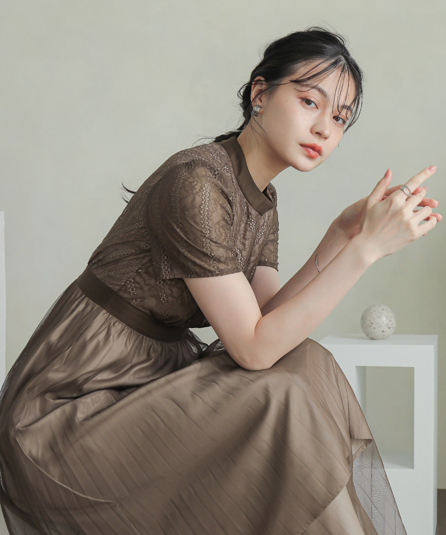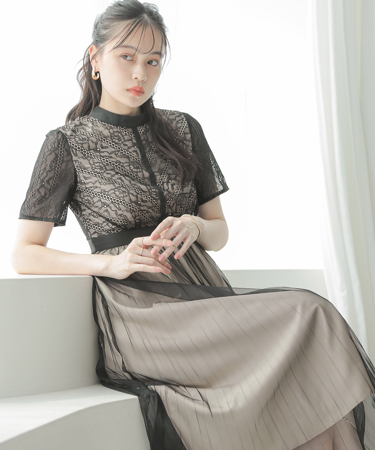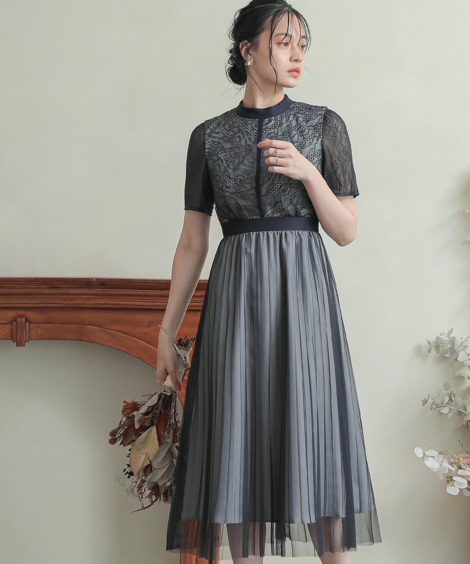 レースの透け感とチュールプリーツが上品なワンピースドレス。