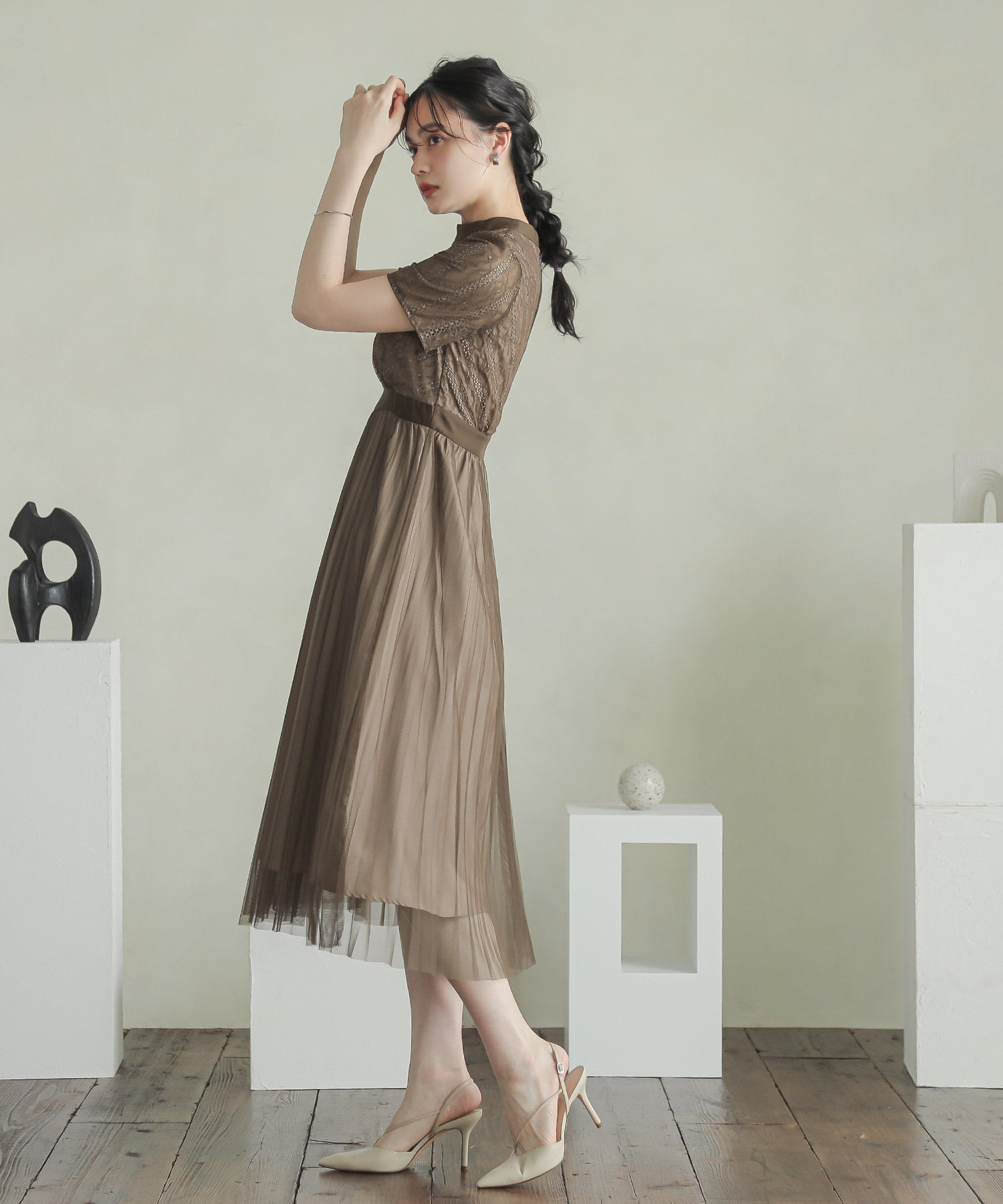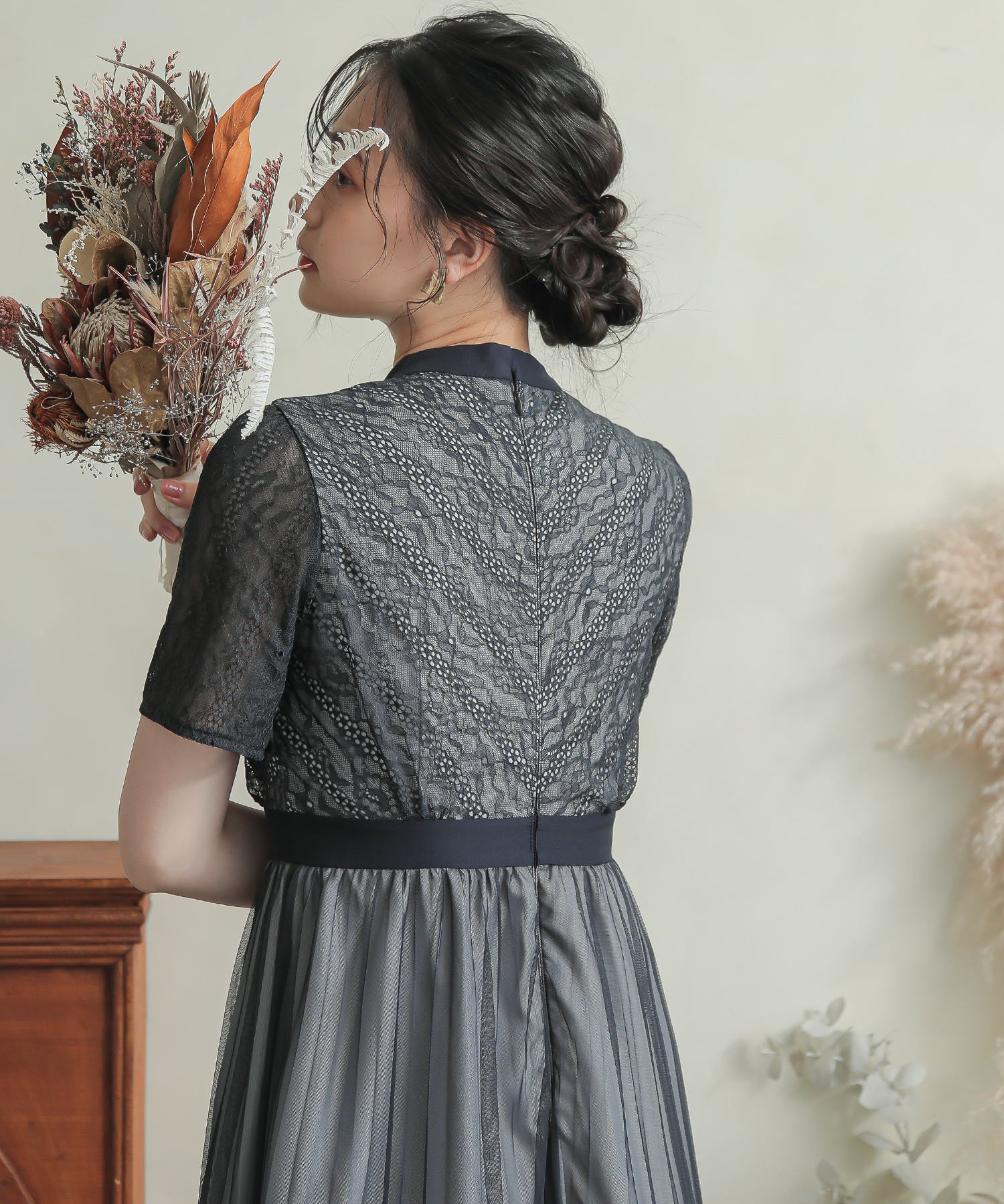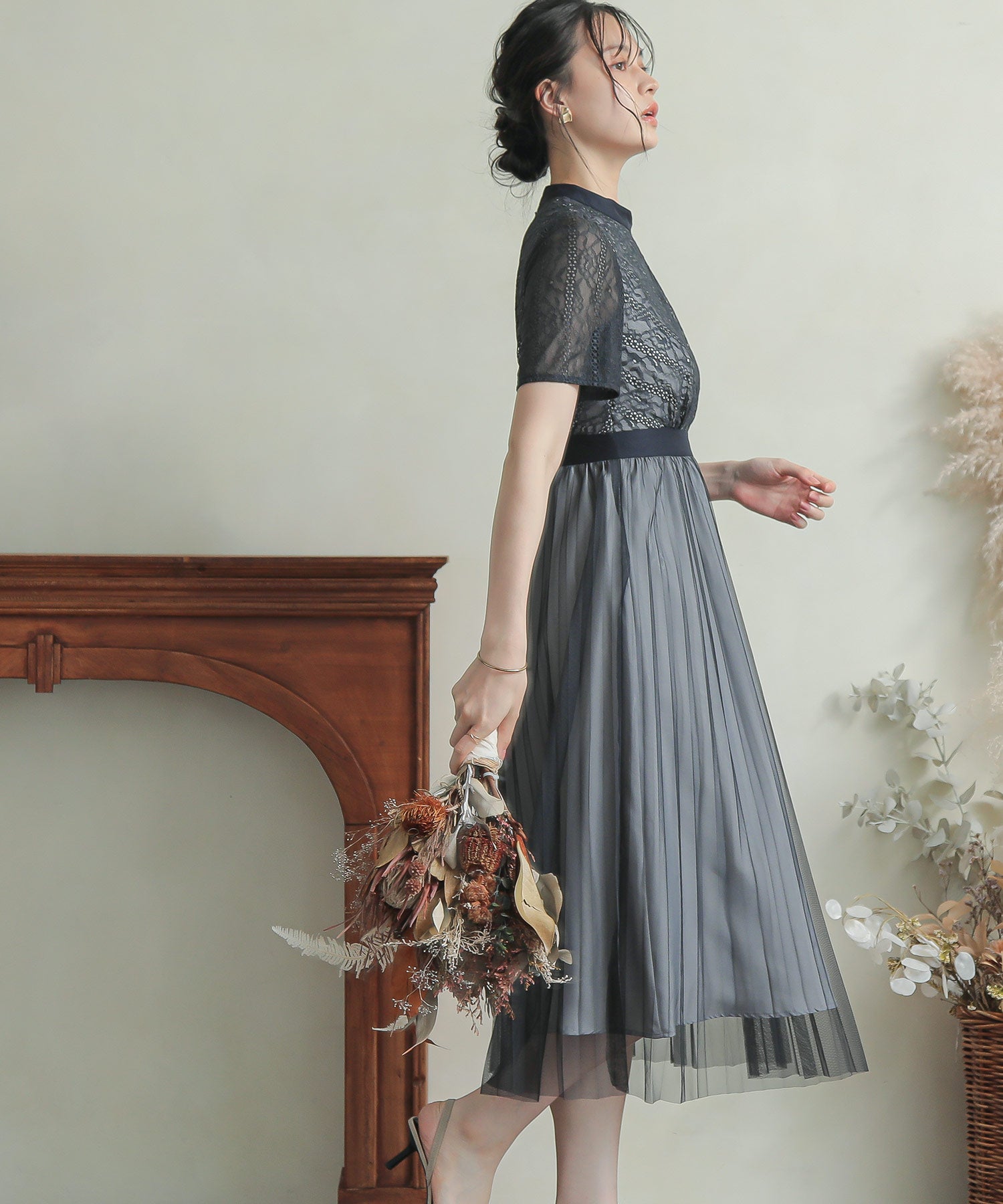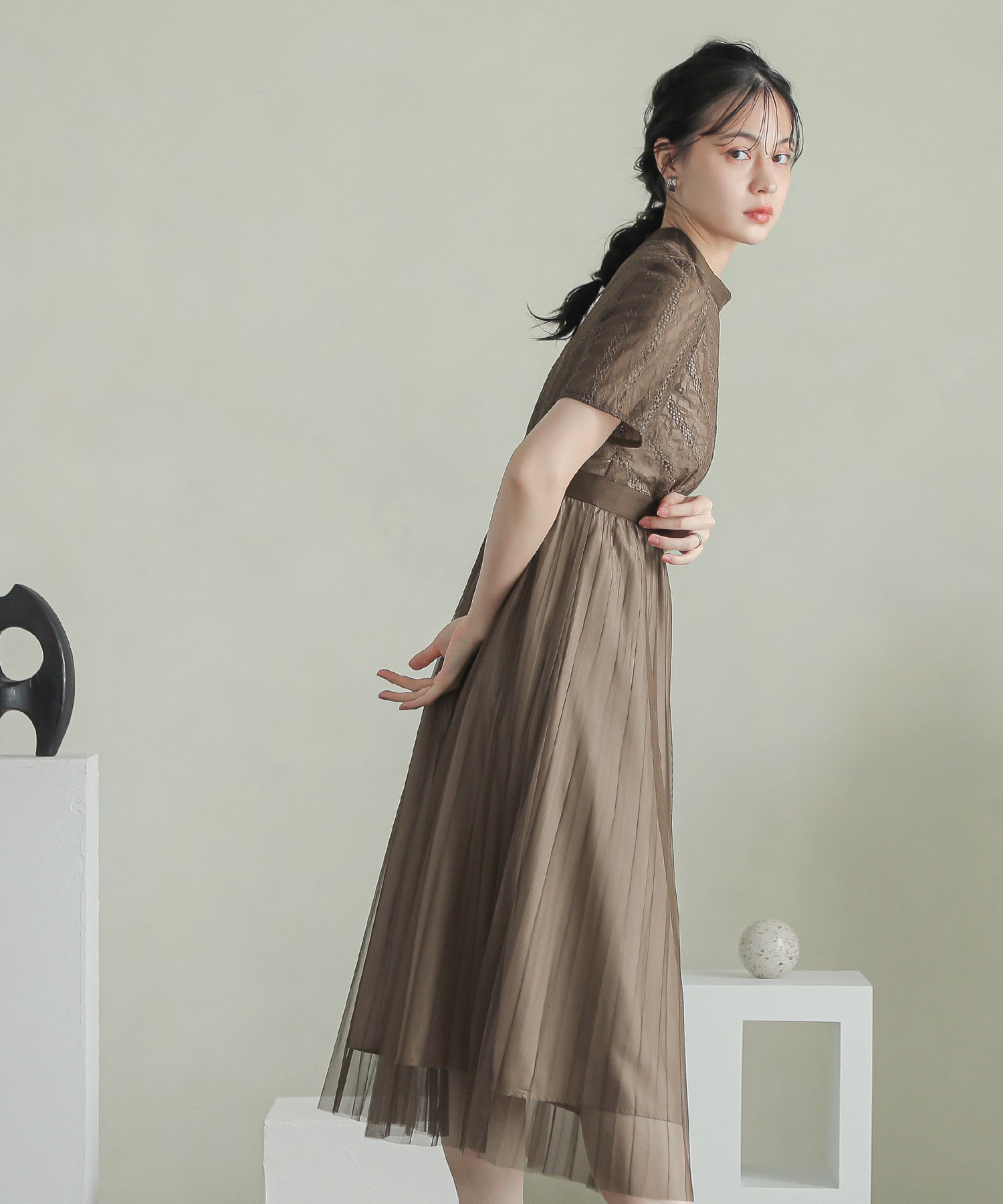 レースの透け感とチュールプリーツが上品なワンピースドレス。