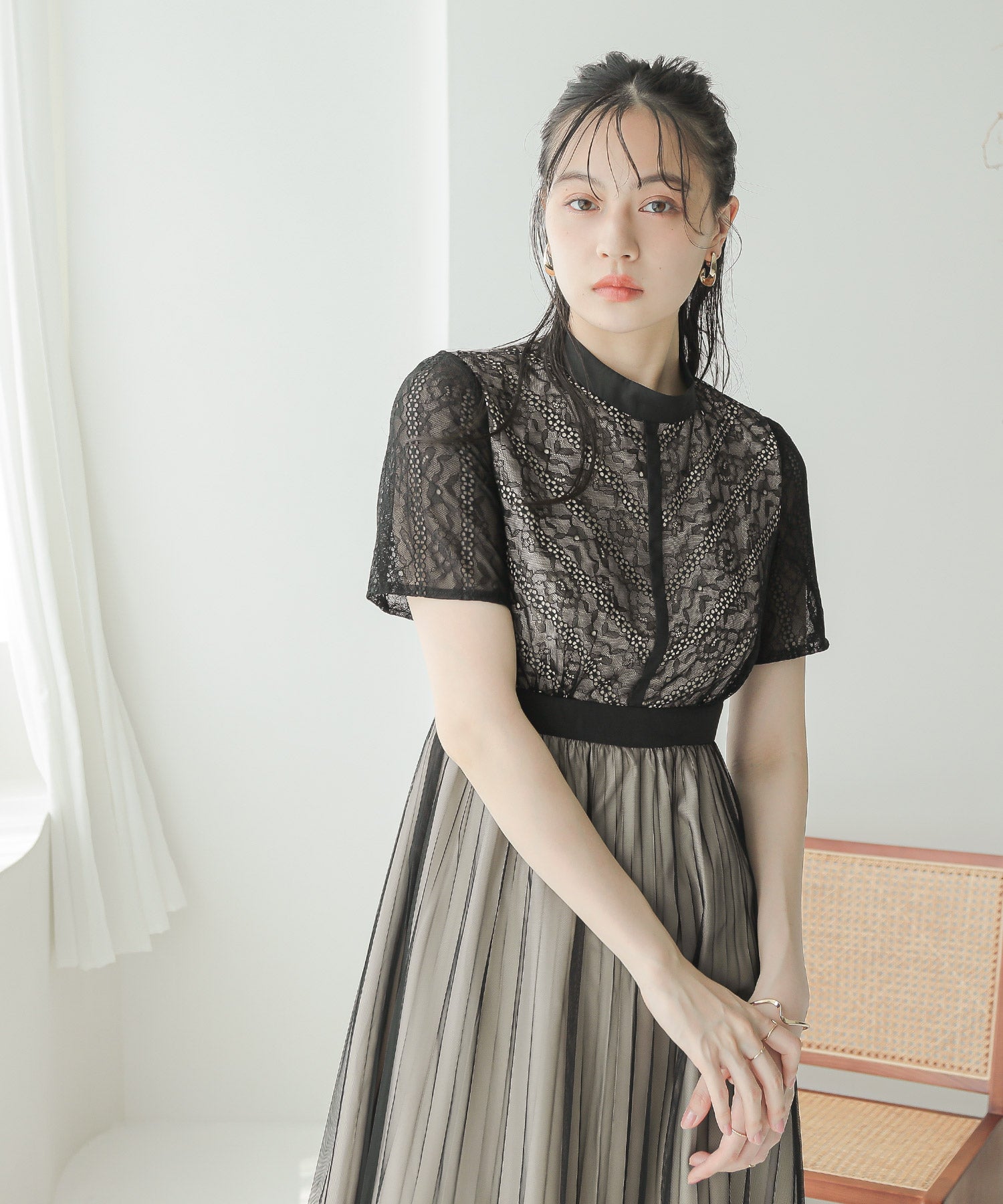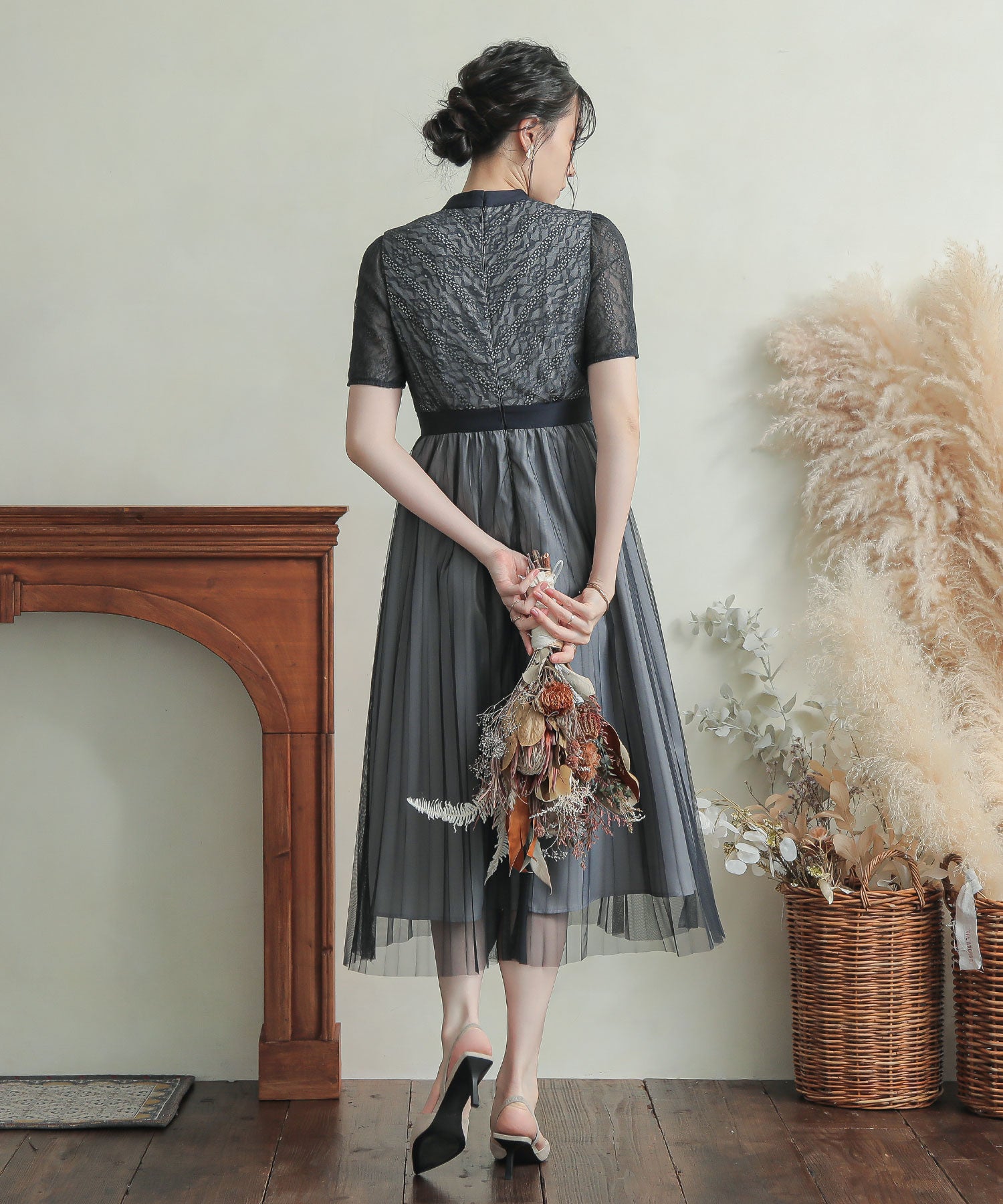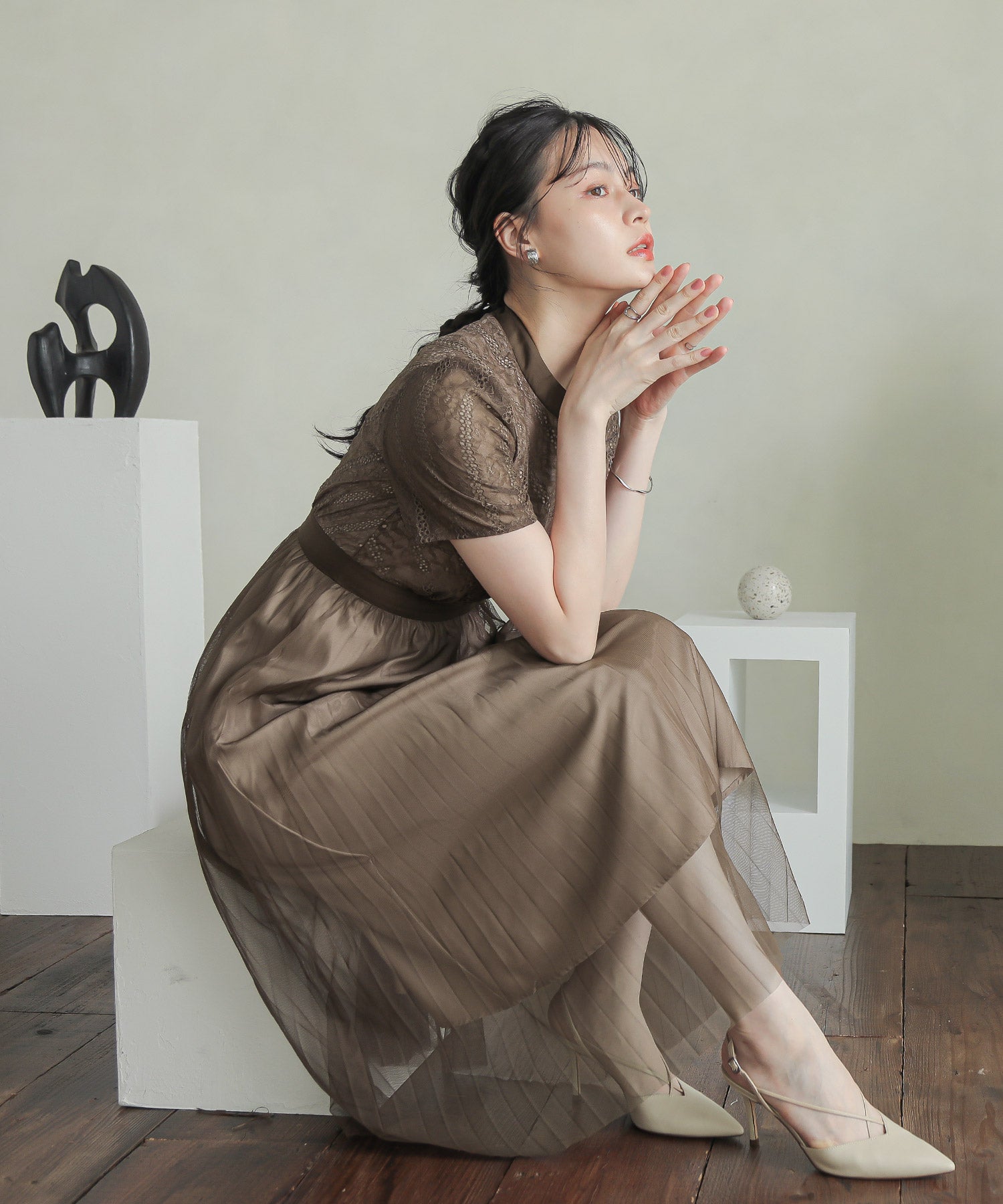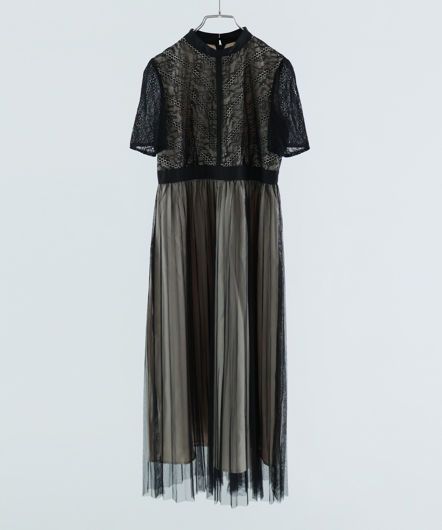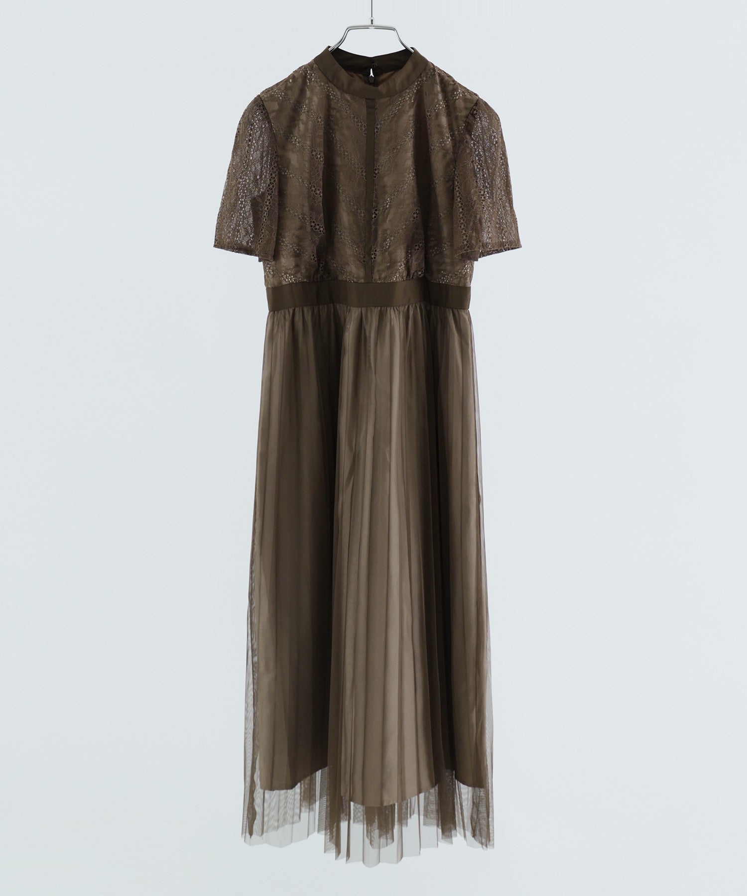 レースの透け感とチュールプリーツが上品なワンピースドレス。