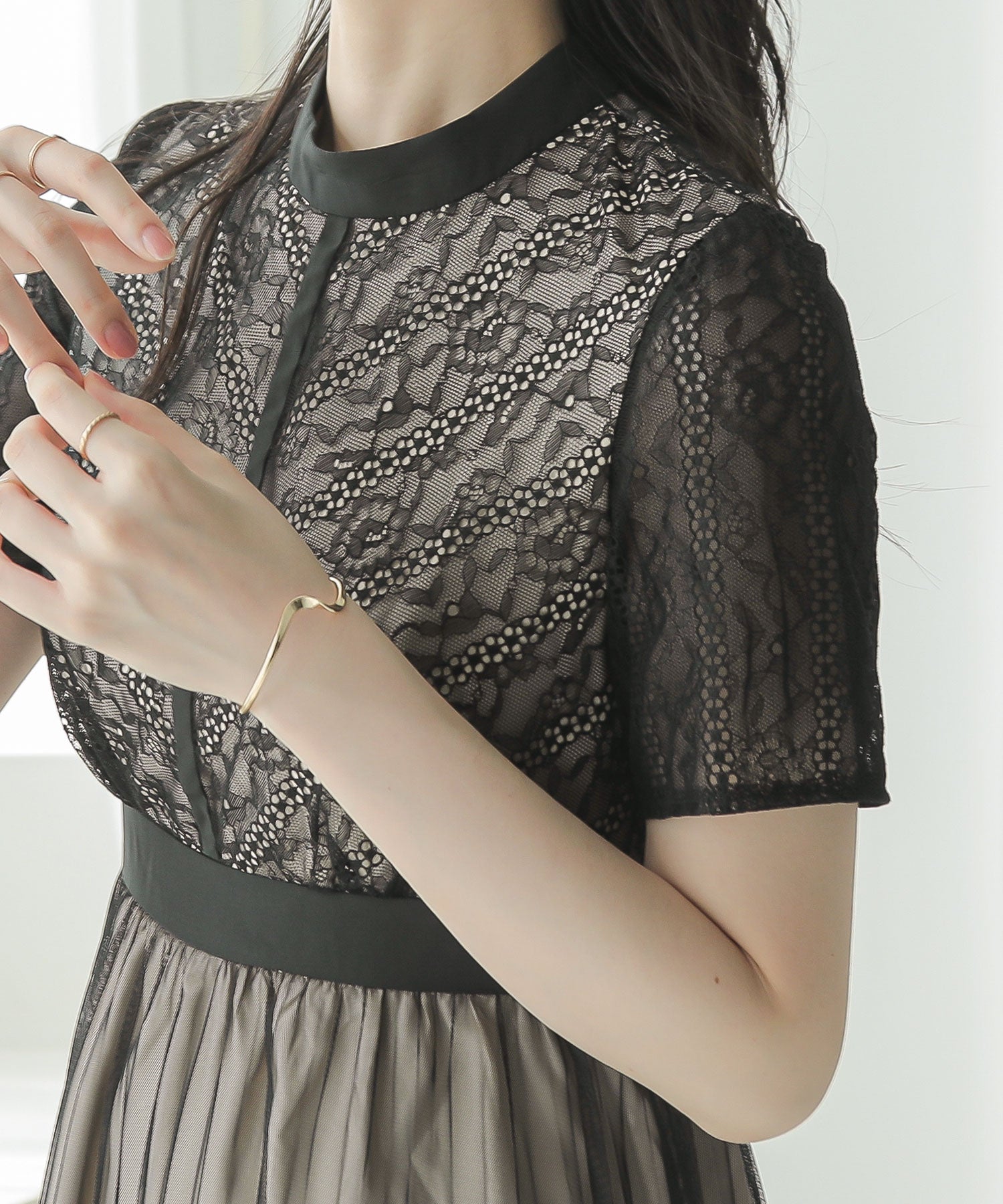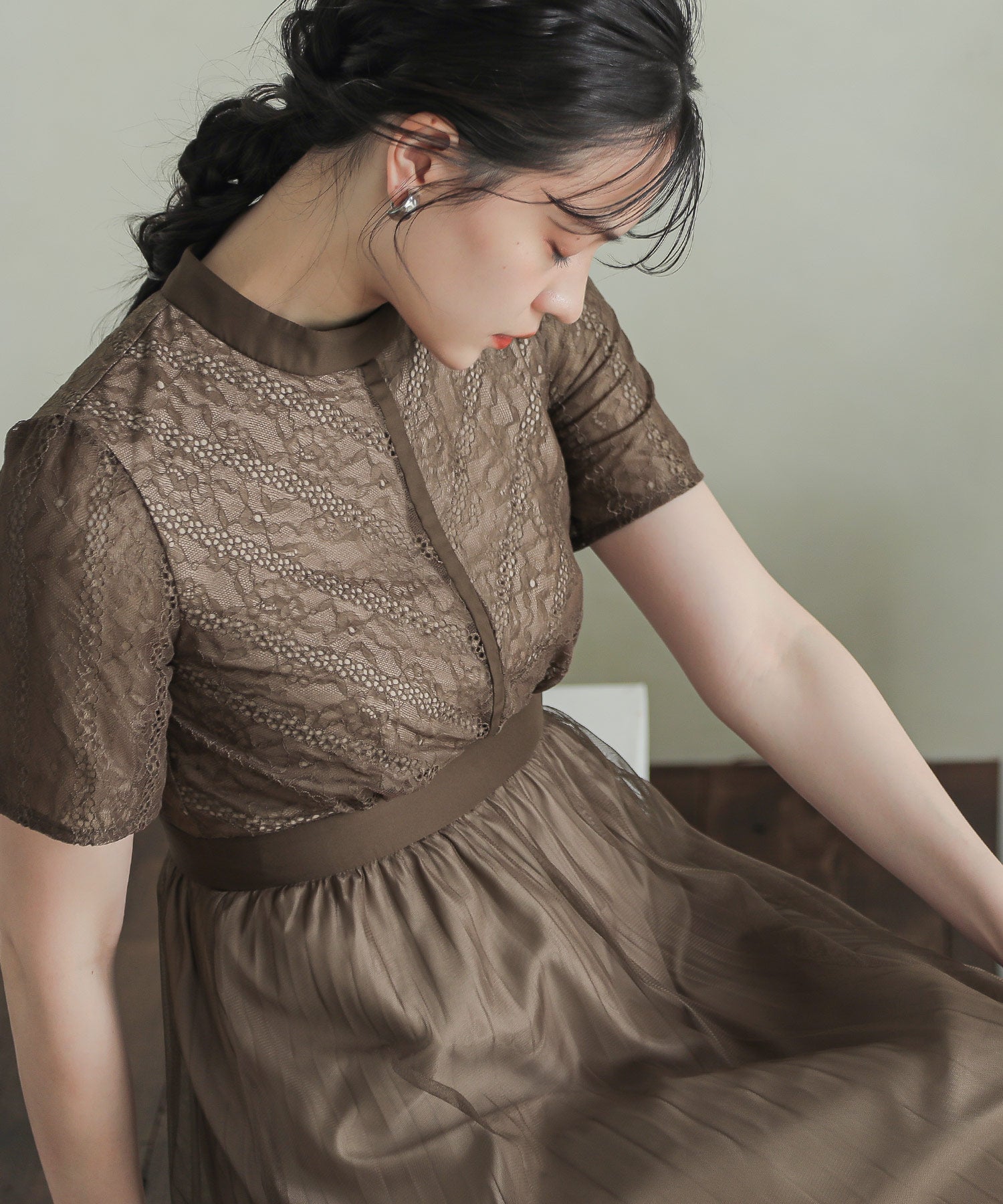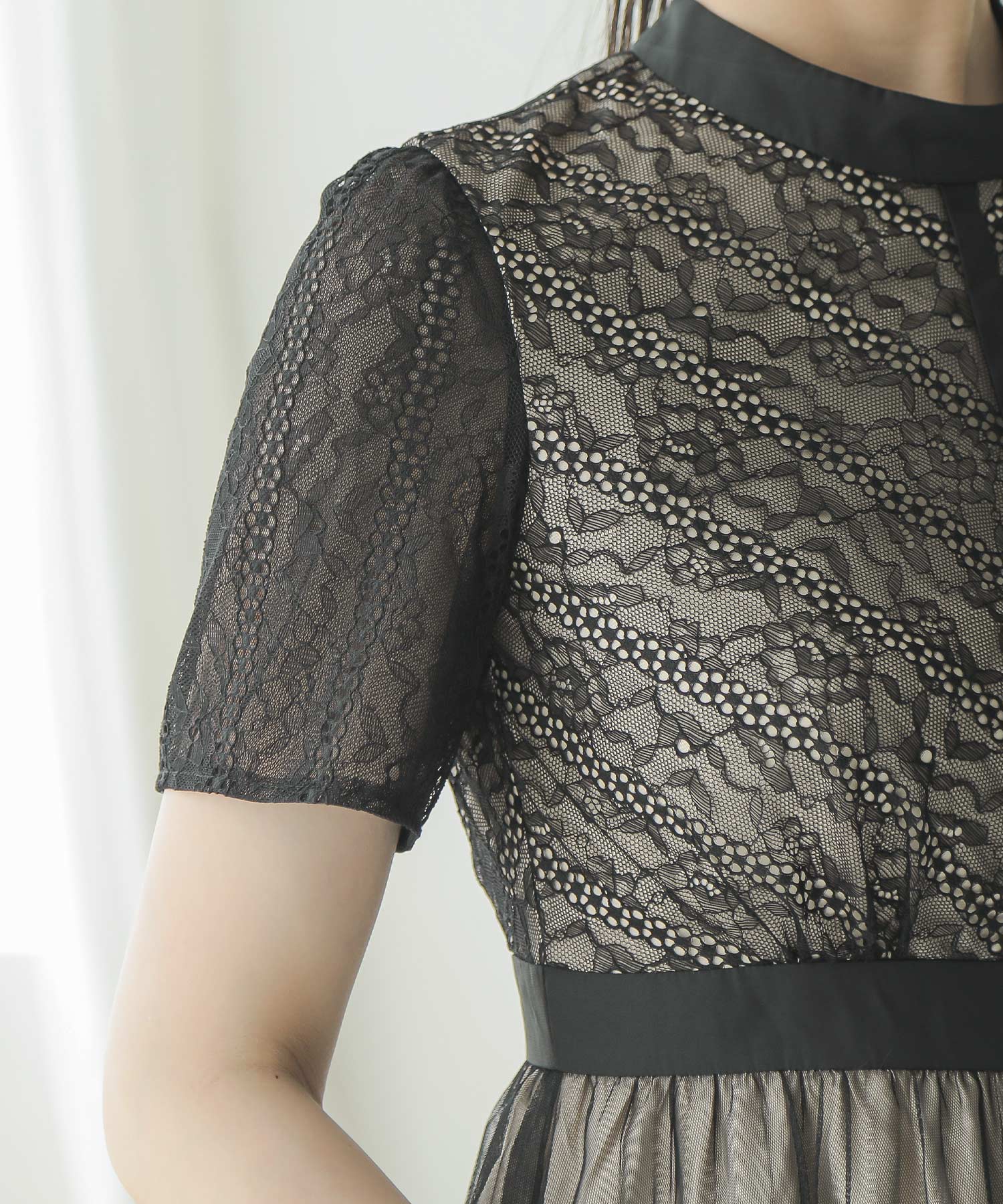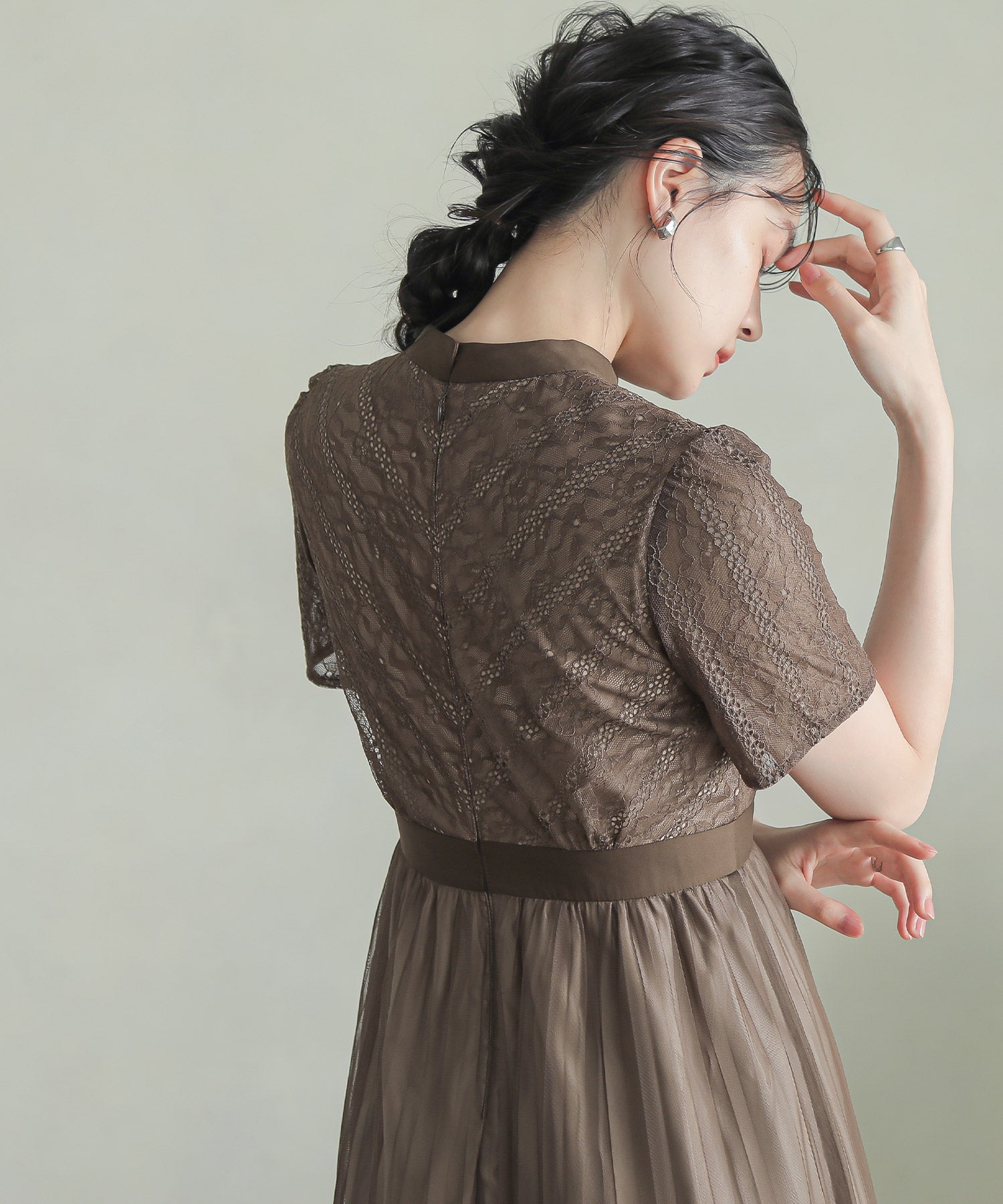 レースの透け感とチュールプリーツが上品なワンピースドレス。