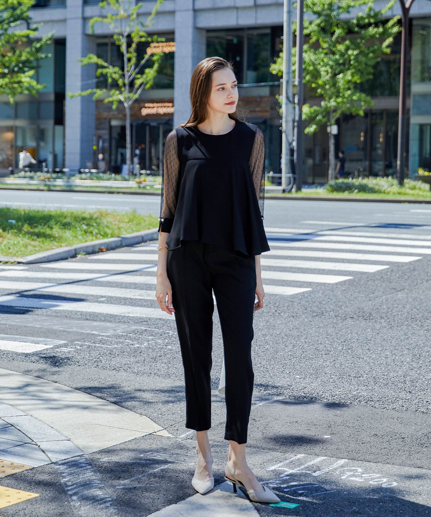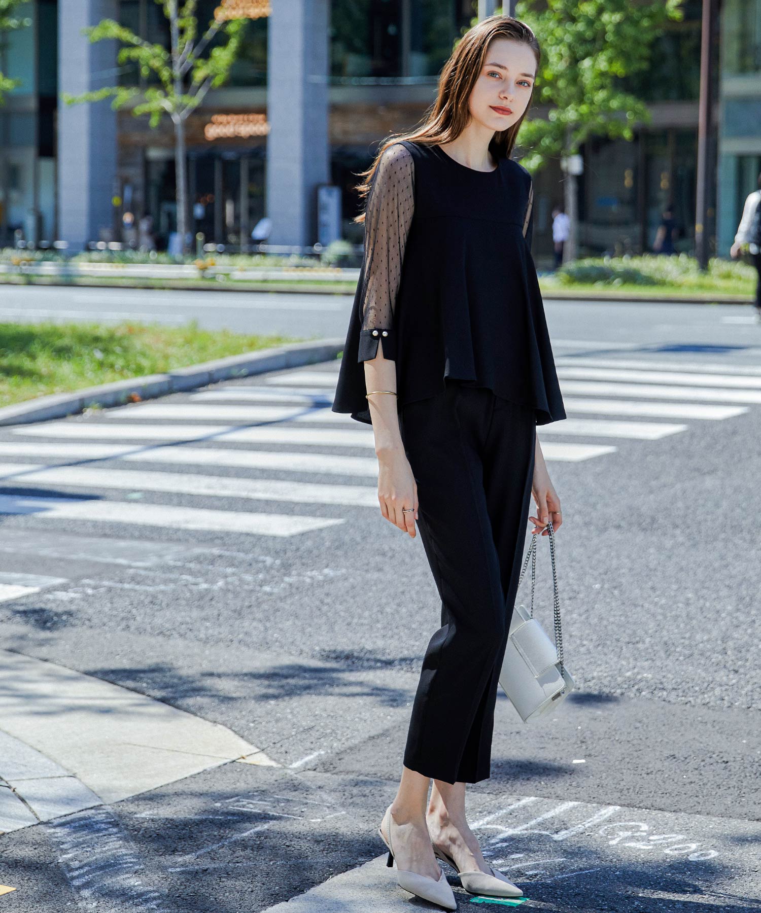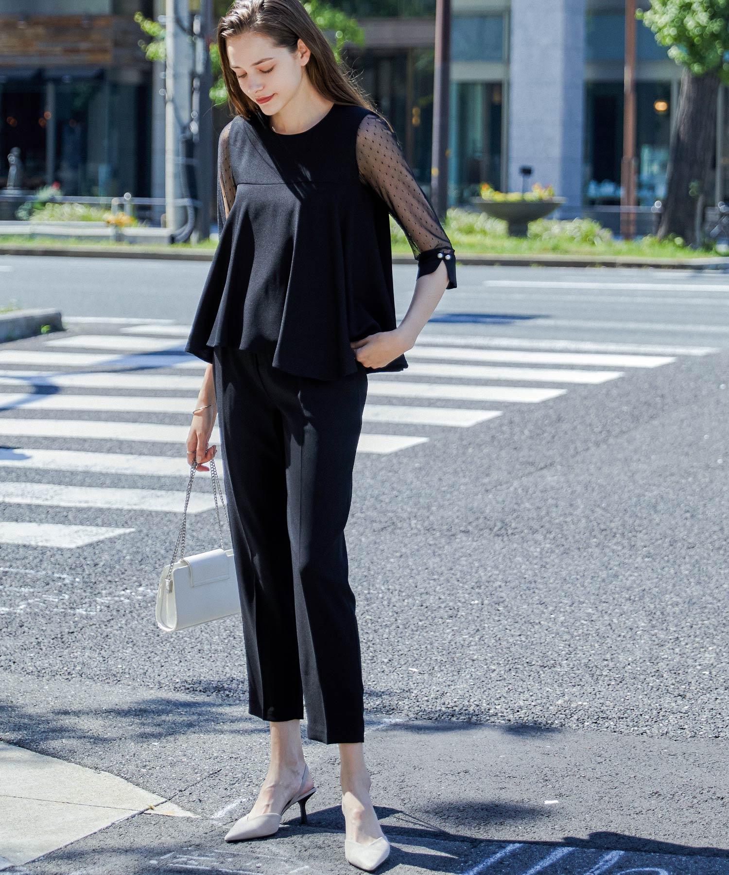 袖ドットチュールのデザインブラウスとテーパードパンツの