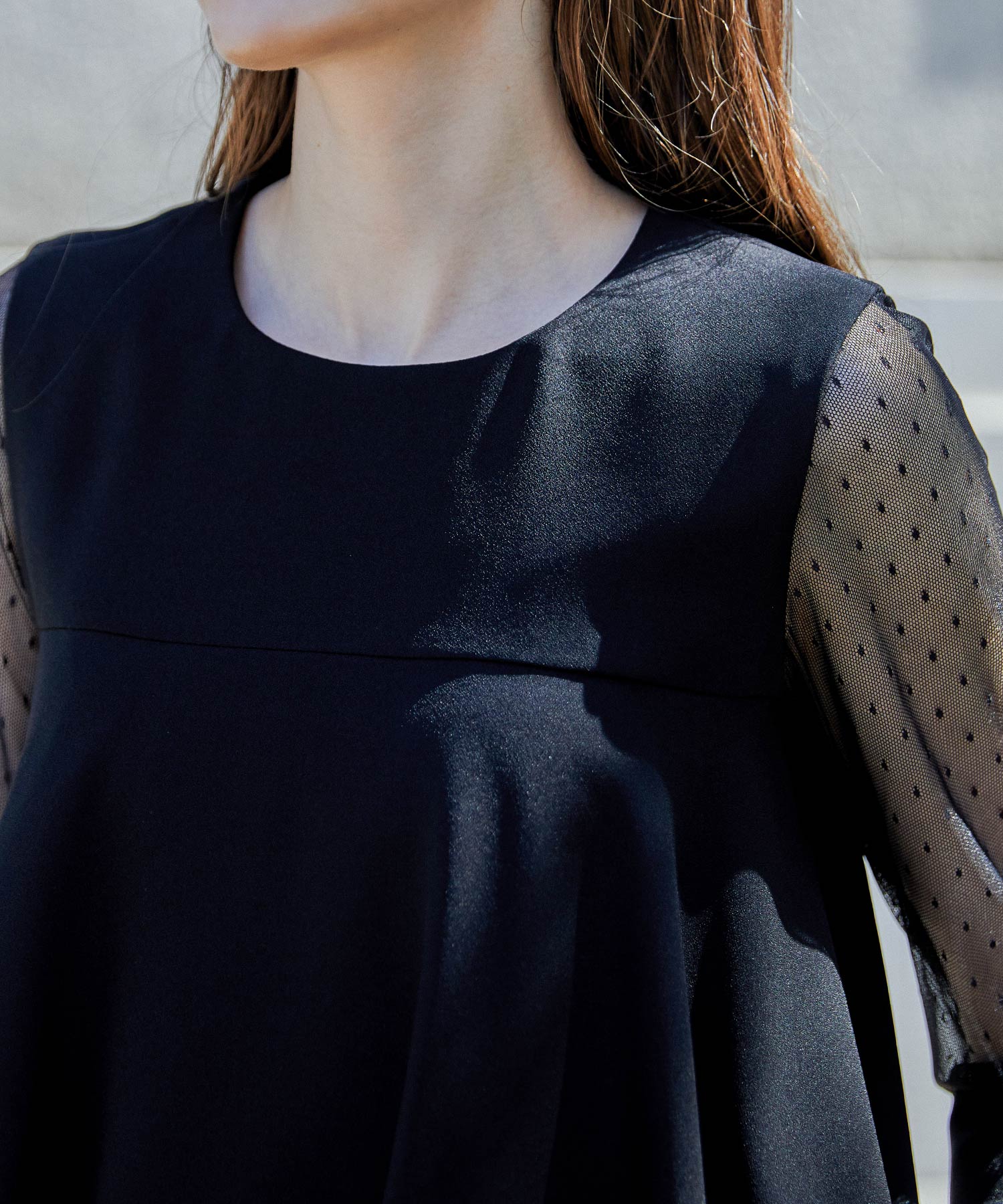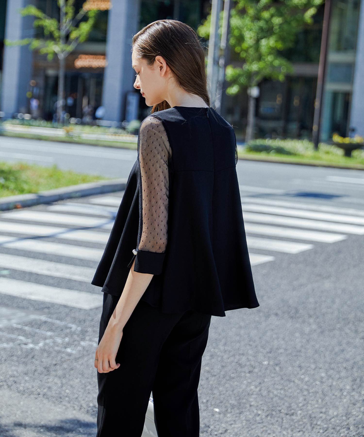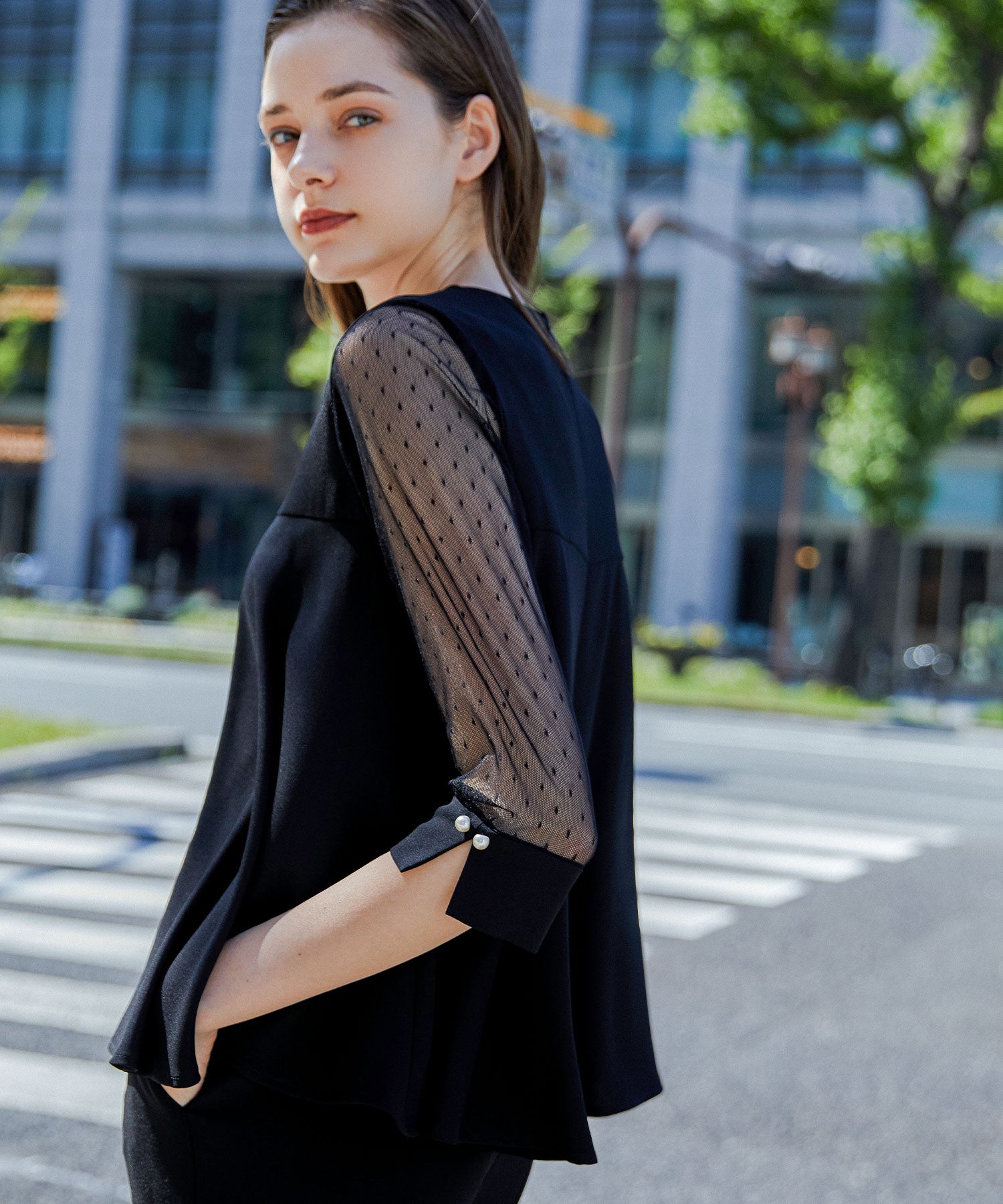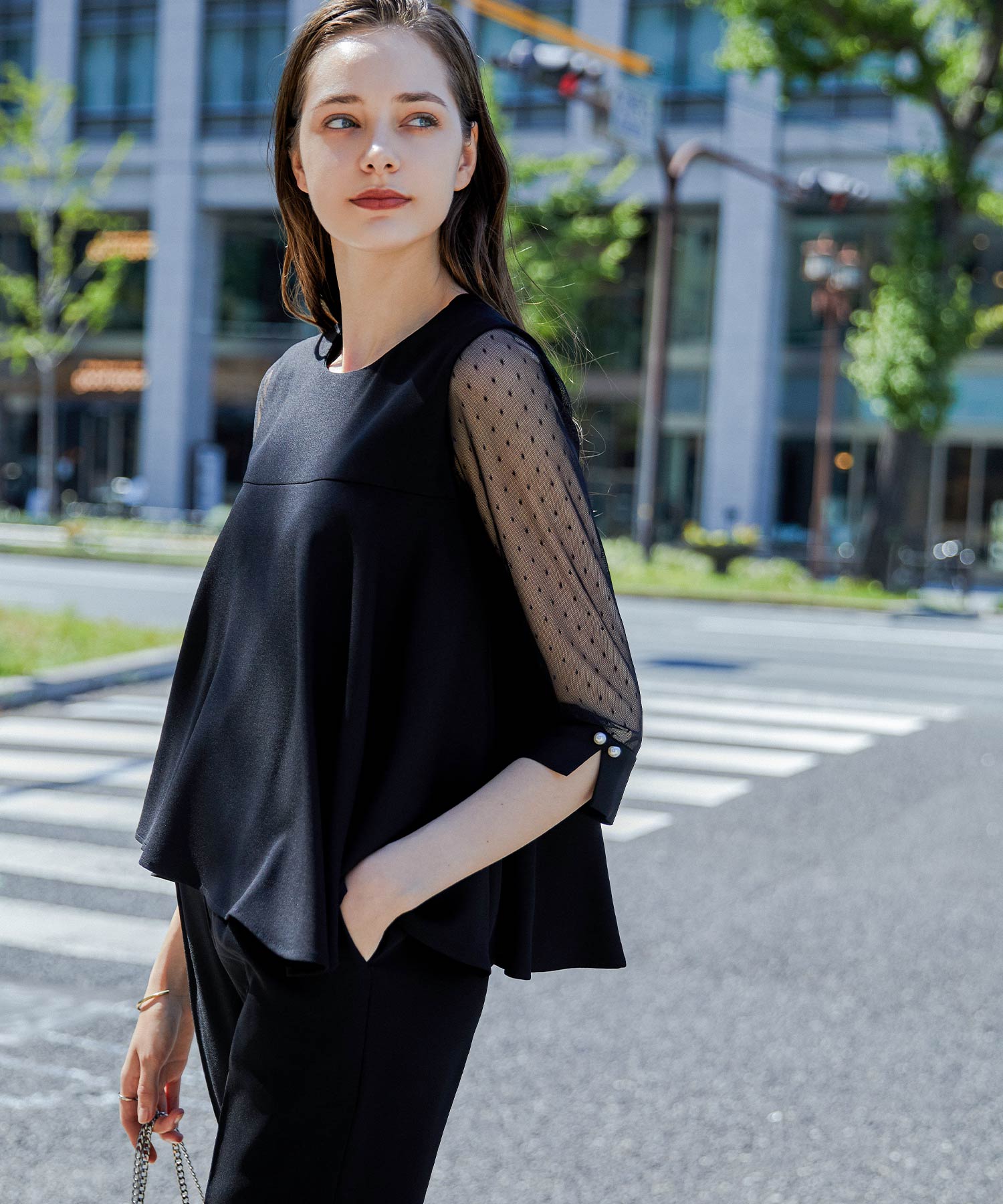 袖ドットチュールのデザインブラウスとテーパードパンツの