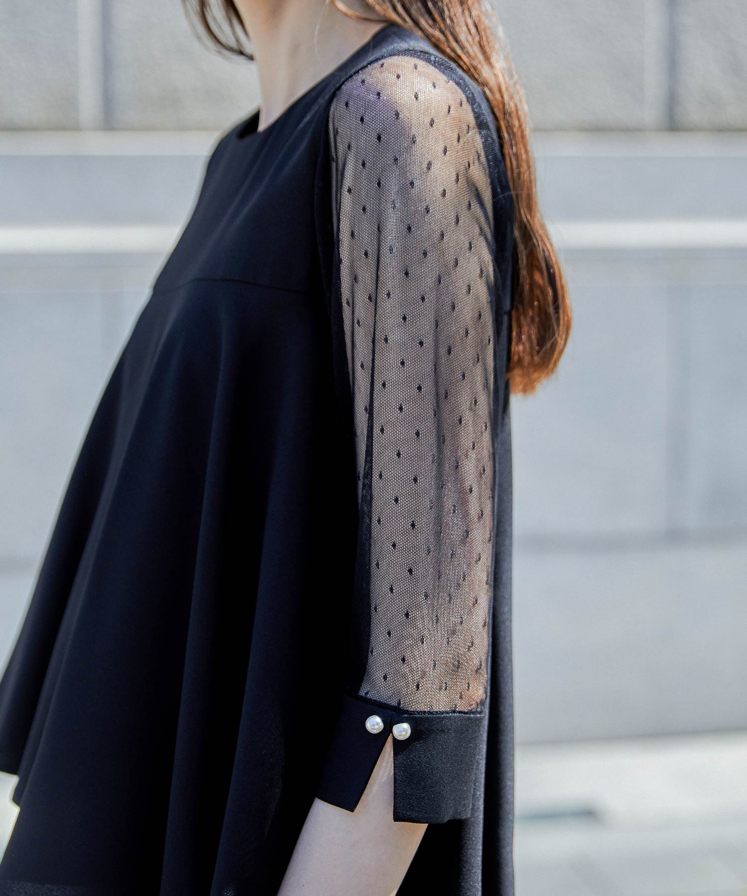 透け感のあるドットチュールに袖口のパール使いがエレガントな印象に。