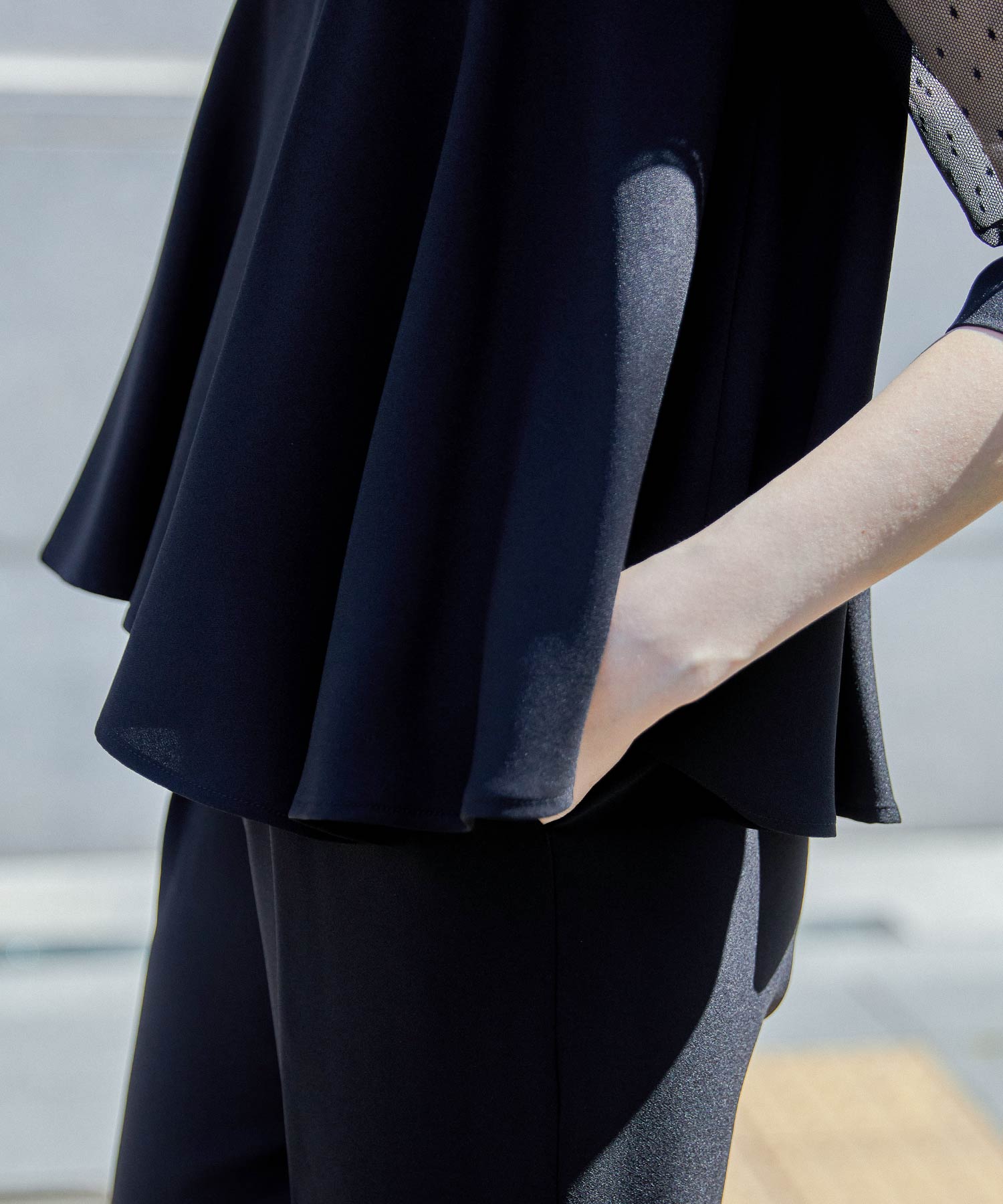 ブラウスは、ふわりと揺れるアシンメトリーなフレアラインが自然にウエストやヒップをカバー。