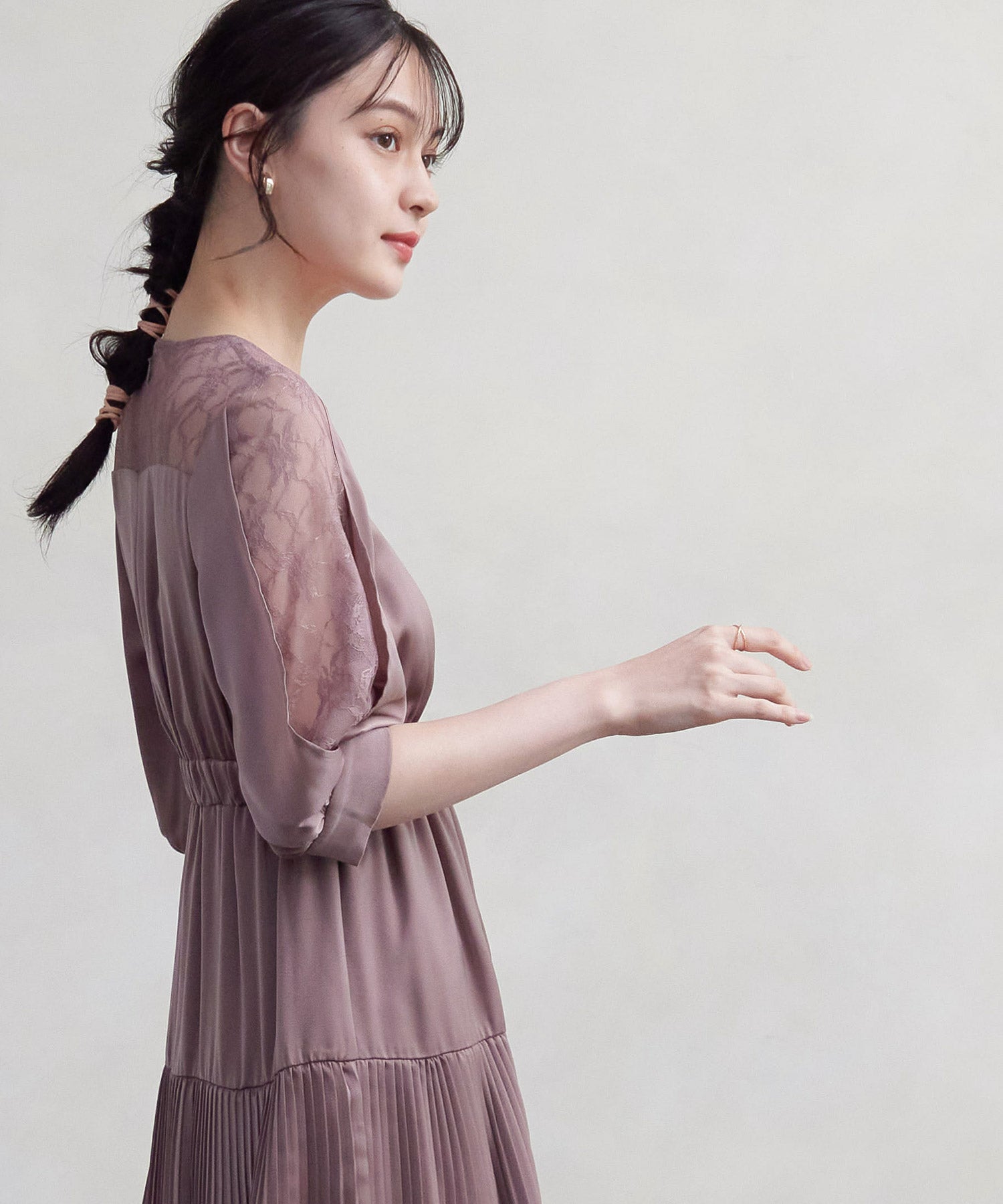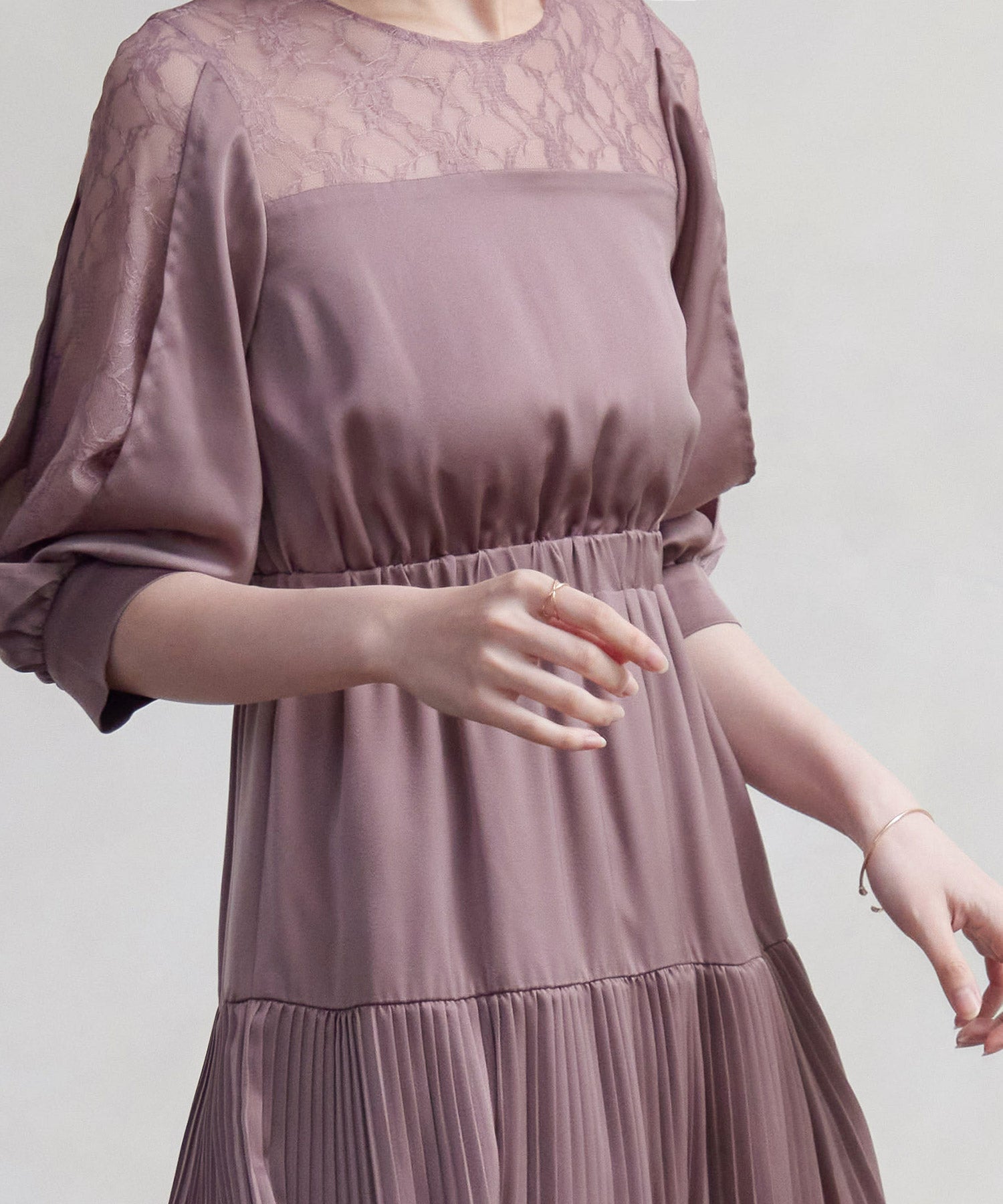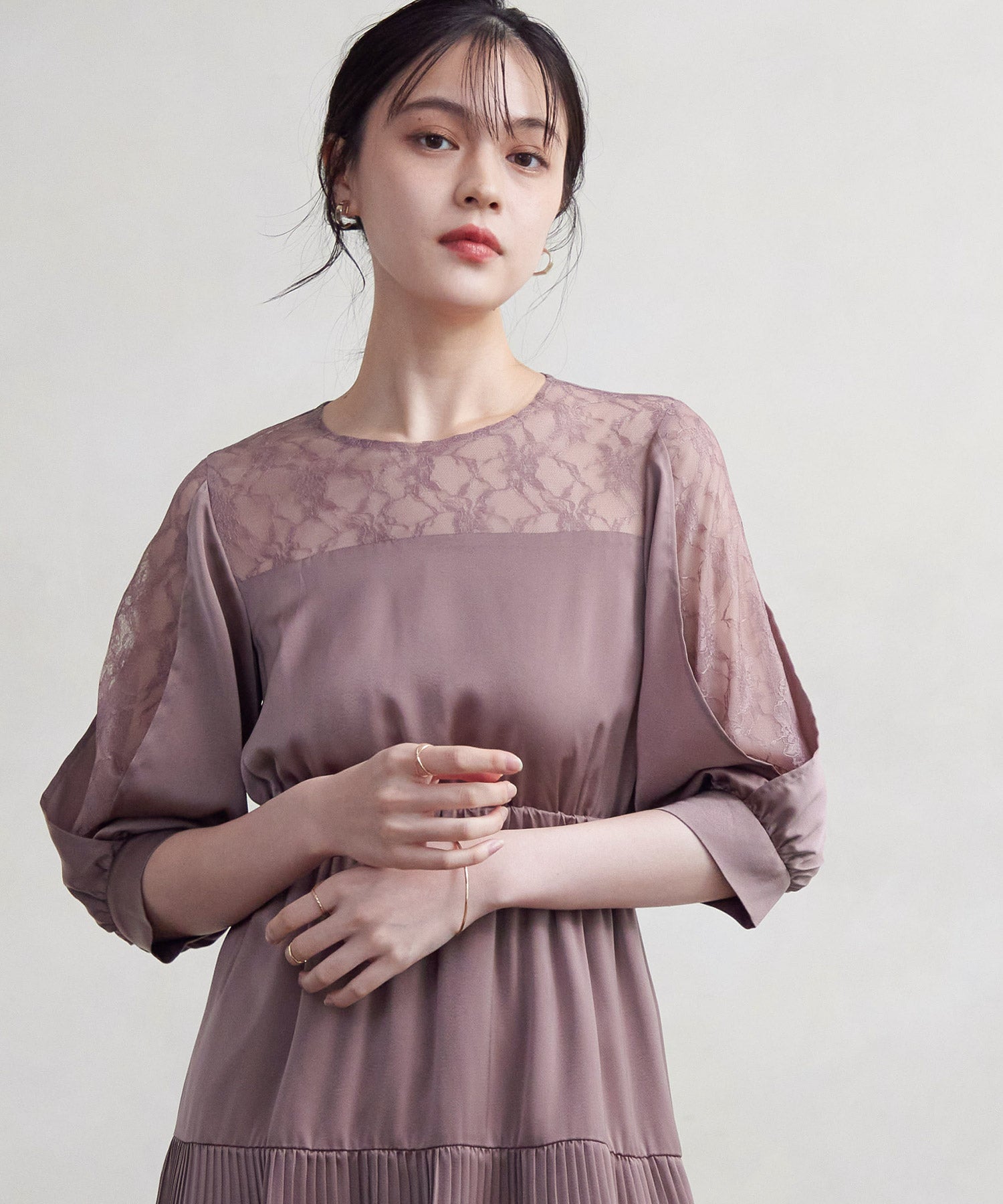 デコルテライン、袖のスリットからのぞくレース素材を組み合わせた、女性らしいワンピースドレス。