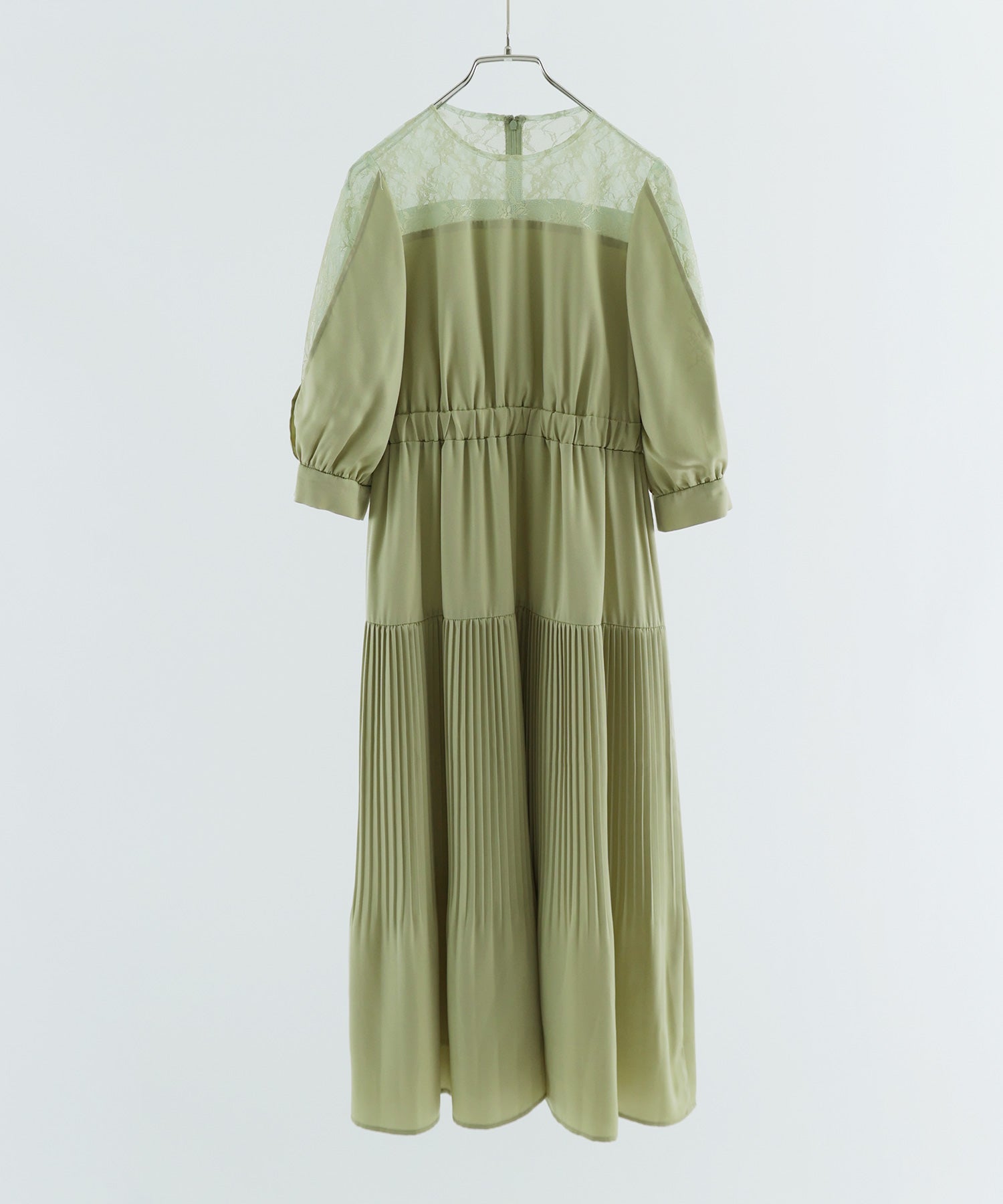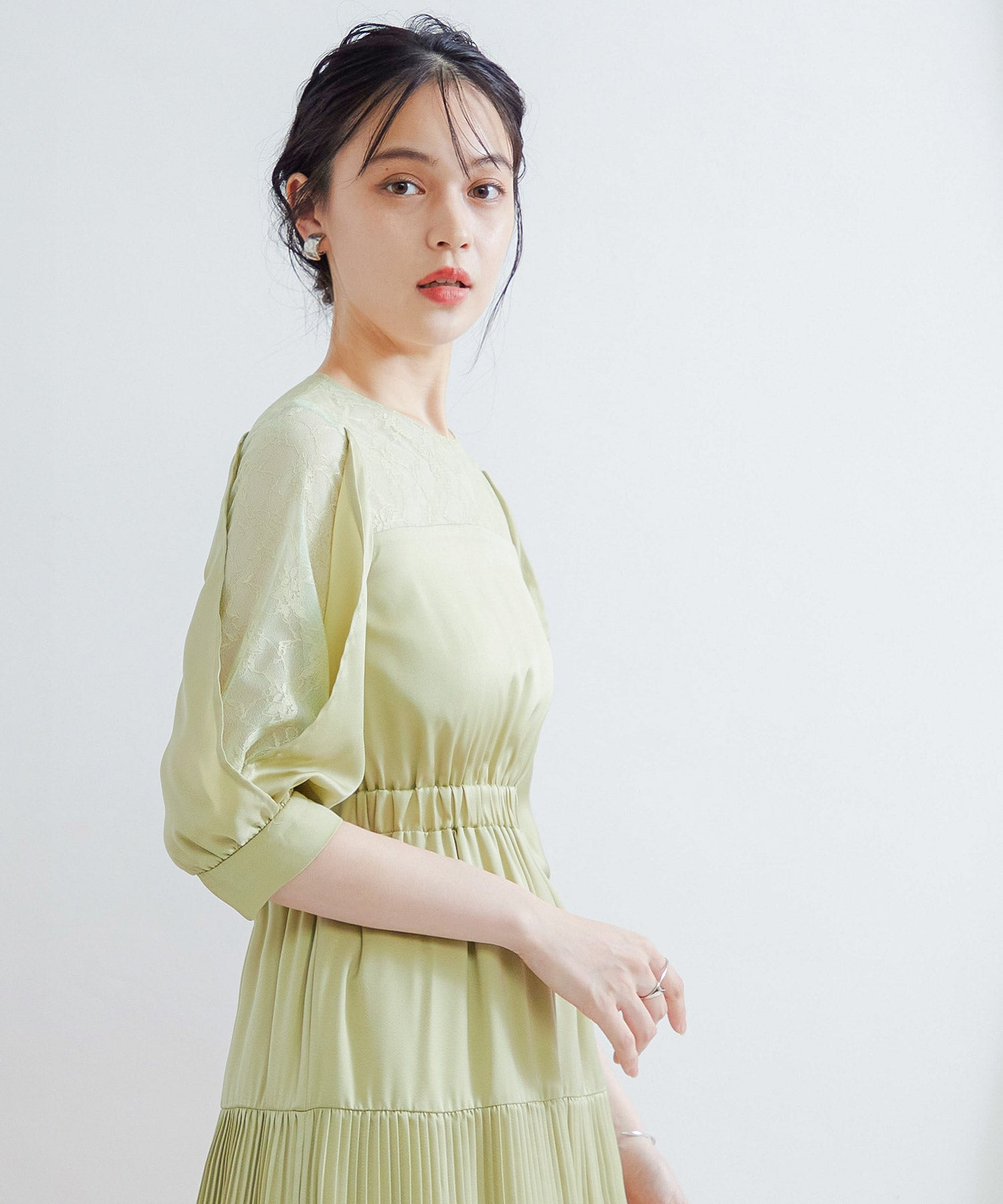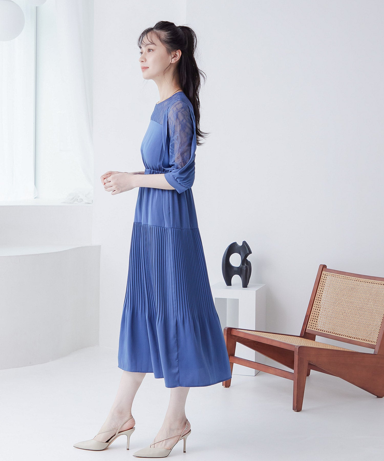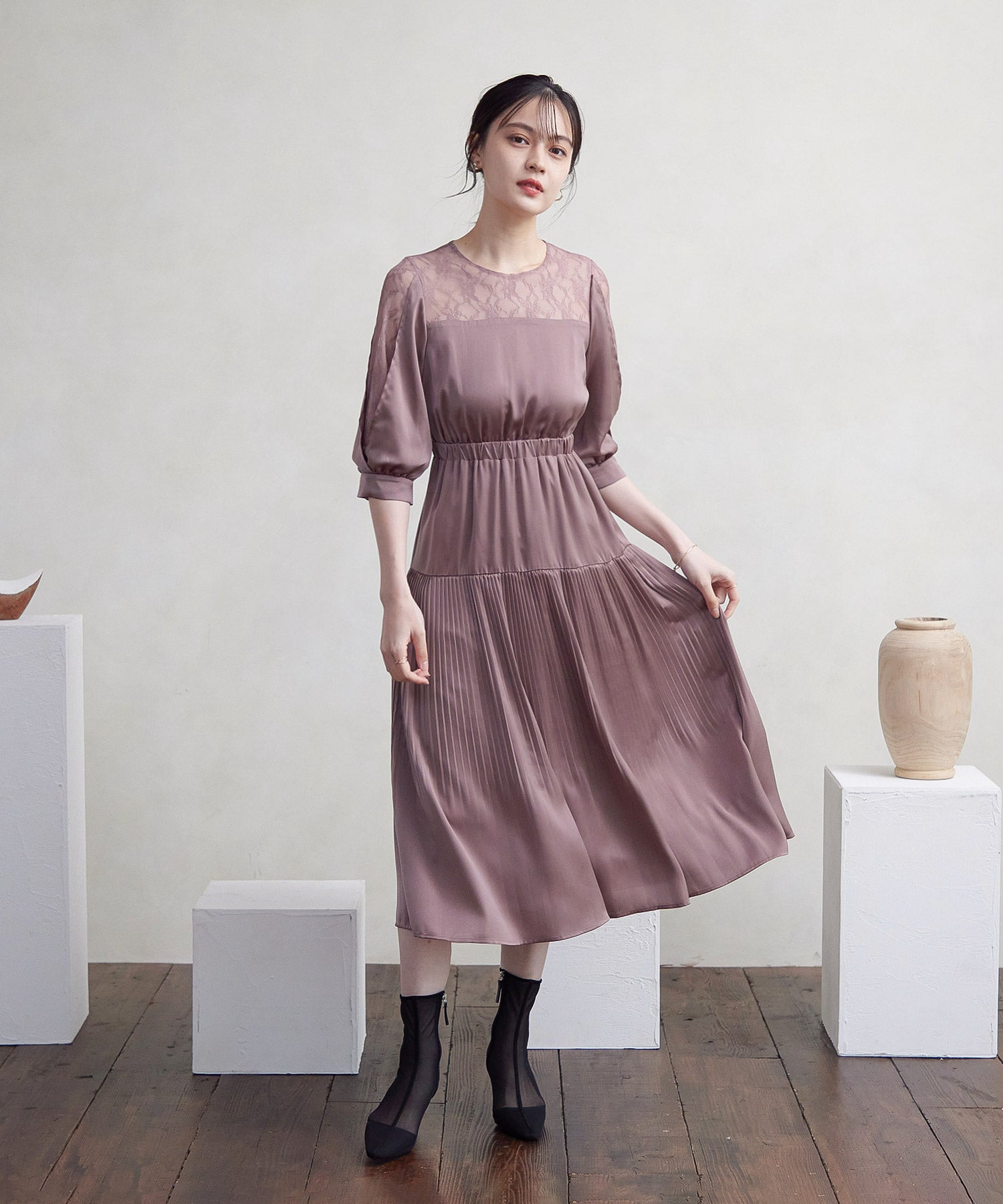 デコルテライン、袖のスリットからのぞくレース素材を組み合わせた、女性らしいワンピースドレス。
