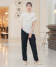 シンプルながらラインが美しく、後ろウエストゴムでストレスフリーな履き心地。