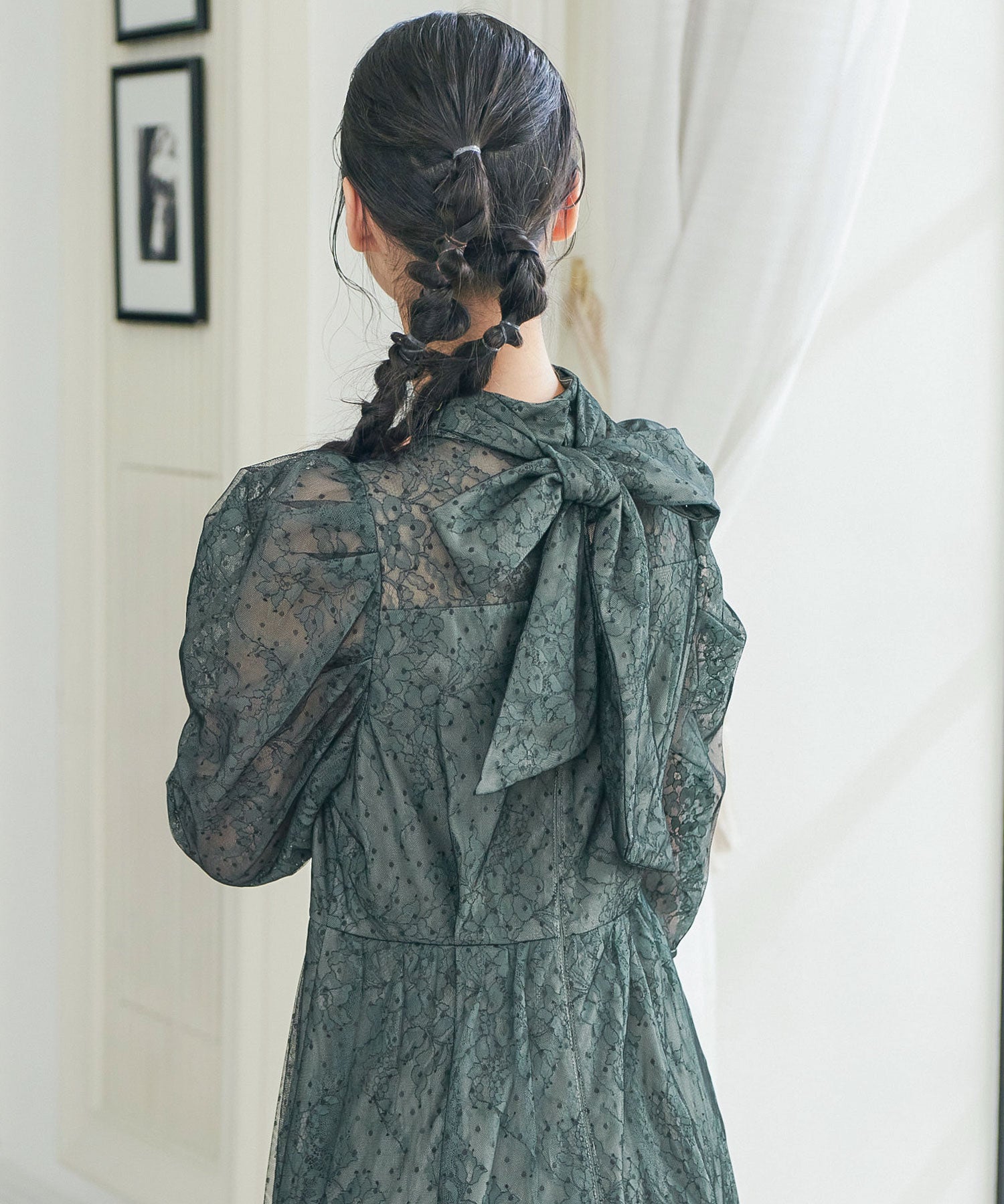 スタンドネックのリボンは前後2wayで結べる仕様になっており、