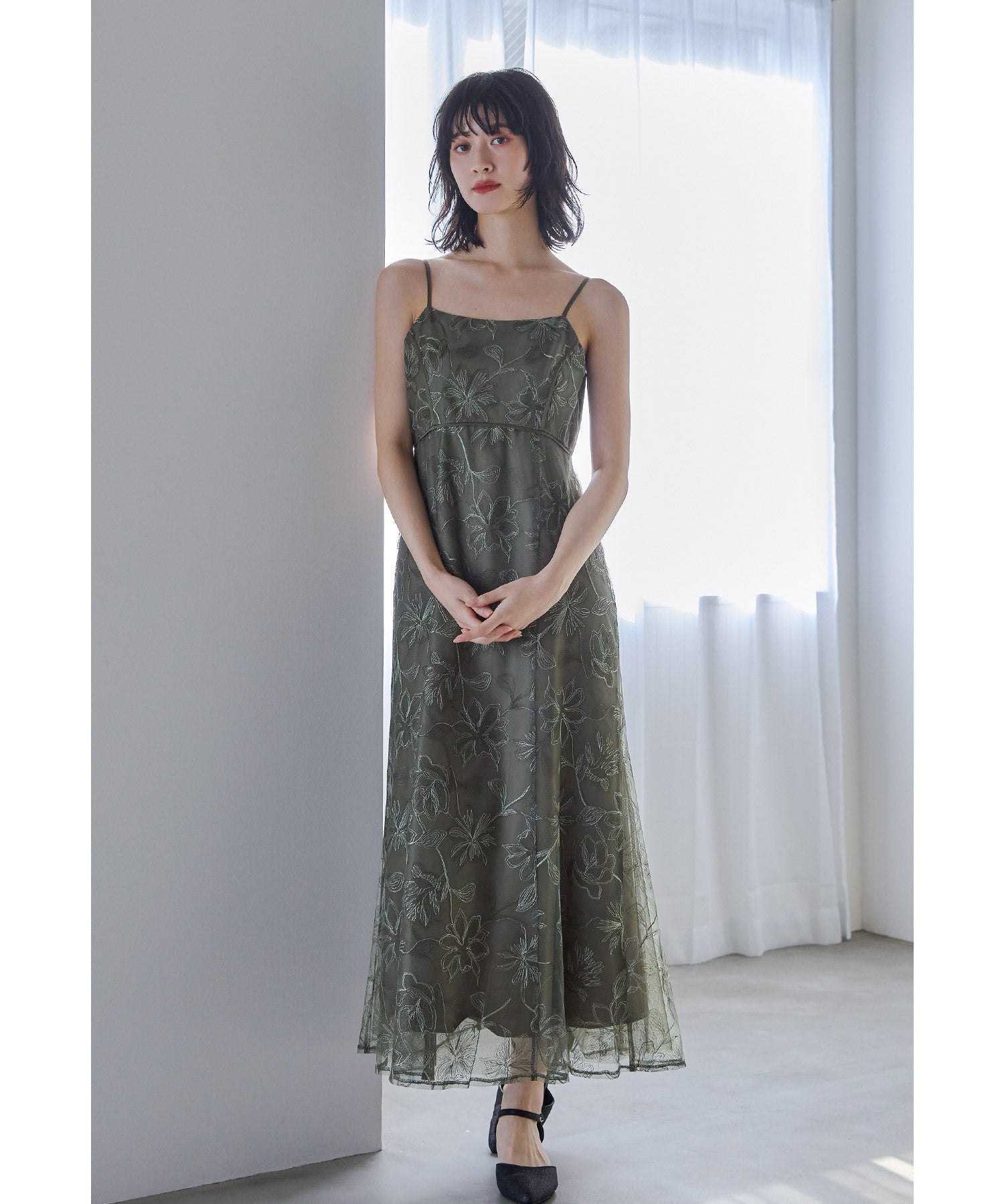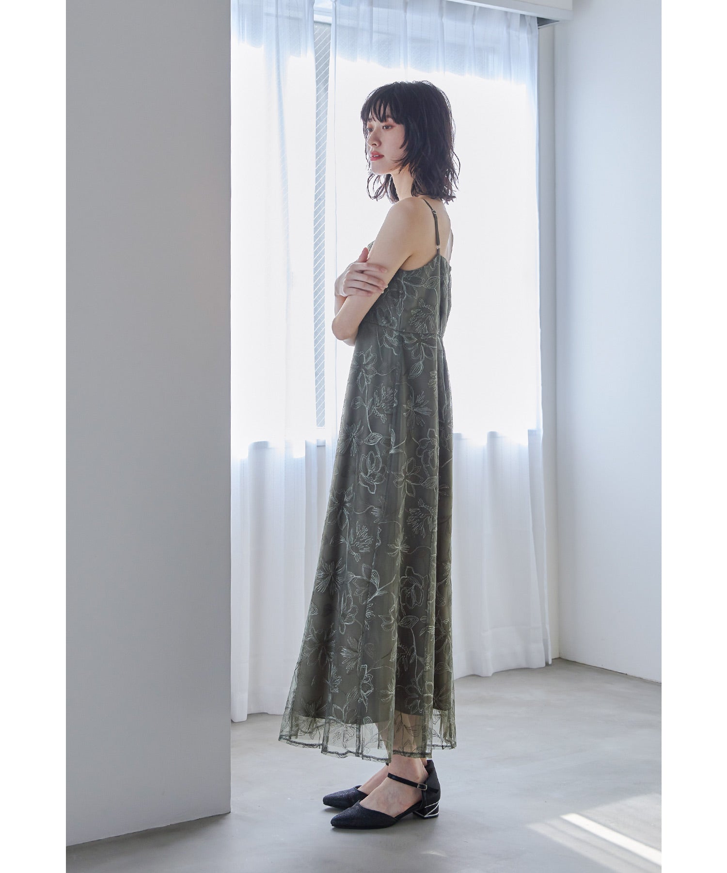 キャミワンピースは身体のラインを拾いすぎない、ゆるやかなフレアシルエットに。