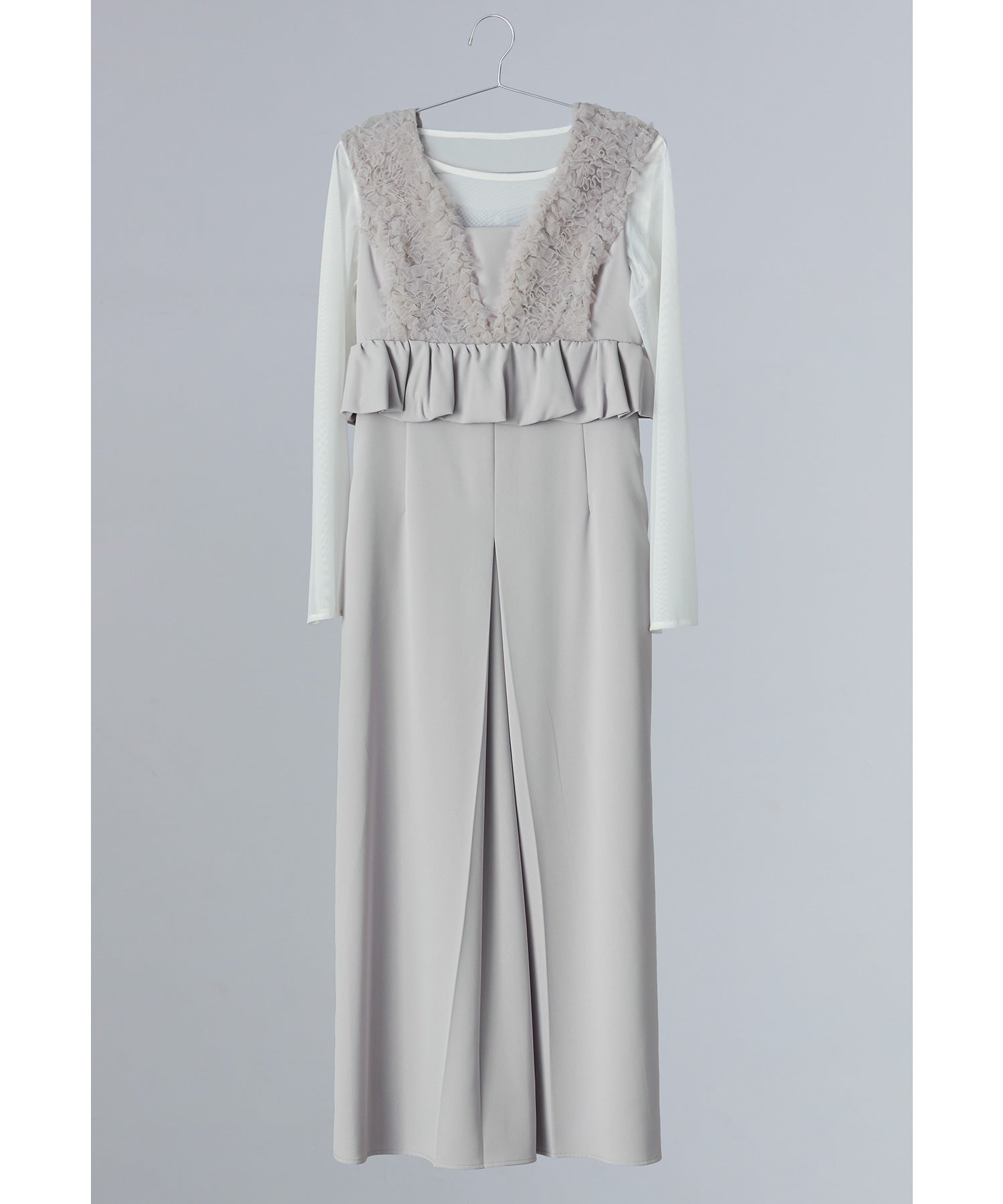 Rname チュールフリルペプラムドレス パーティードレス 結婚式 ワンピース Vネック Iライン シアー ブラウス 2点セット 長袖 ロング丈 お呼ばれ パーティー 二次会 披露宴 謝恩会 成人式 同窓会 入学式 卒業式 フォーマル オケージョンドレス 春 夏 秋 冬 S M L 黒 グレー ベージュ