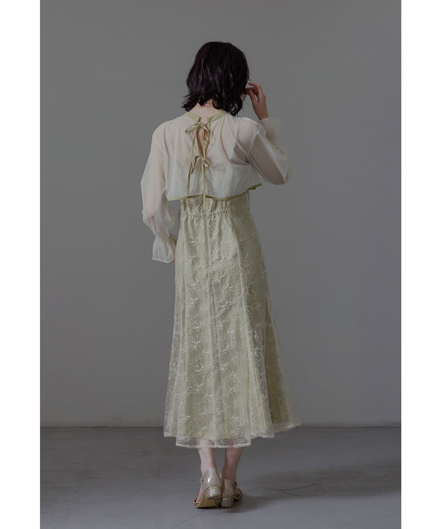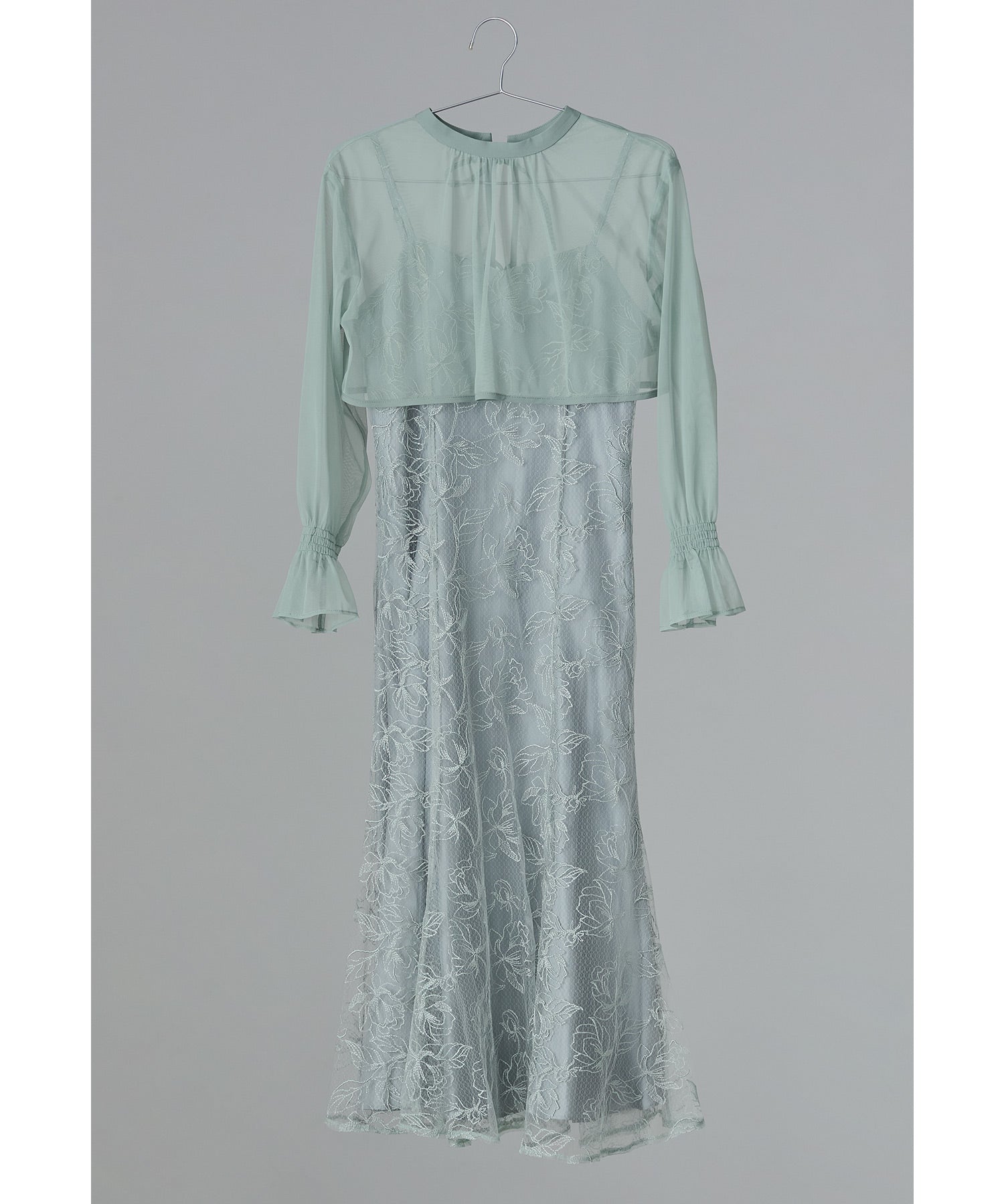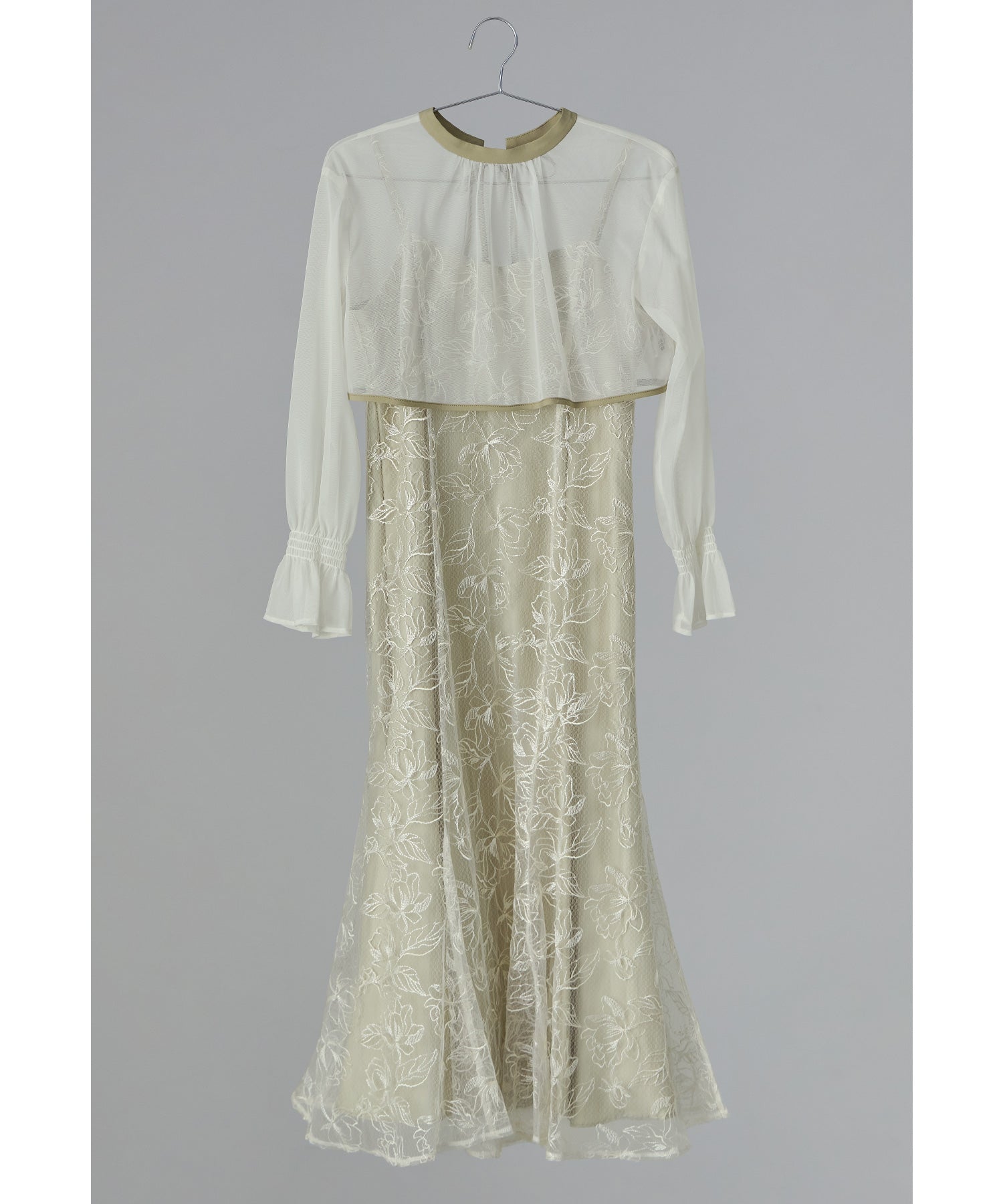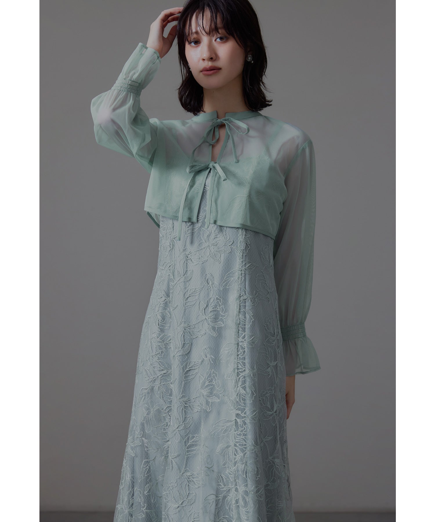 Rname ダブルリボンボレロセットドレス パーティードレス 結婚式 花柄 レース キャミワンピース 2点セット チュール 長袖 ロング丈 お呼ばれ パーティー 二次会 披露宴 謝恩会 成人式 同窓会 入学式 卒業式 フォーマル オケージョンドレス 春 夏 秋 冬 イエロー ミント ブラウン 黒