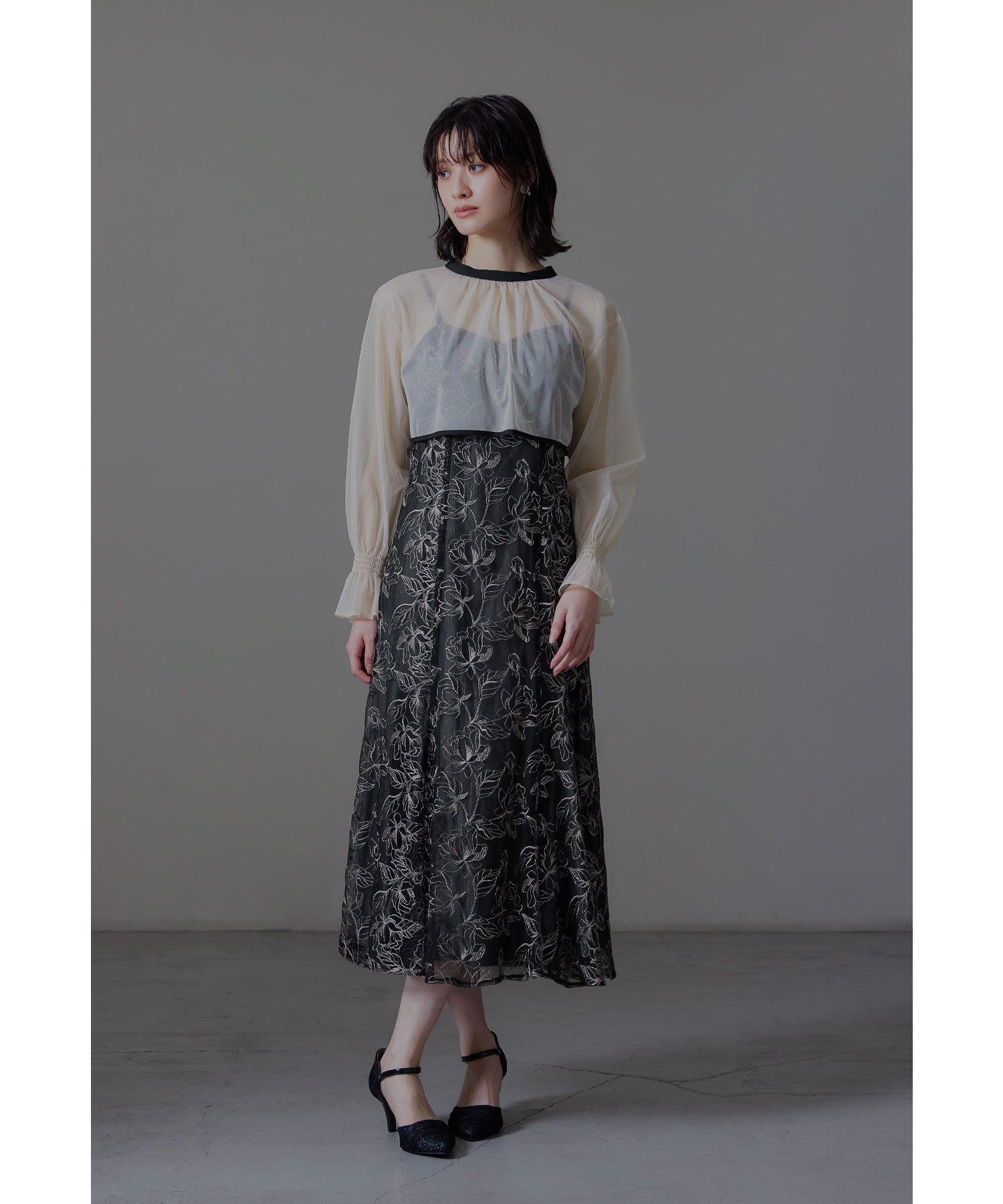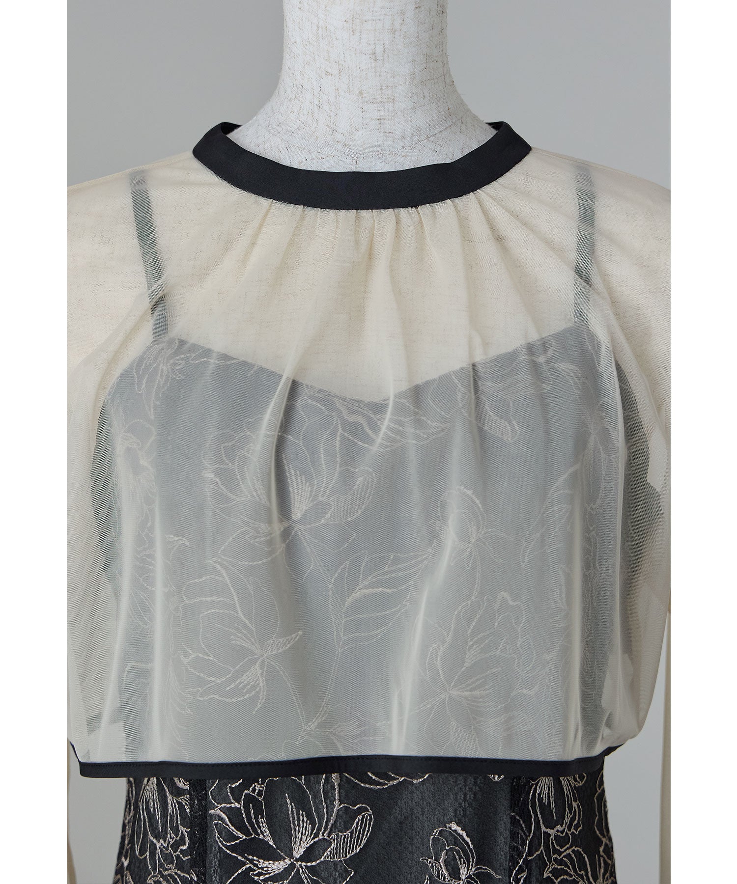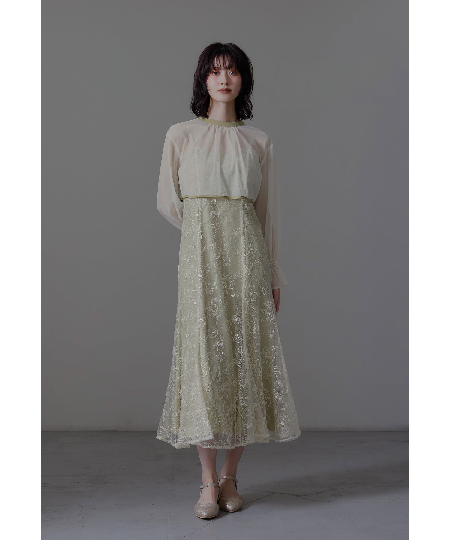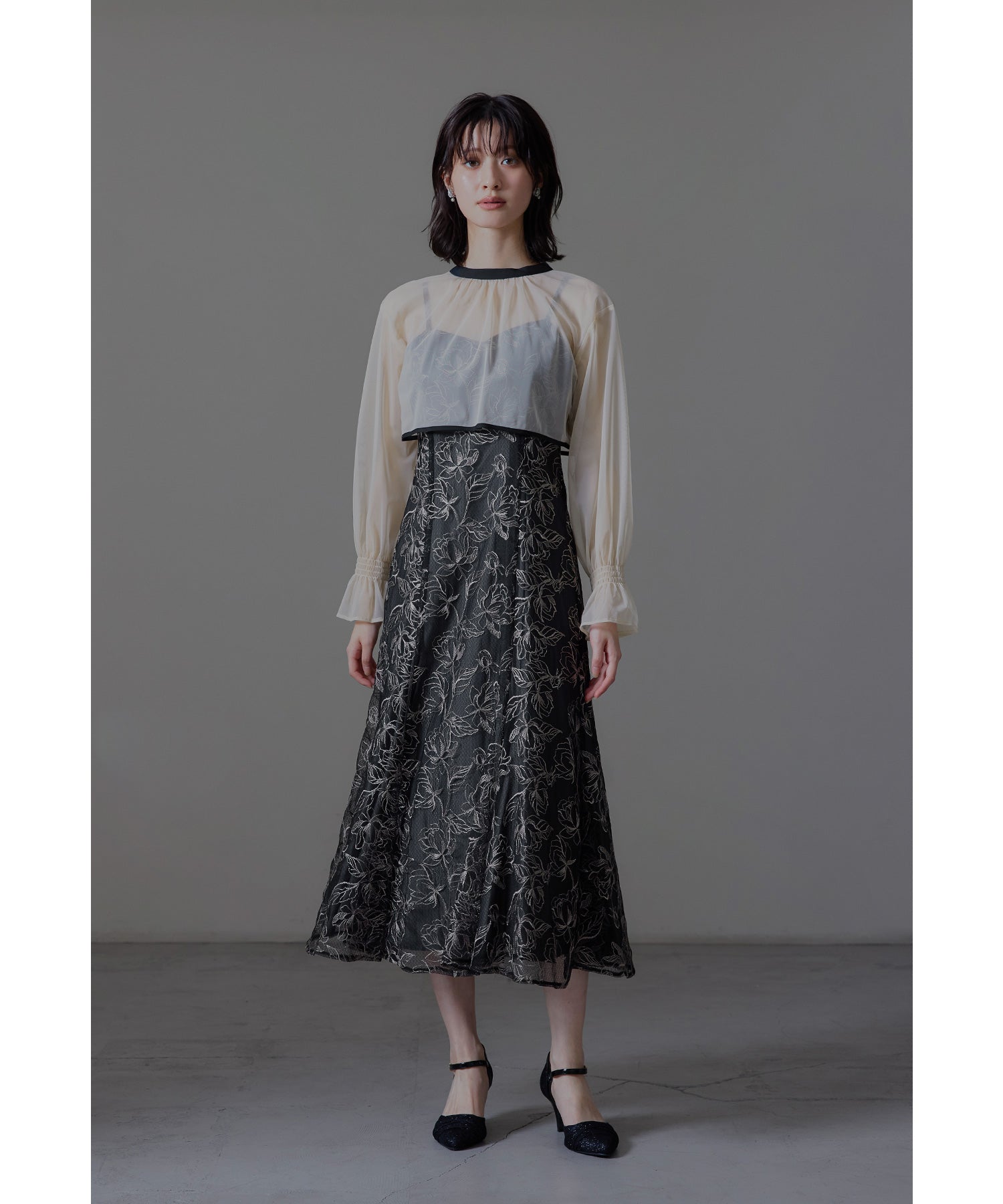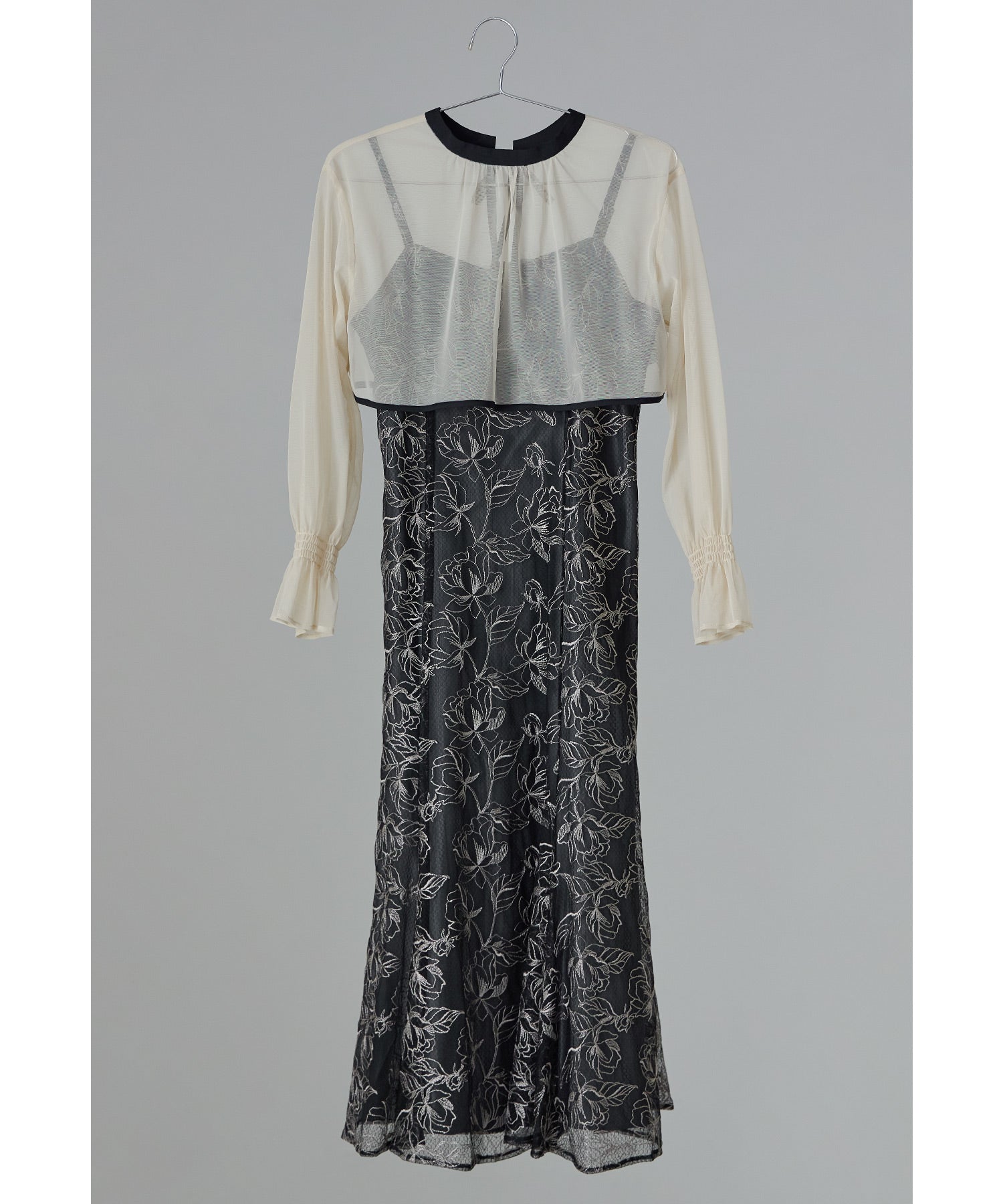 Rname ダブルリボンボレロセットドレス パーティードレス 結婚式 花柄 レース キャミワンピース 2点セット チュール 長袖 ロング丈 お呼ばれ パーティー 二次会 披露宴 謝恩会 成人式 同窓会 入学式 卒業式 フォーマル オケージョンドレス 春 夏 秋 冬 イエロー ミント ブラウン 黒