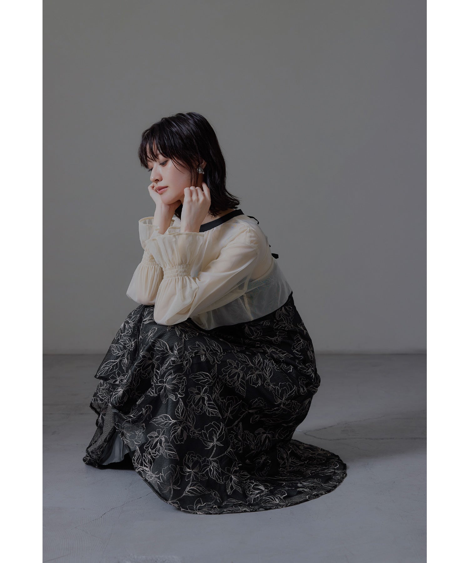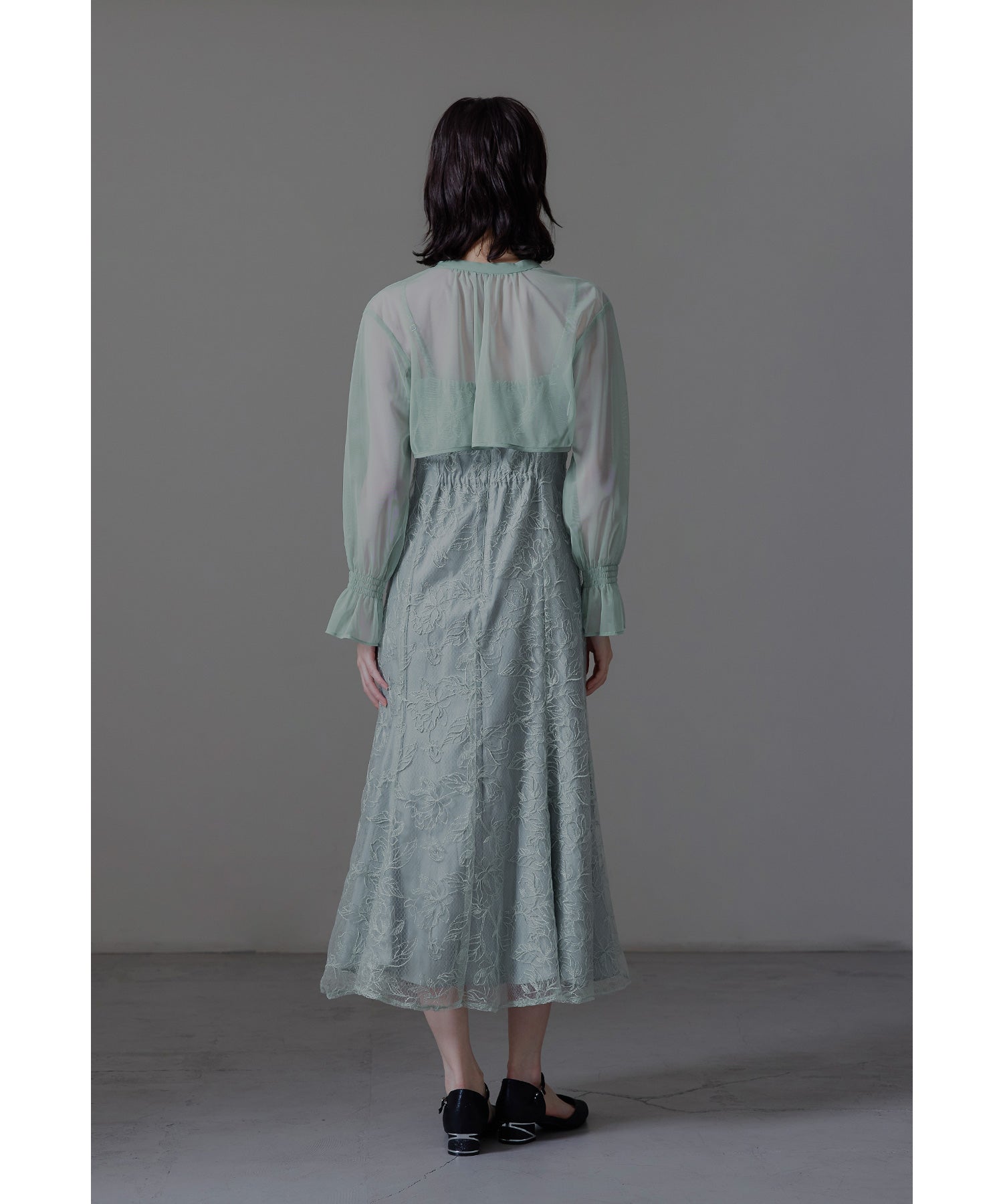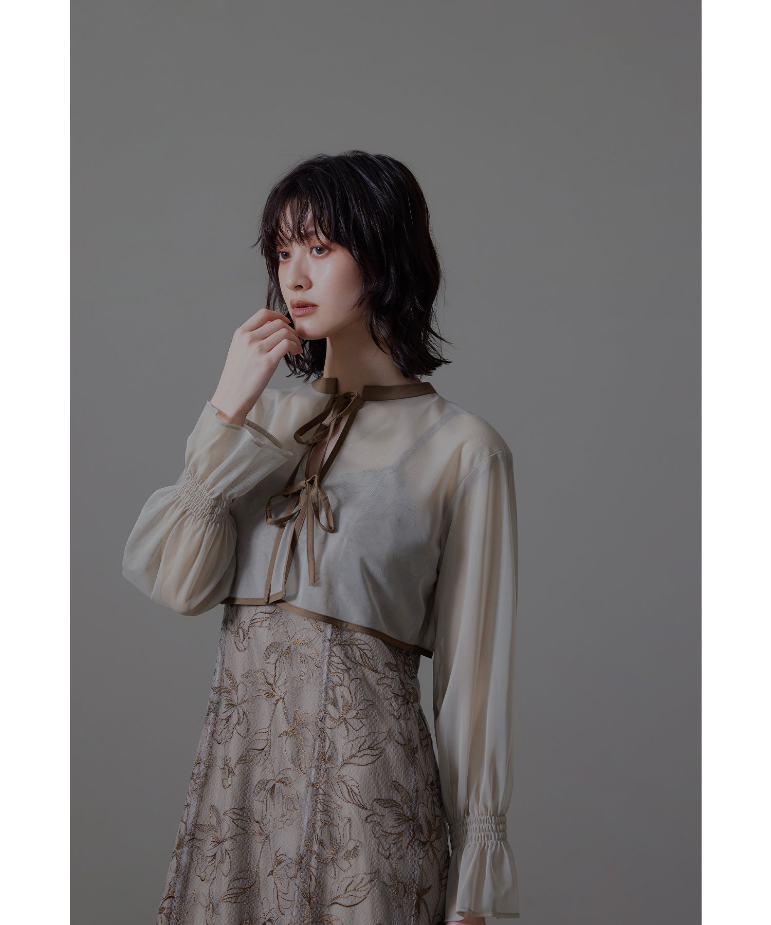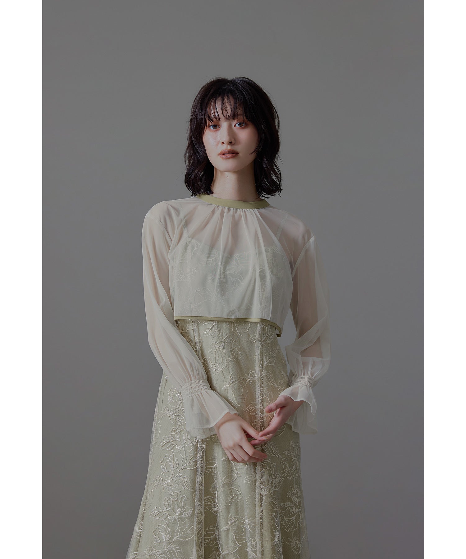 程よい透け感のチュールボレロは、キャンディスリーブで女性らしい印象に。
