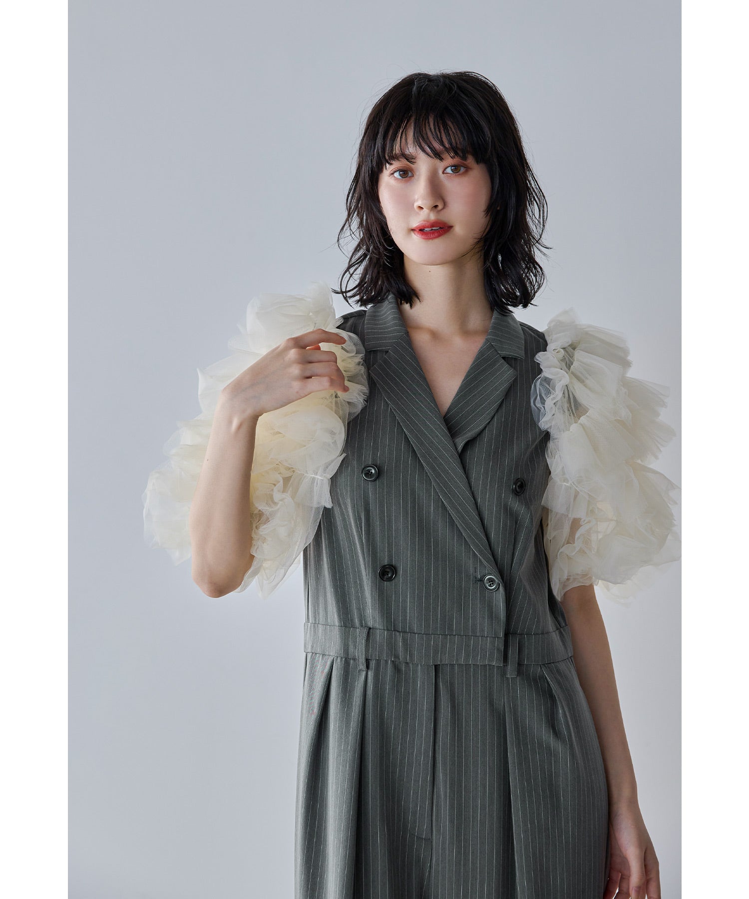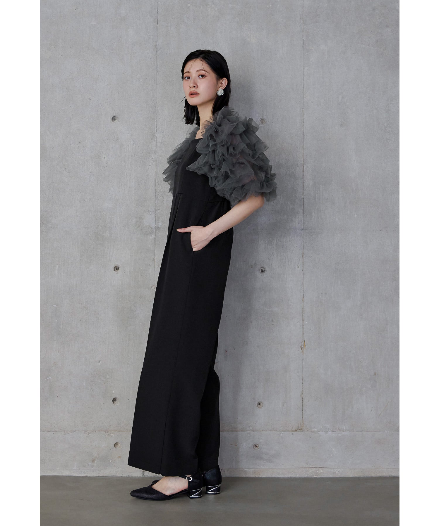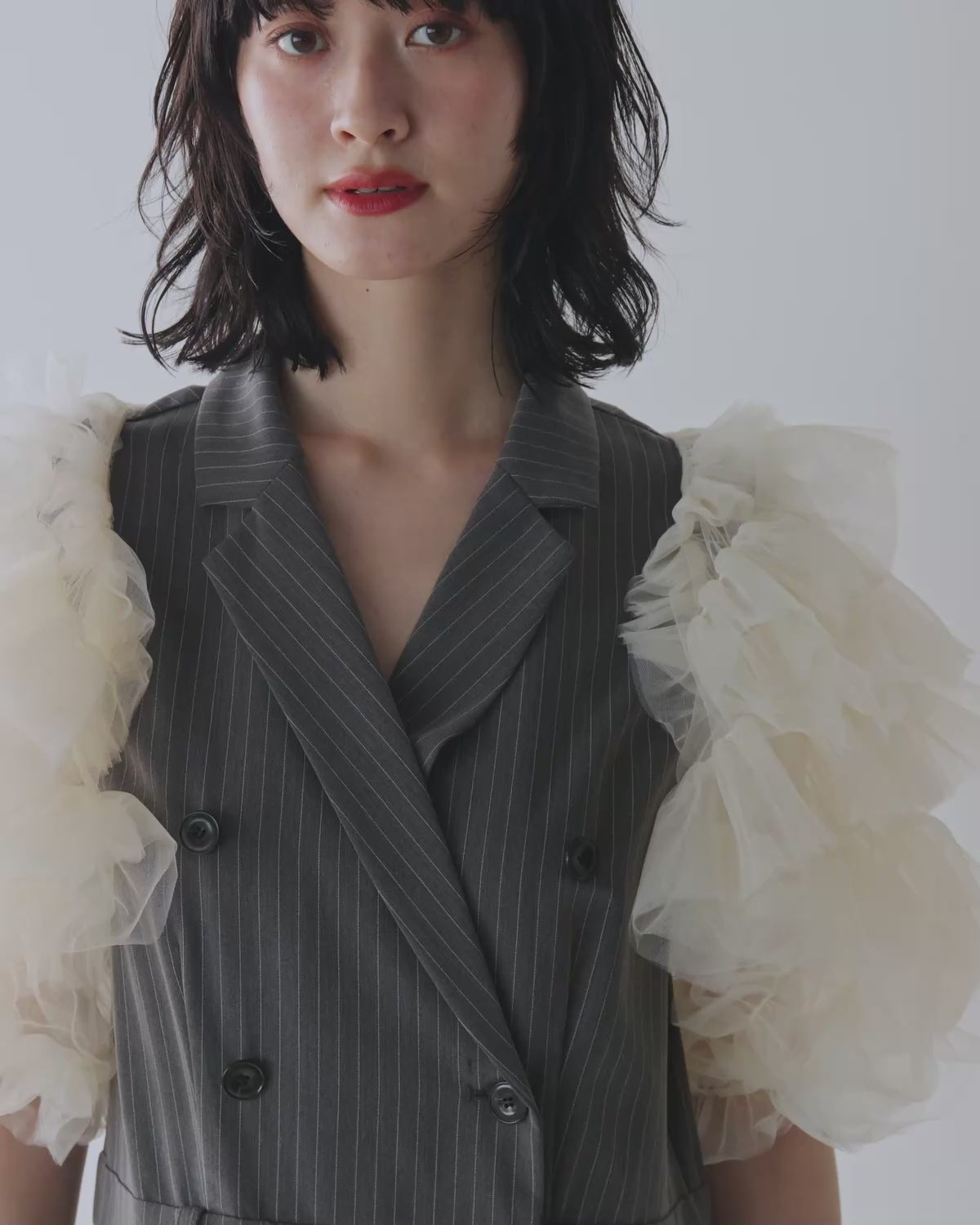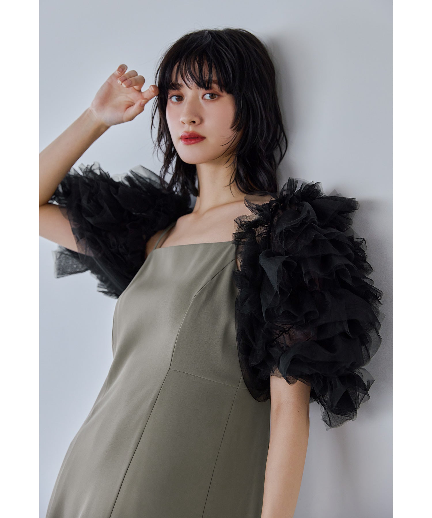 フリルが引き立つように柔らかな風合いの中に程よいハリ感を備えたチュール素材を使用。
