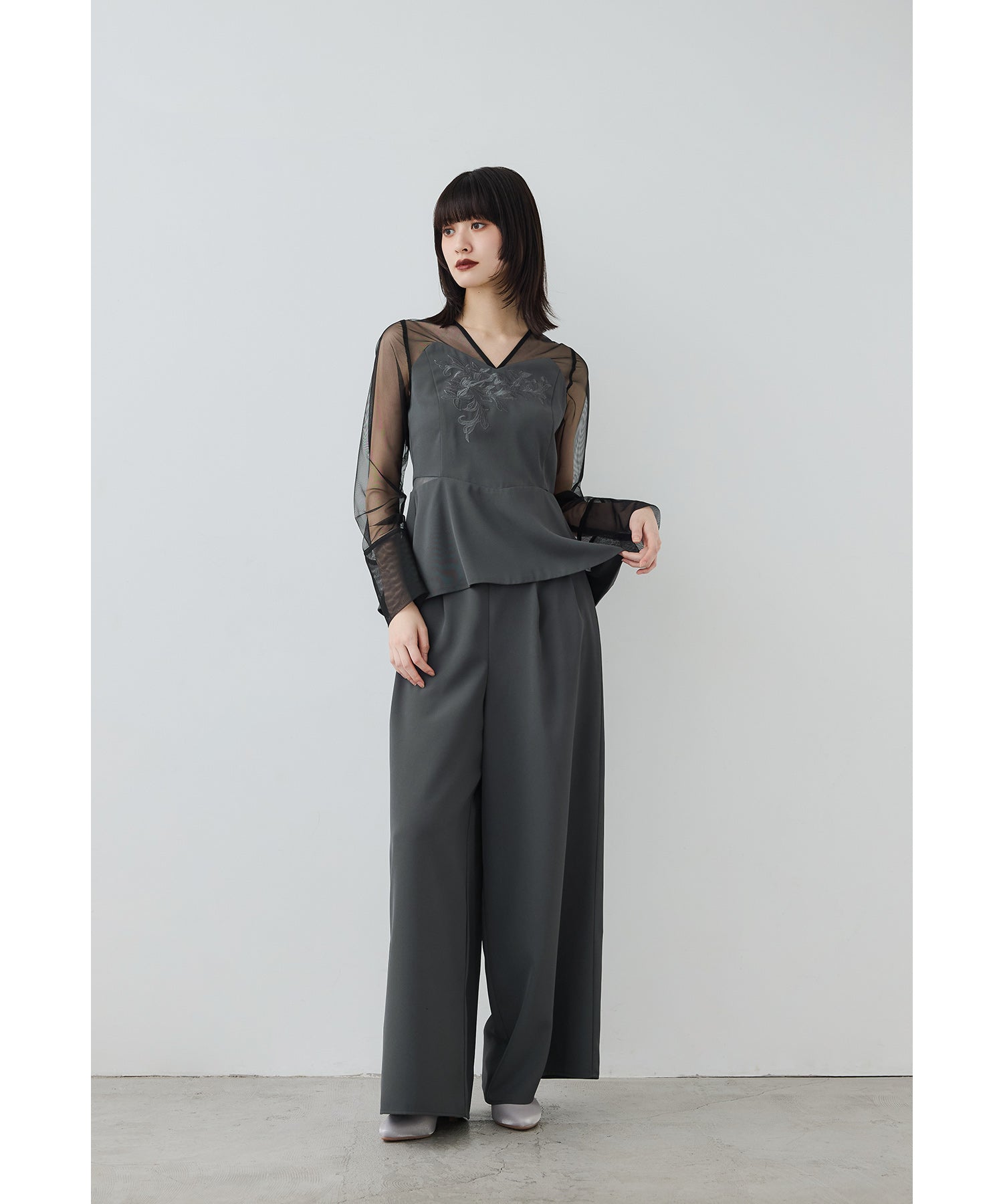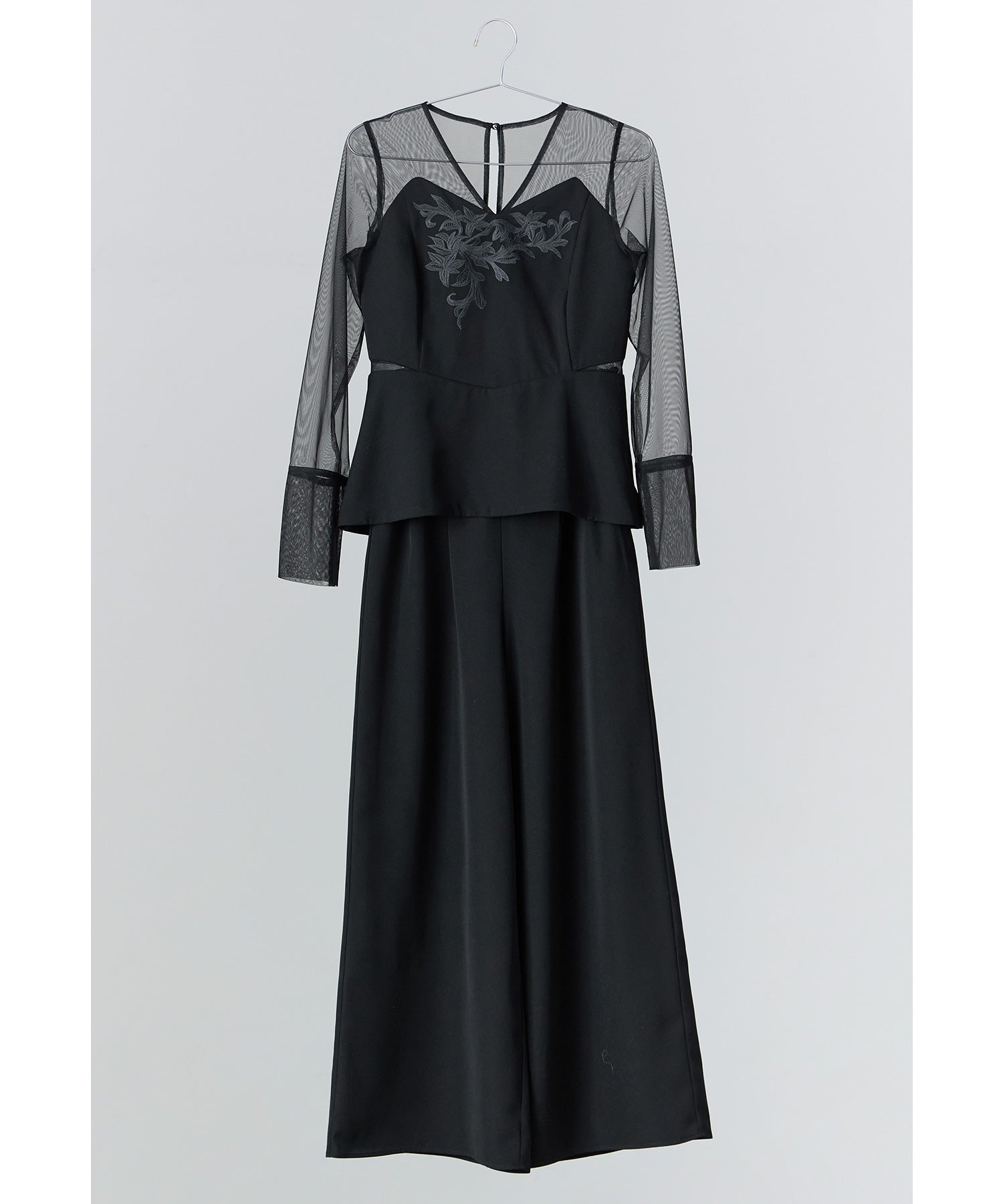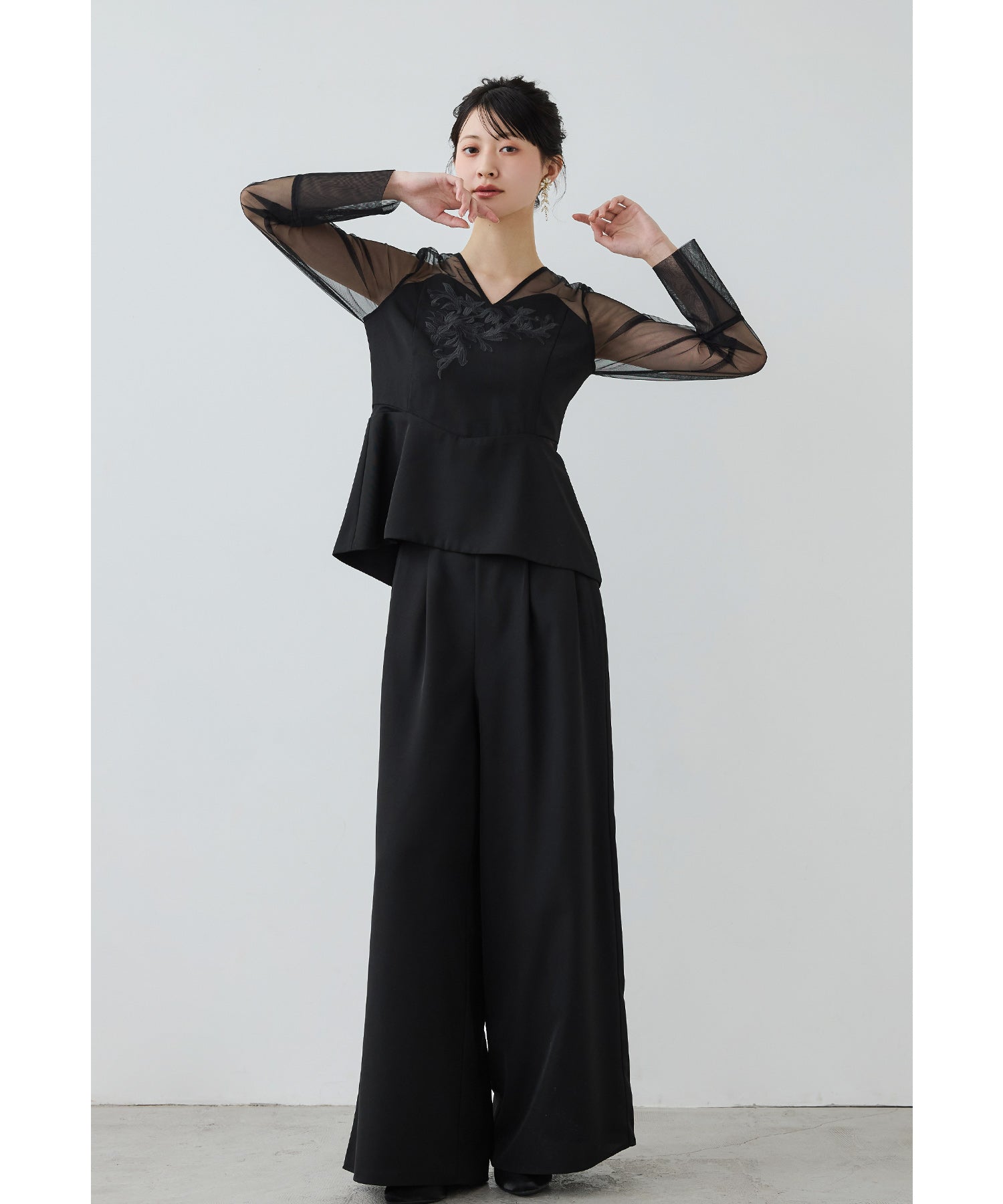 Rname 刺繍ペプラムブラウスセットアップドレス パーティードレス 結婚式 パンツドレス 2点セット セパレート ワイドパンツ チュール 長袖 お呼ばれ パーティー 二次会 披露宴 謝恩会 成人式 同窓会 入学式 卒業式 フォーマル セレモニー オケージョンドレス 春 夏 秋 冬 黒 グレー