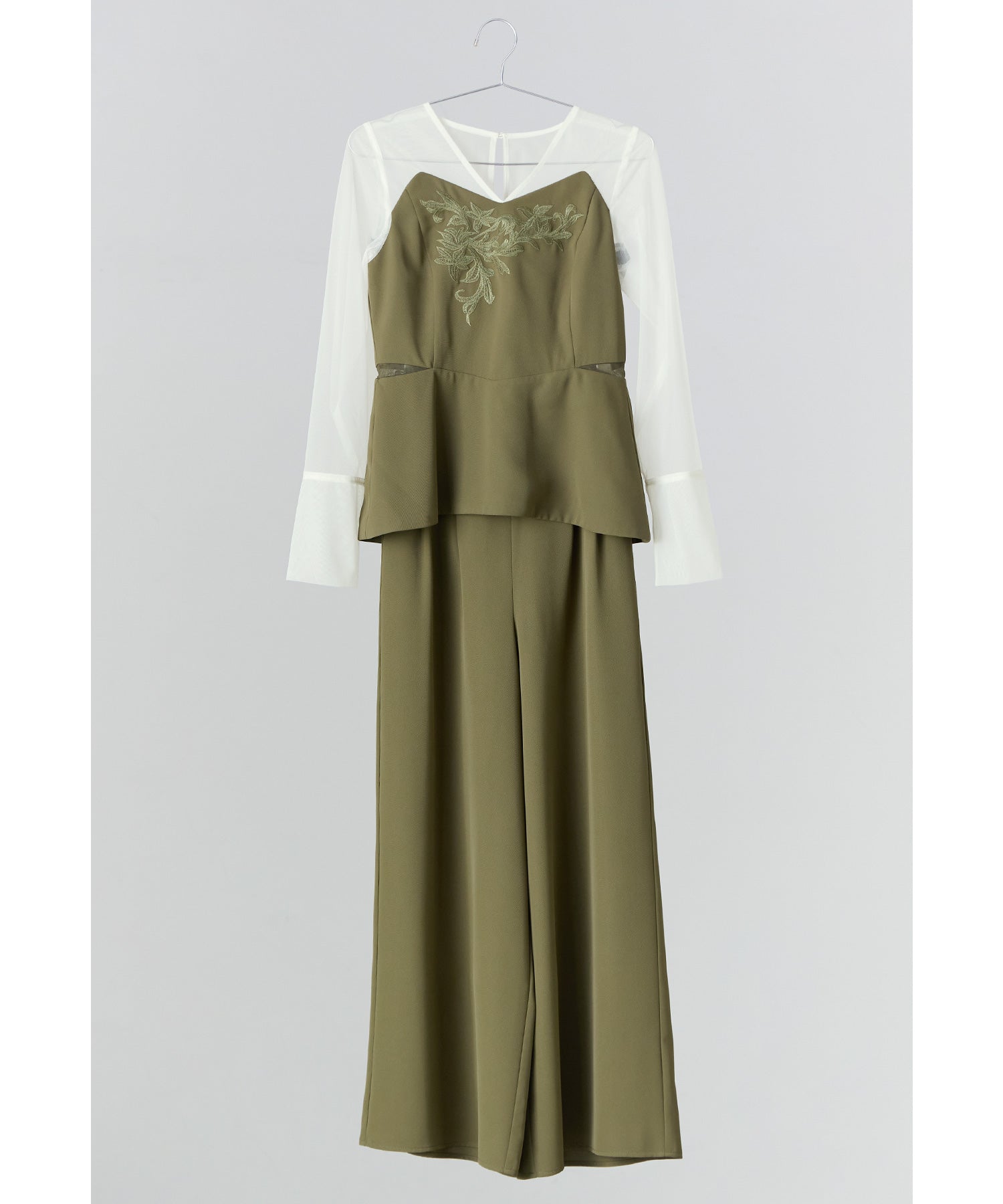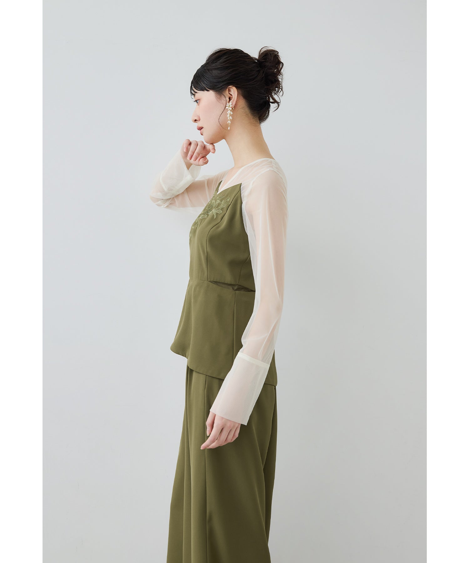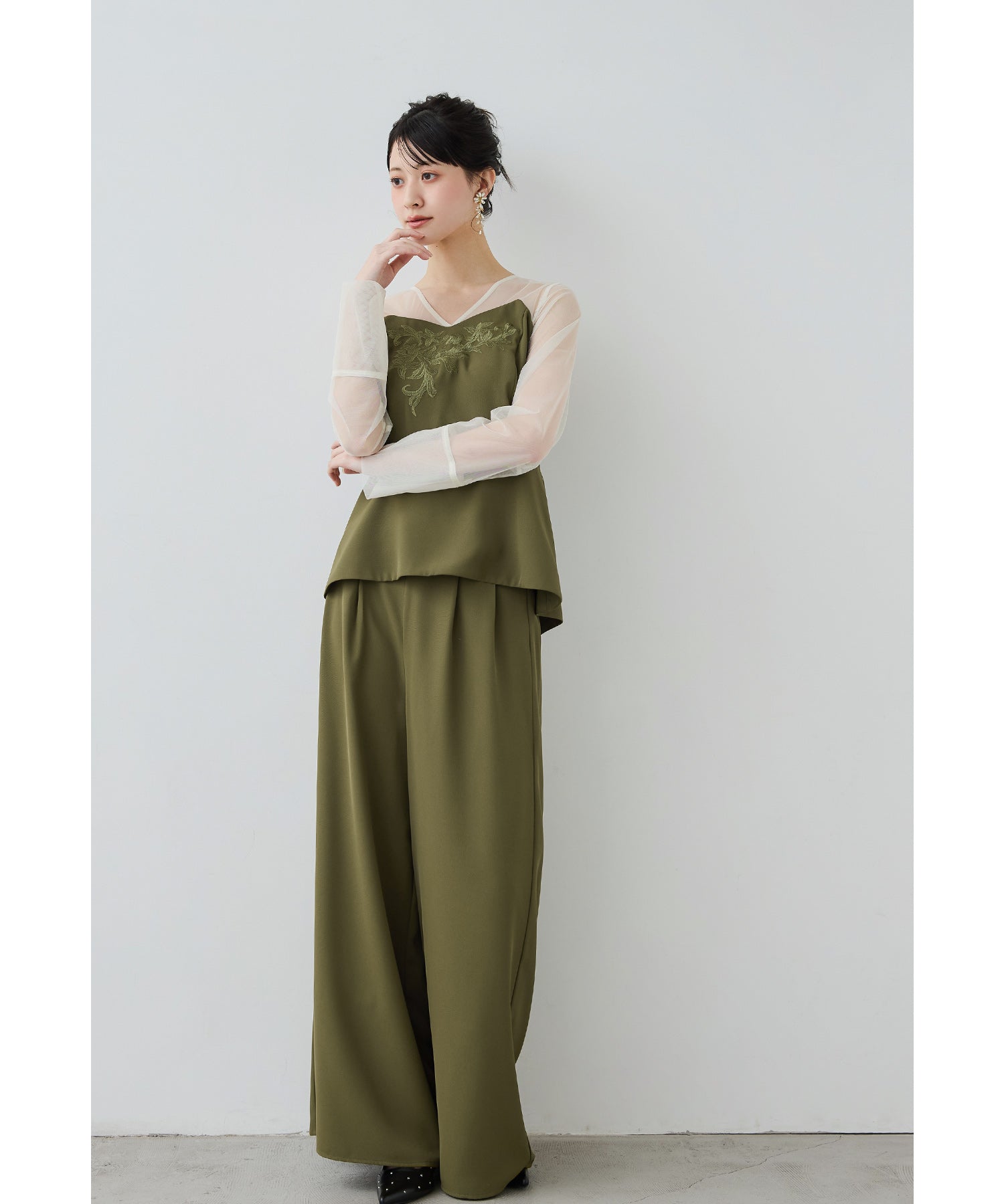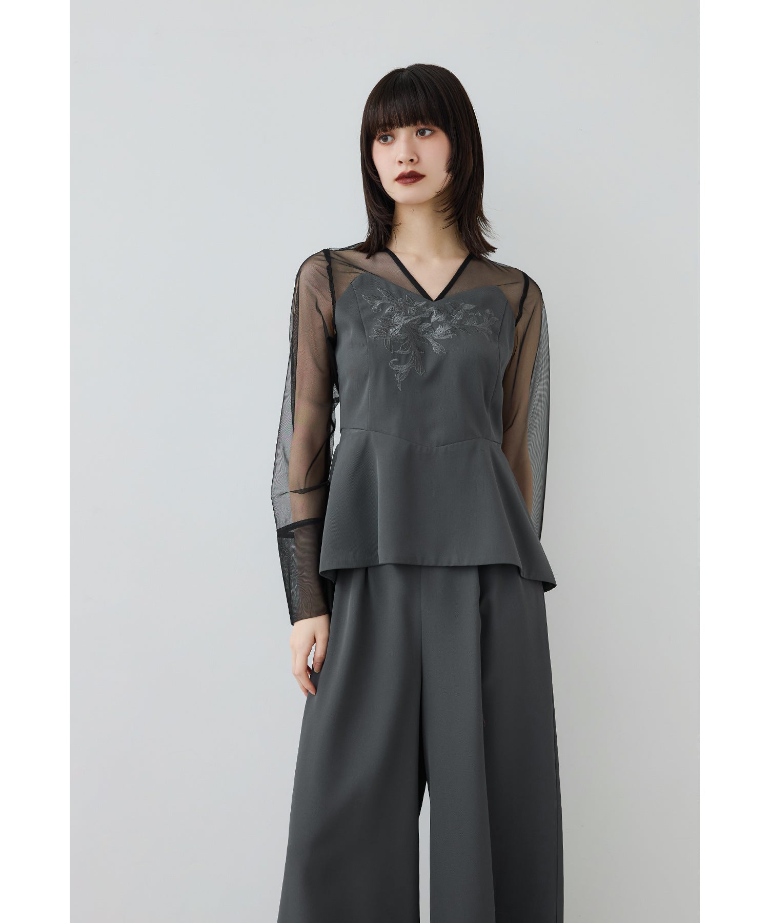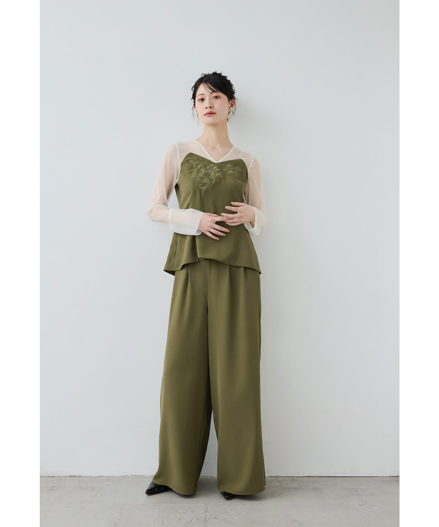 胸元の刺繍デザインがクラシカルなペプラムブラウスとワイドパンツの2ピースセット。