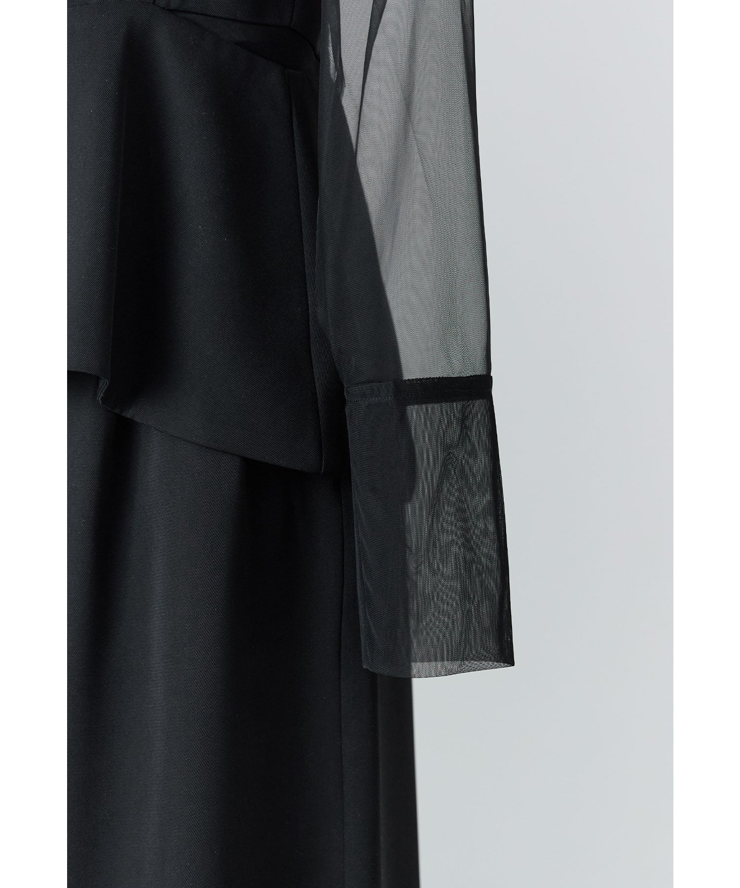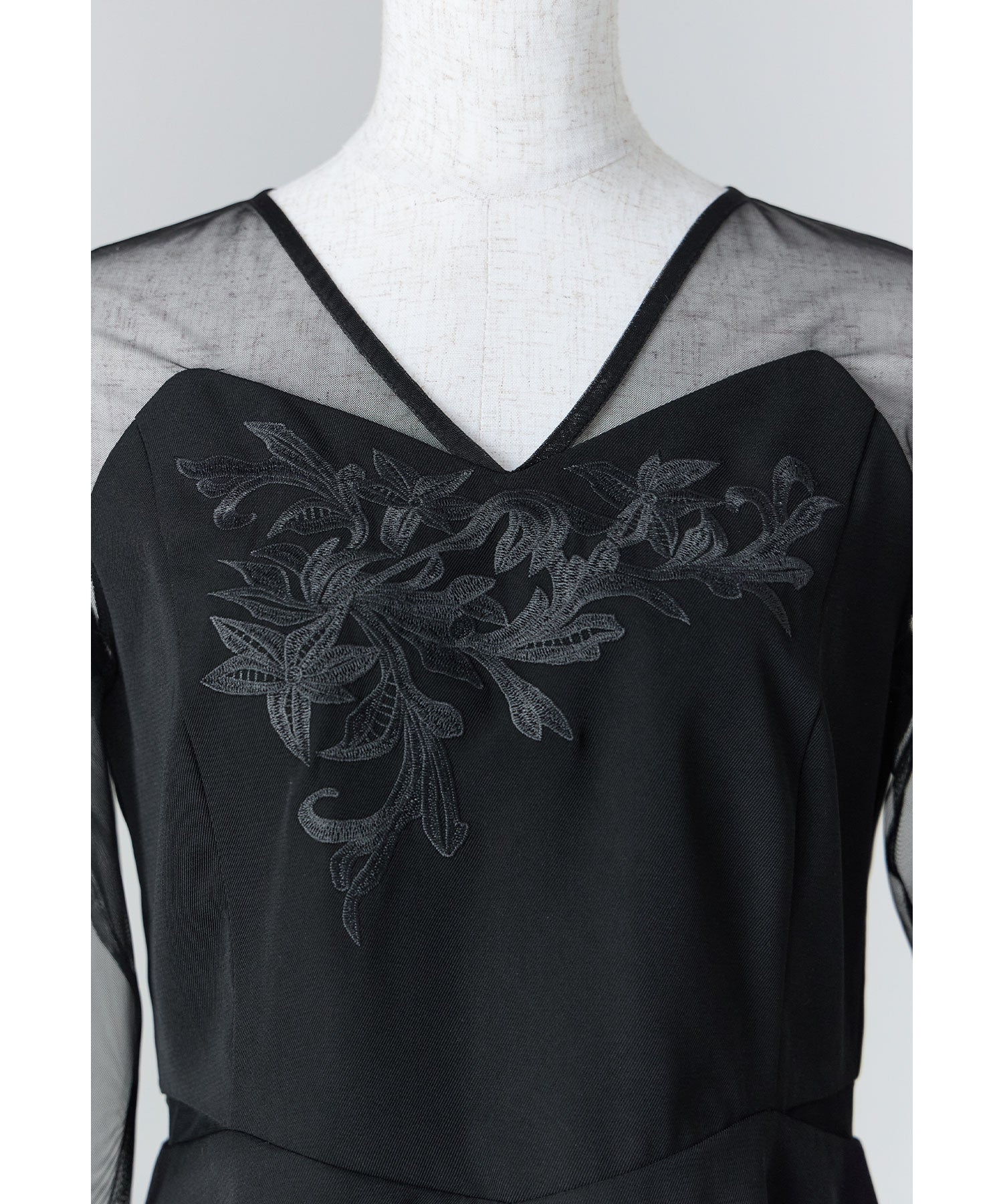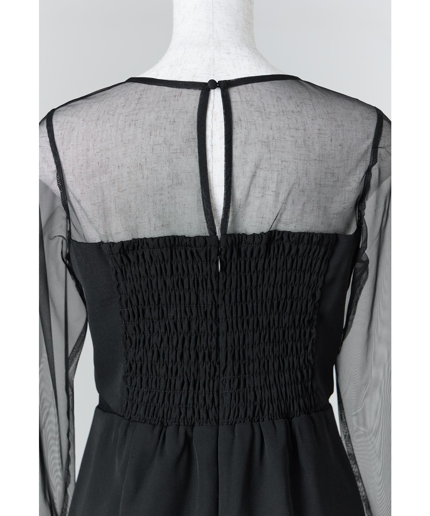 デコルテからお袖にかけてチュール素材に切り替えて程よい肌見せもプラス。