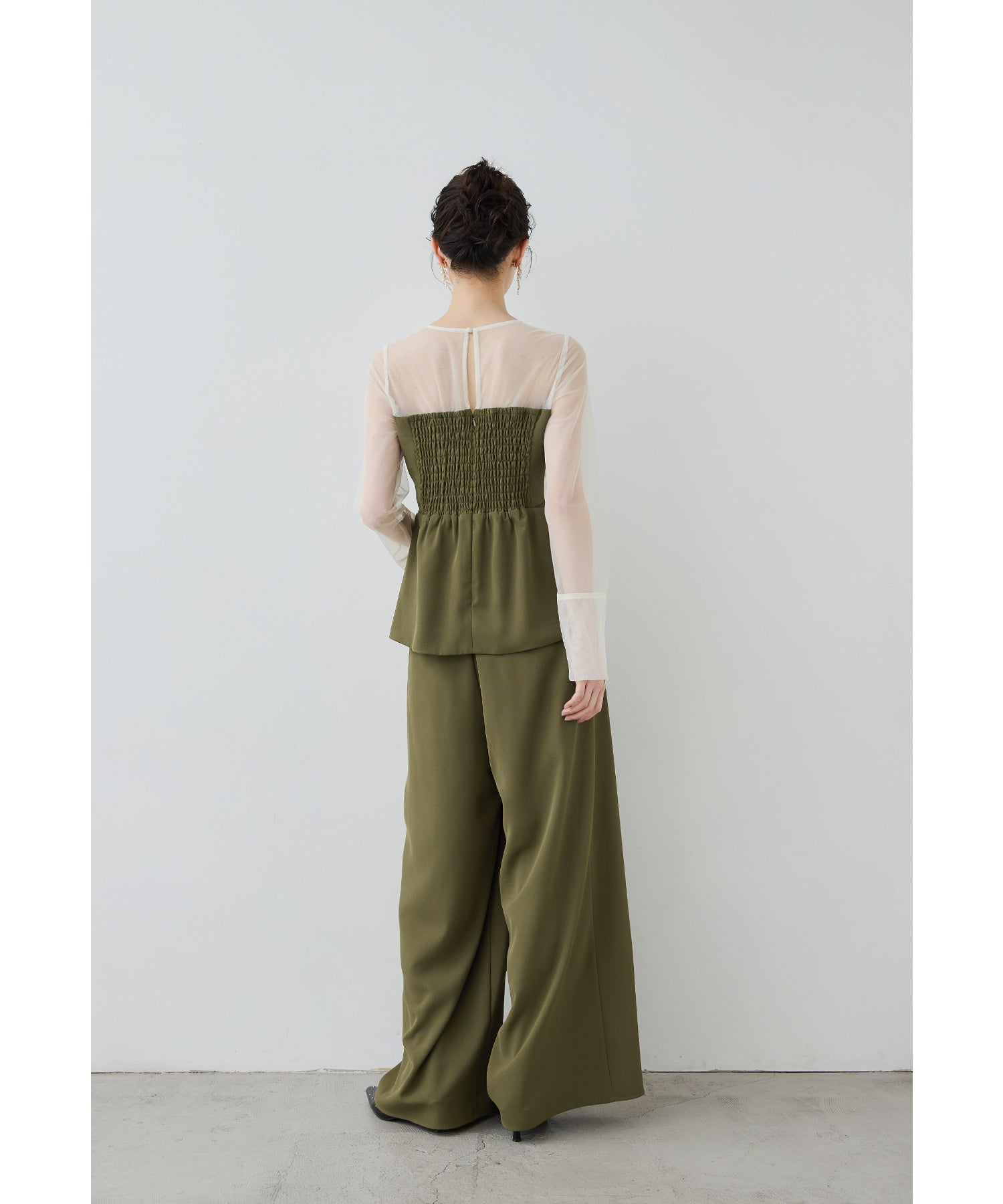 流れるようなワイドシルエットのパンツは程よい落ち感でこなれた印象に。