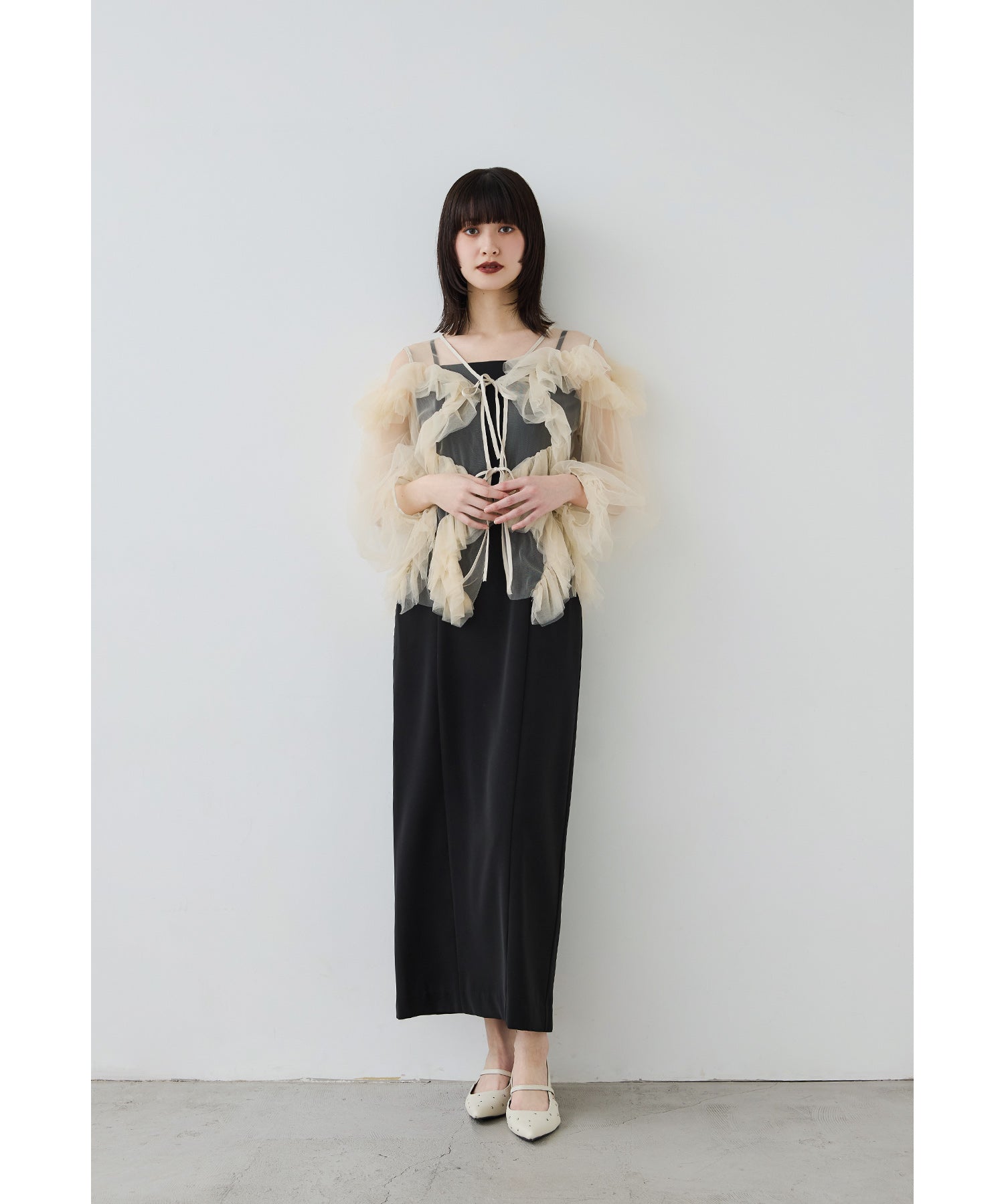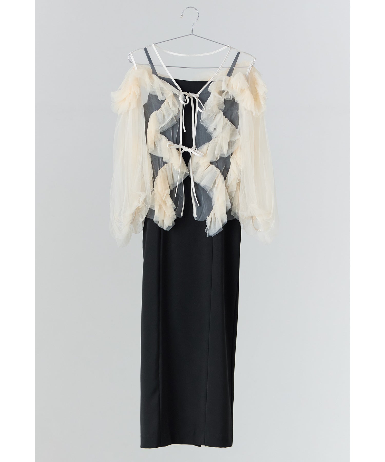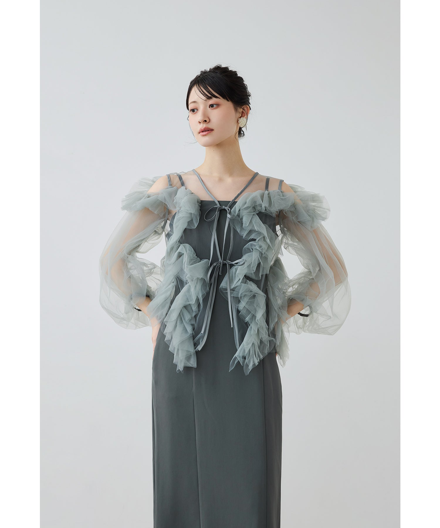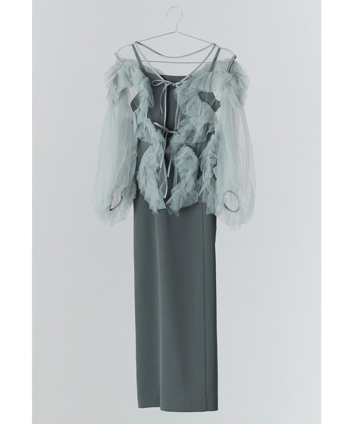 Rname ダブルリボンチュールフリルブラウスセットドレス パーティードレス 結婚式 キャミワンピース シアー 2点セット ロング丈 長袖 お呼ばれ パーティー 二次会 披露宴 謝恩会 成人式 同窓会 卒業式 フォーマル オケージョンドレス 春 夏 秋 冬 黒 ベージュ ピンク ミント グレー