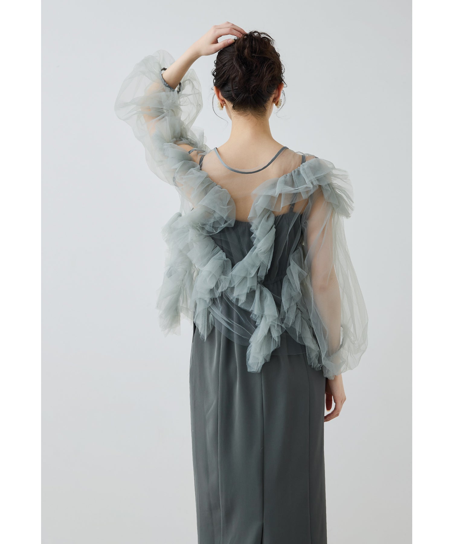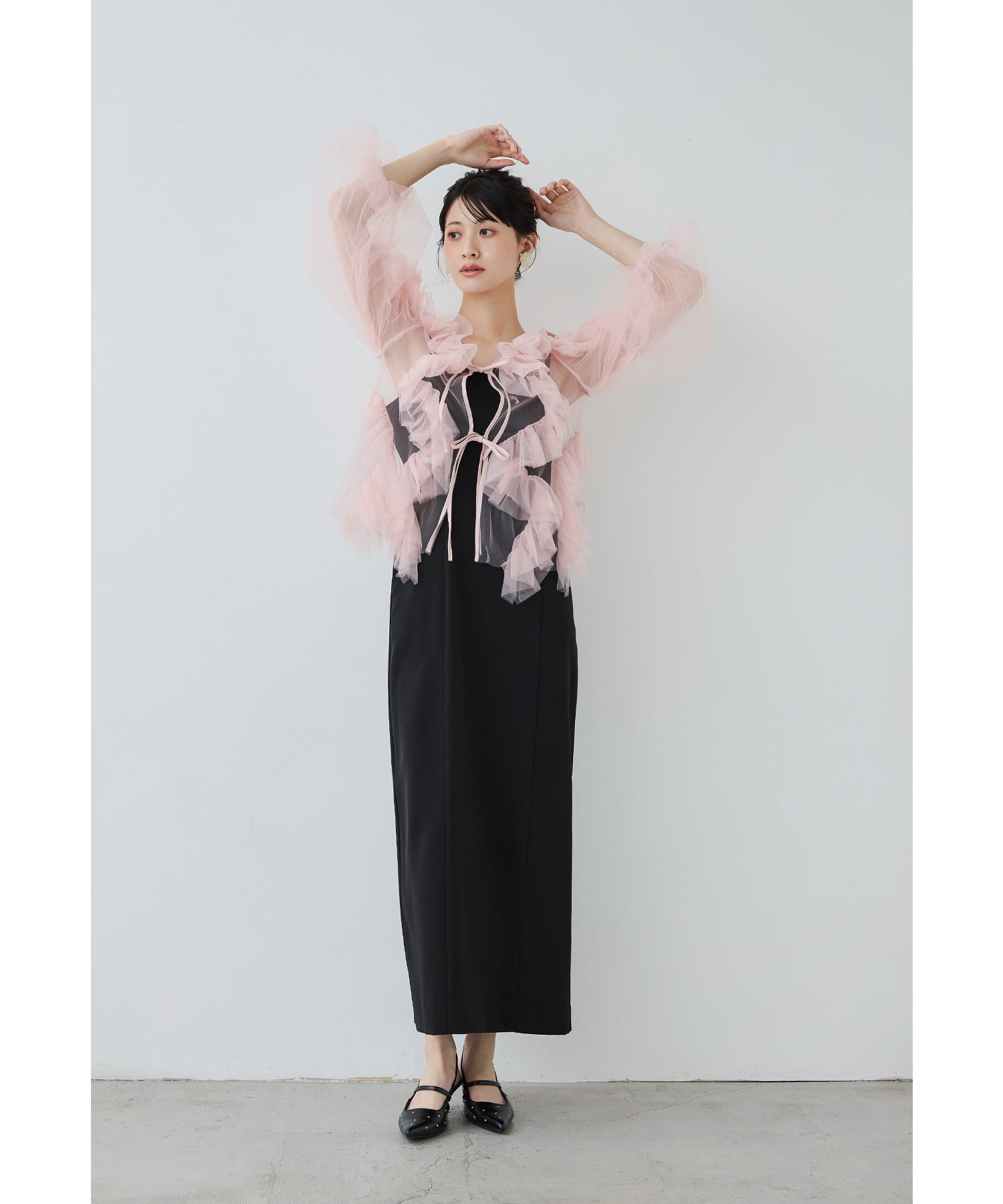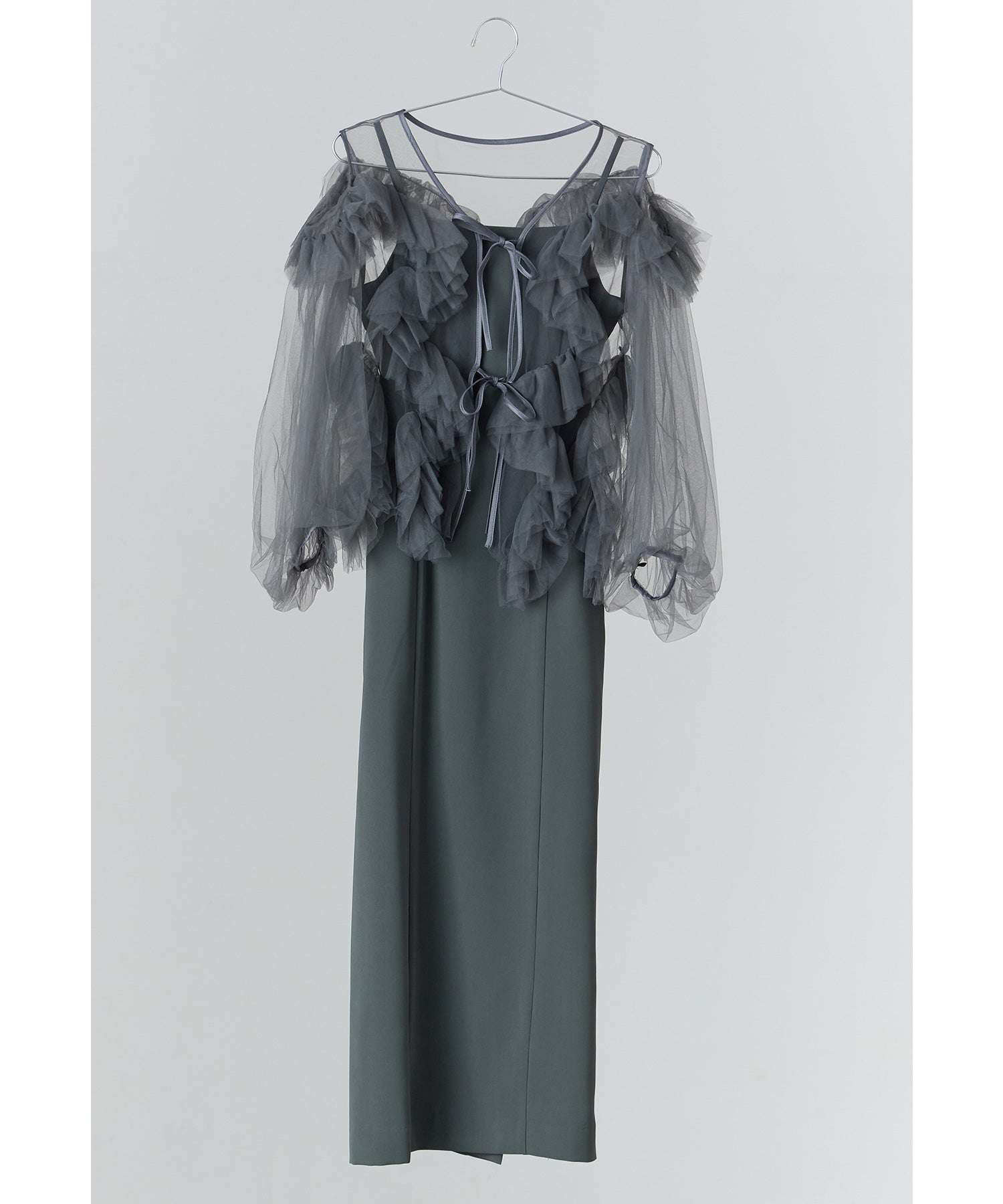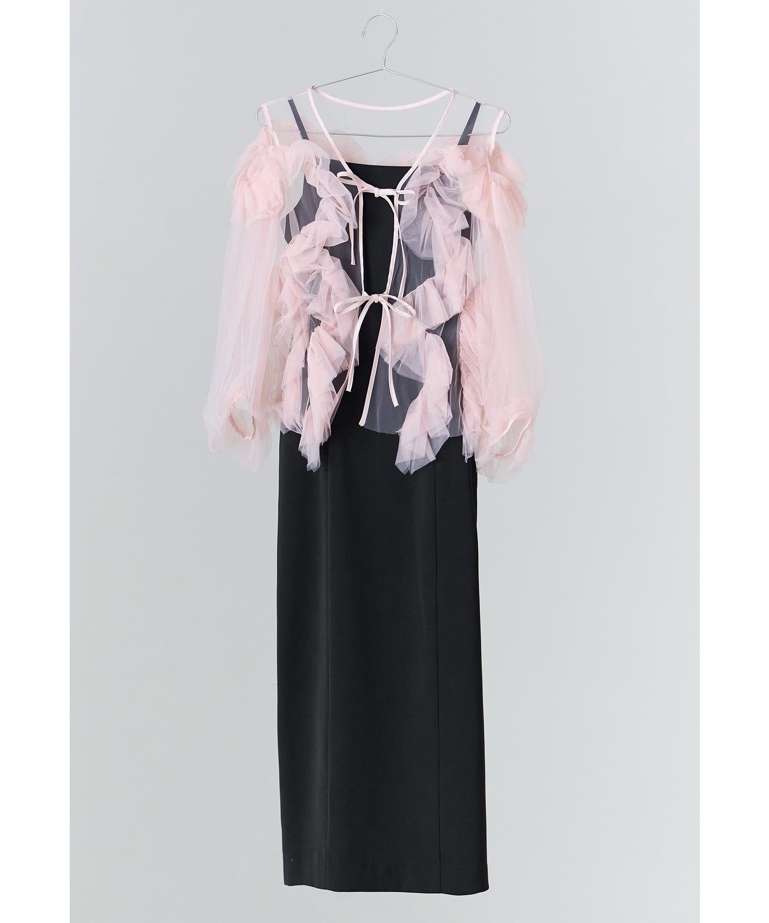 Rname ダブルリボンチュールフリルブラウスセットドレス パーティードレス 結婚式 キャミワンピース シアー 2点セット ロング丈 長袖 お呼ばれ パーティー 二次会 披露宴 謝恩会 成人式 同窓会 卒業式 フォーマル オケージョンドレス 春 夏 秋 冬 黒 ベージュ ピンク ミント グレー