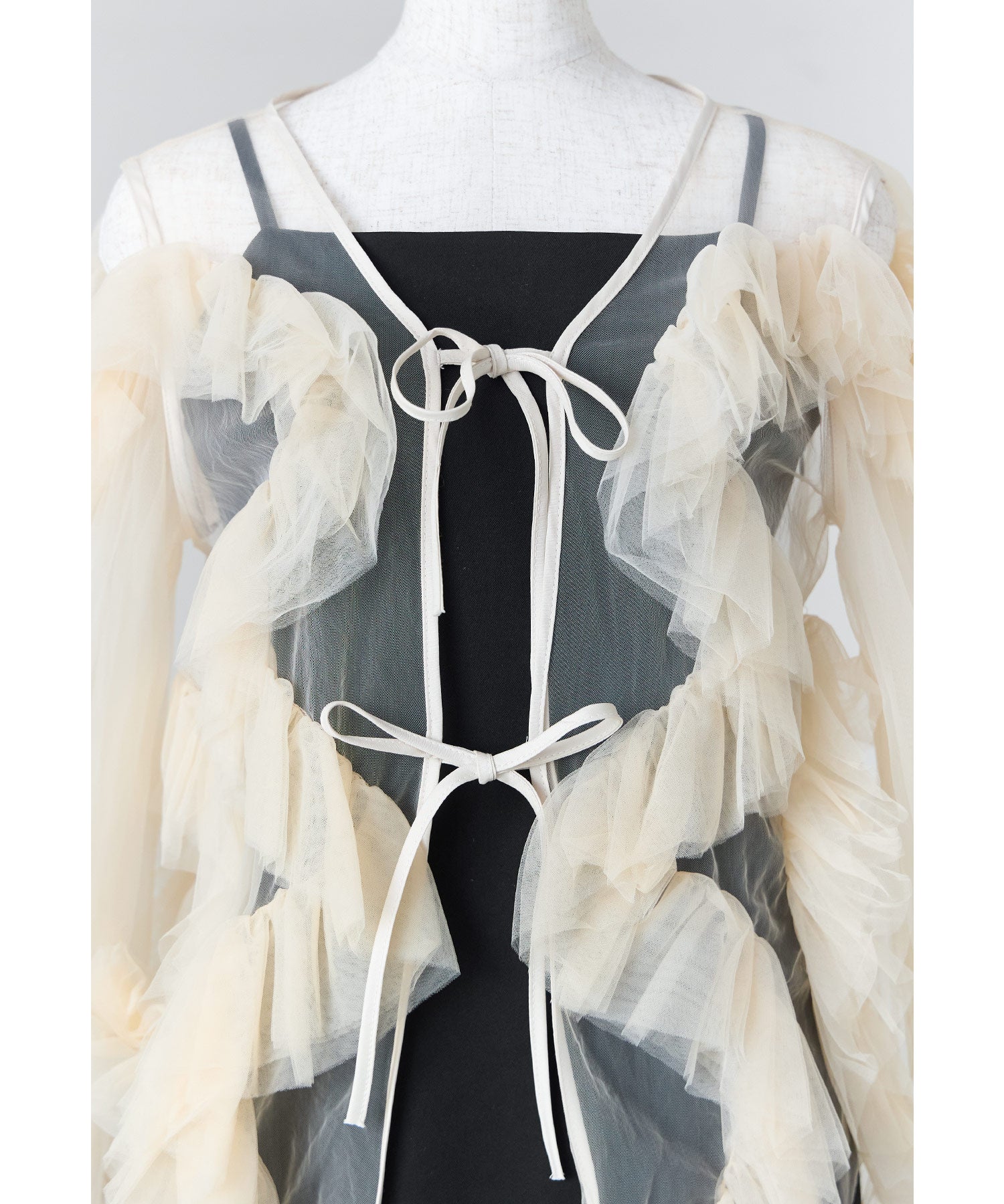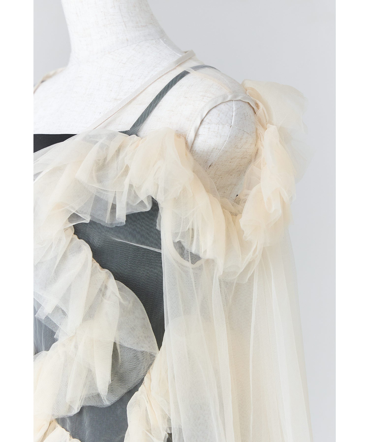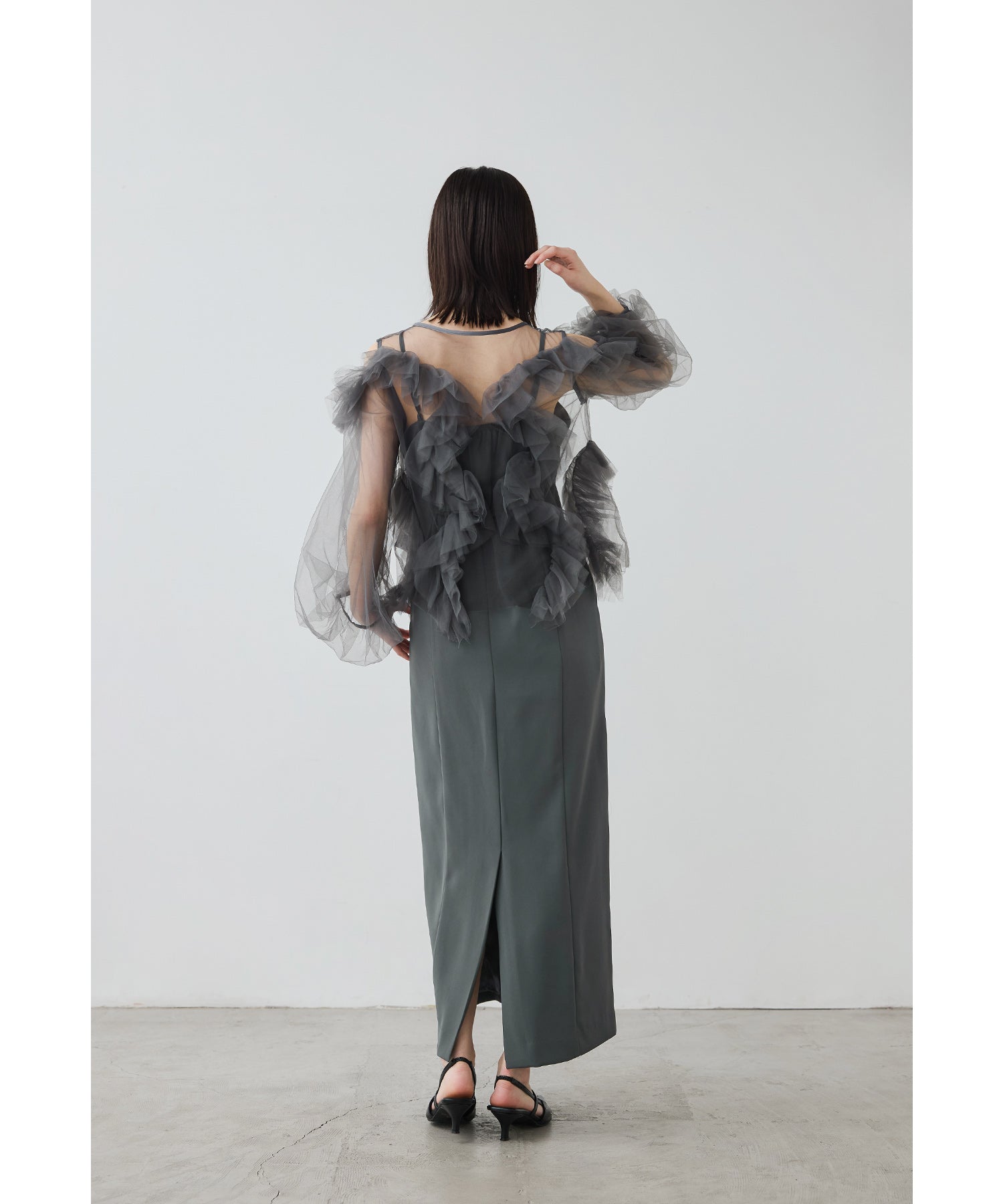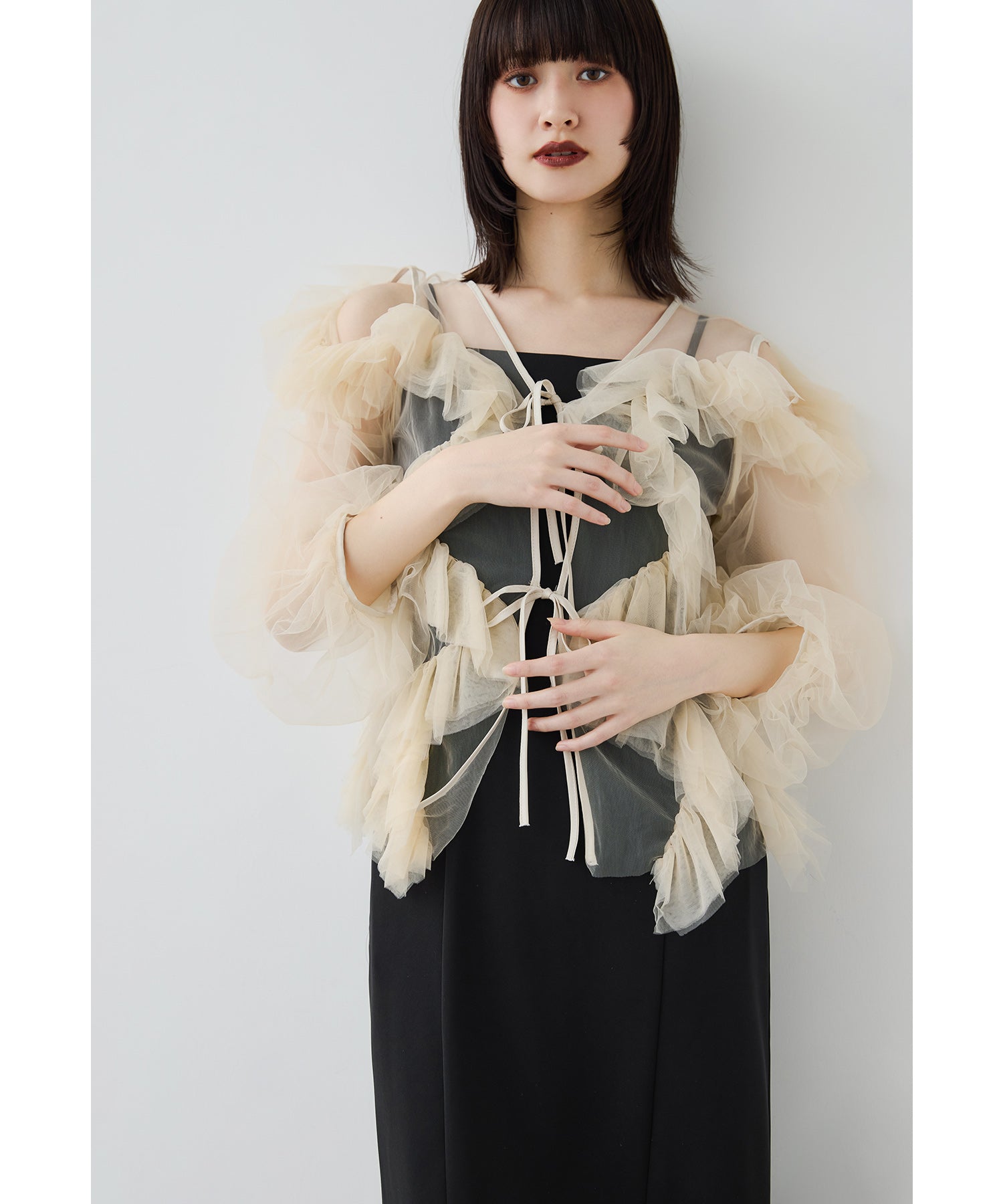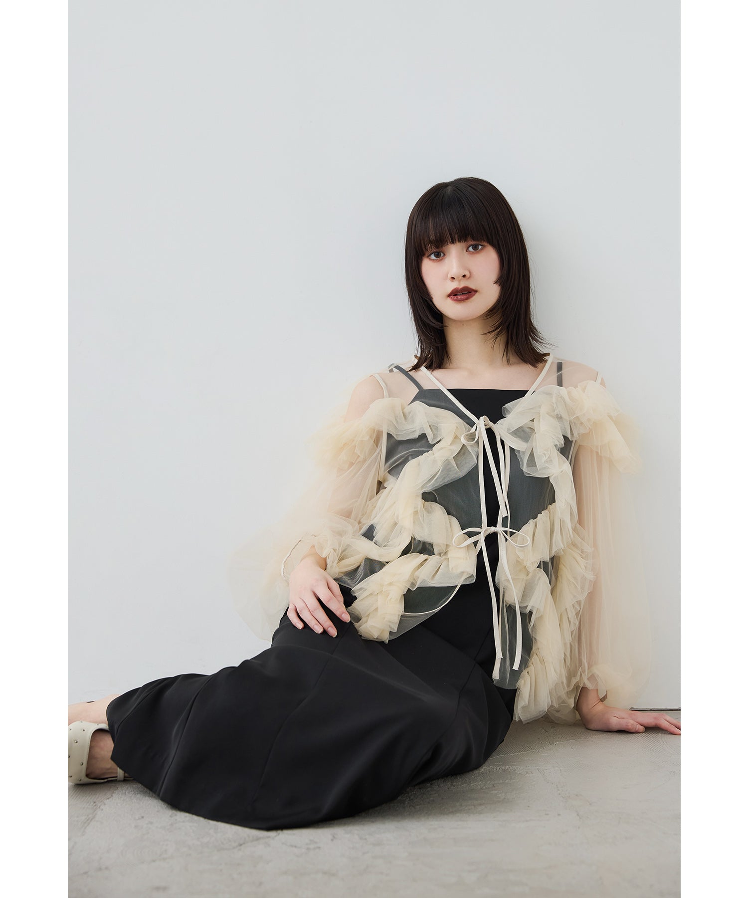 Rname ダブルリボンチュールフリルブラウスセットドレス パーティードレス 結婚式 キャミワンピース シアー 2点セット ロング丈 長袖 お呼ばれ パーティー 二次会 披露宴 謝恩会 成人式 同窓会 卒業式 フォーマル オケージョンドレス 春 夏 秋 冬 黒 ベージュ ピンク ミント グレー