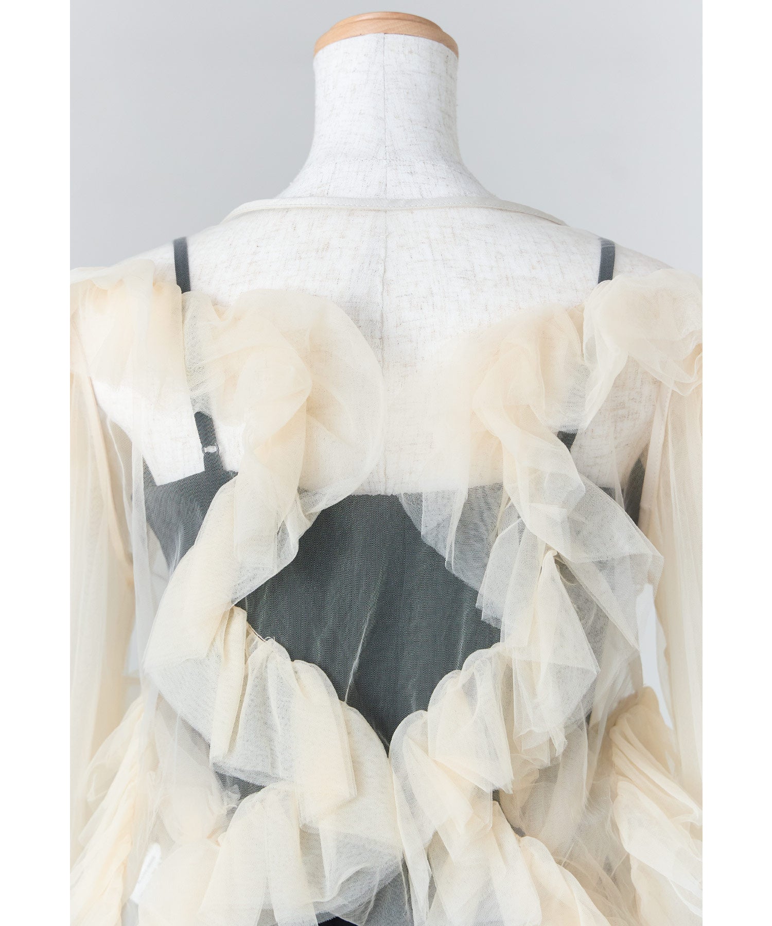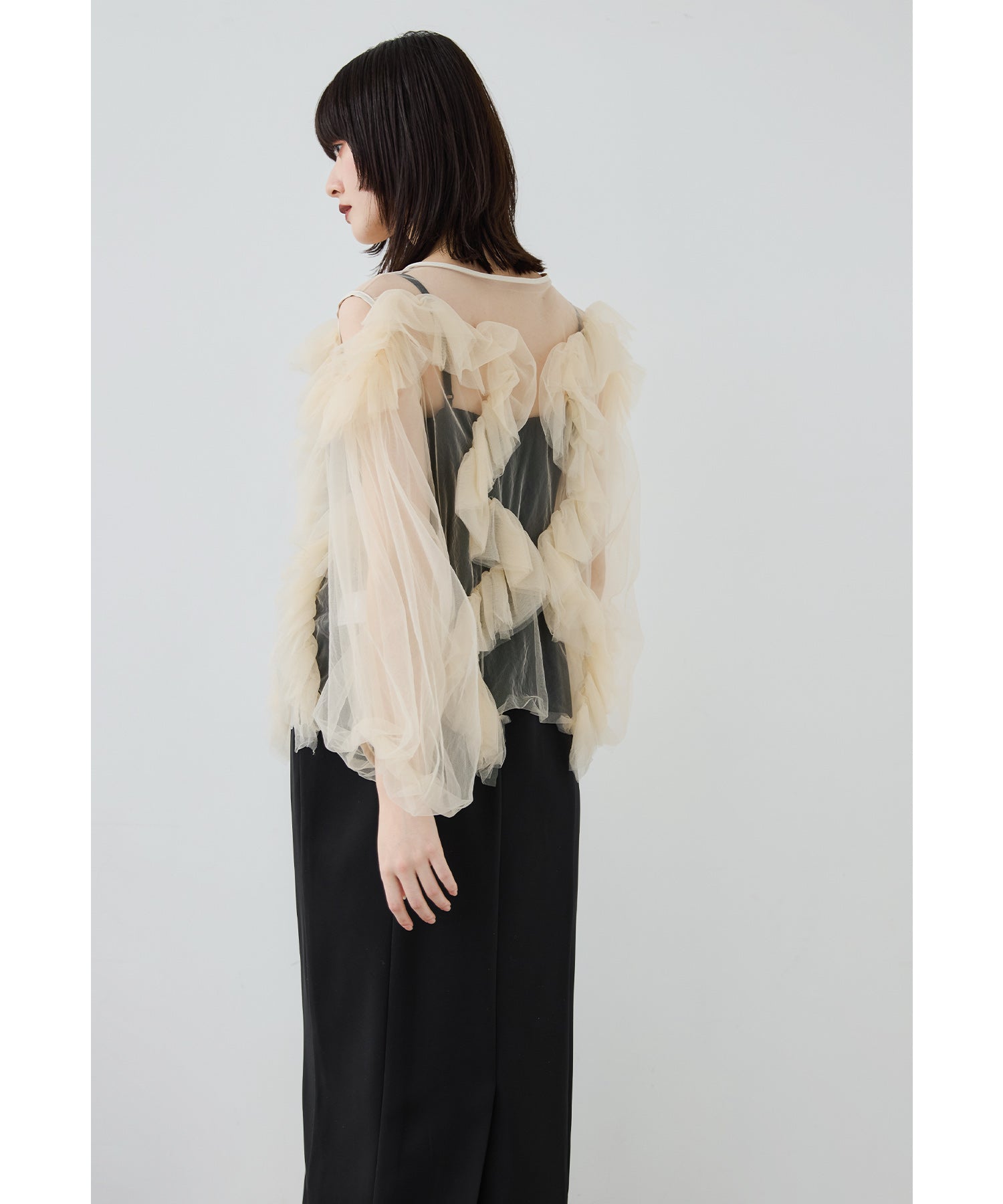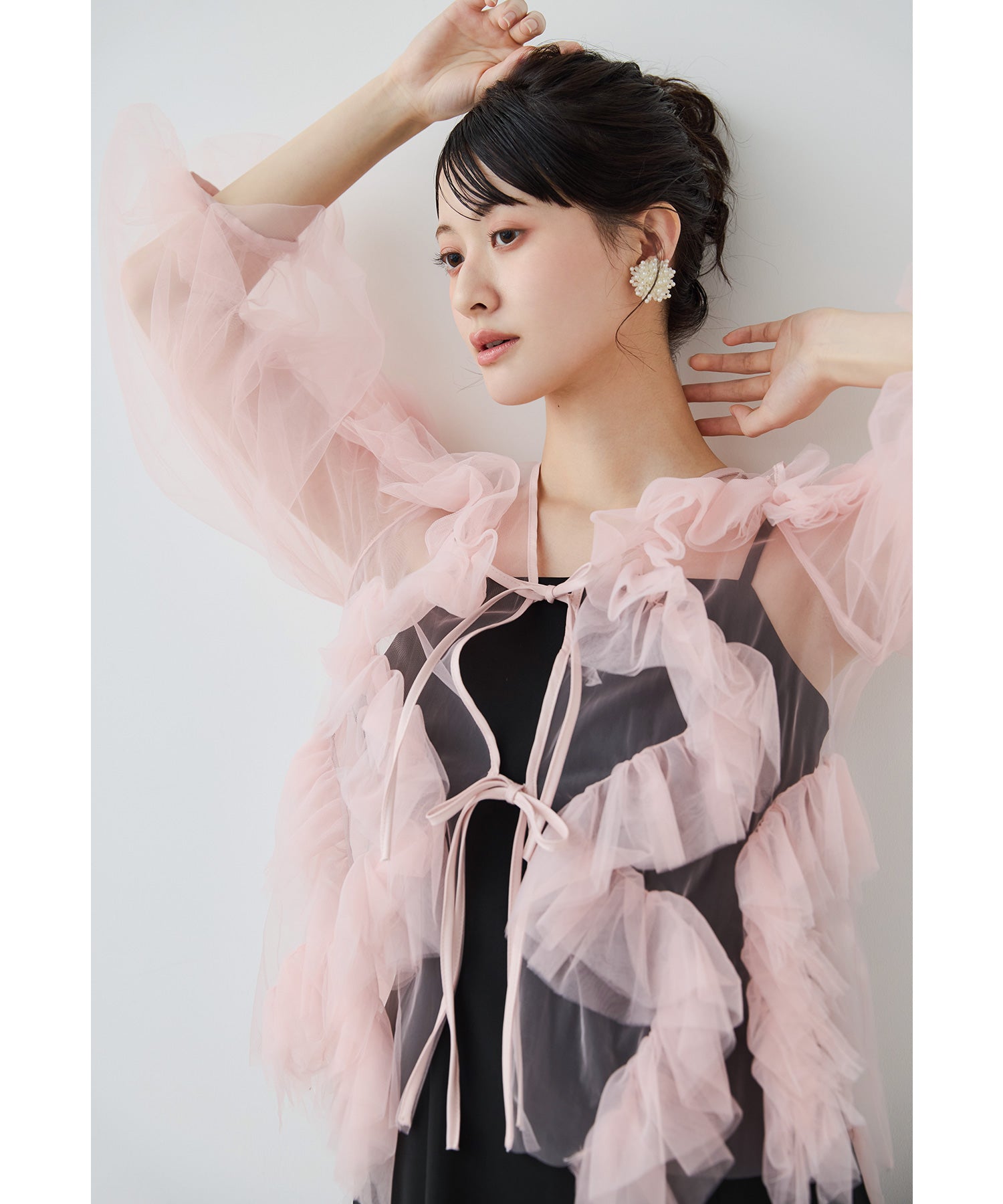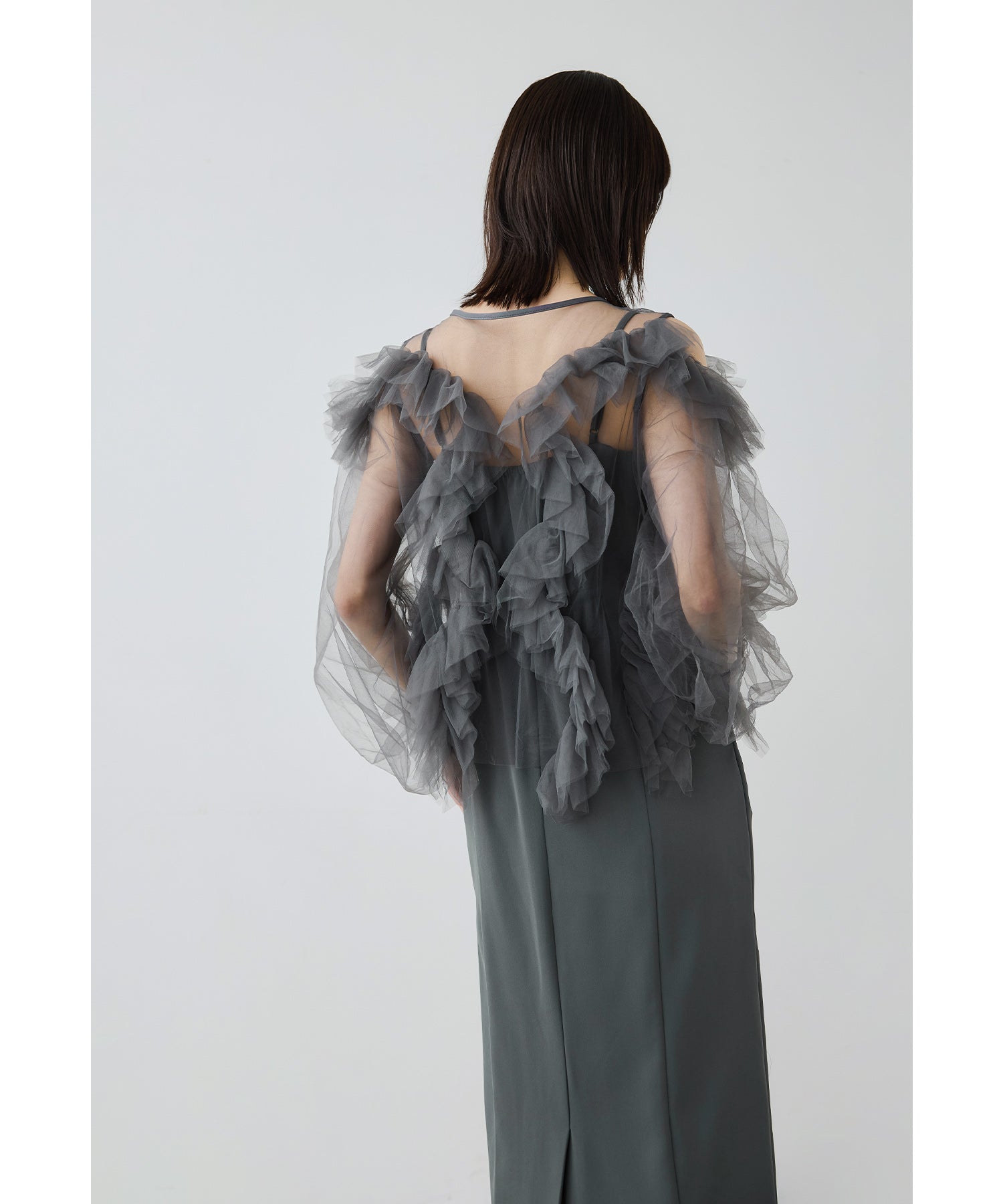 Rname ダブルリボンチュールフリルブラウスセットドレス パーティードレス 結婚式 キャミワンピース シアー 2点セット ロング丈 長袖 お呼ばれ パーティー 二次会 披露宴 謝恩会 成人式 同窓会 卒業式 フォーマル オケージョンドレス 春 夏 秋 冬 黒 ベージュ ピンク ミント グレー