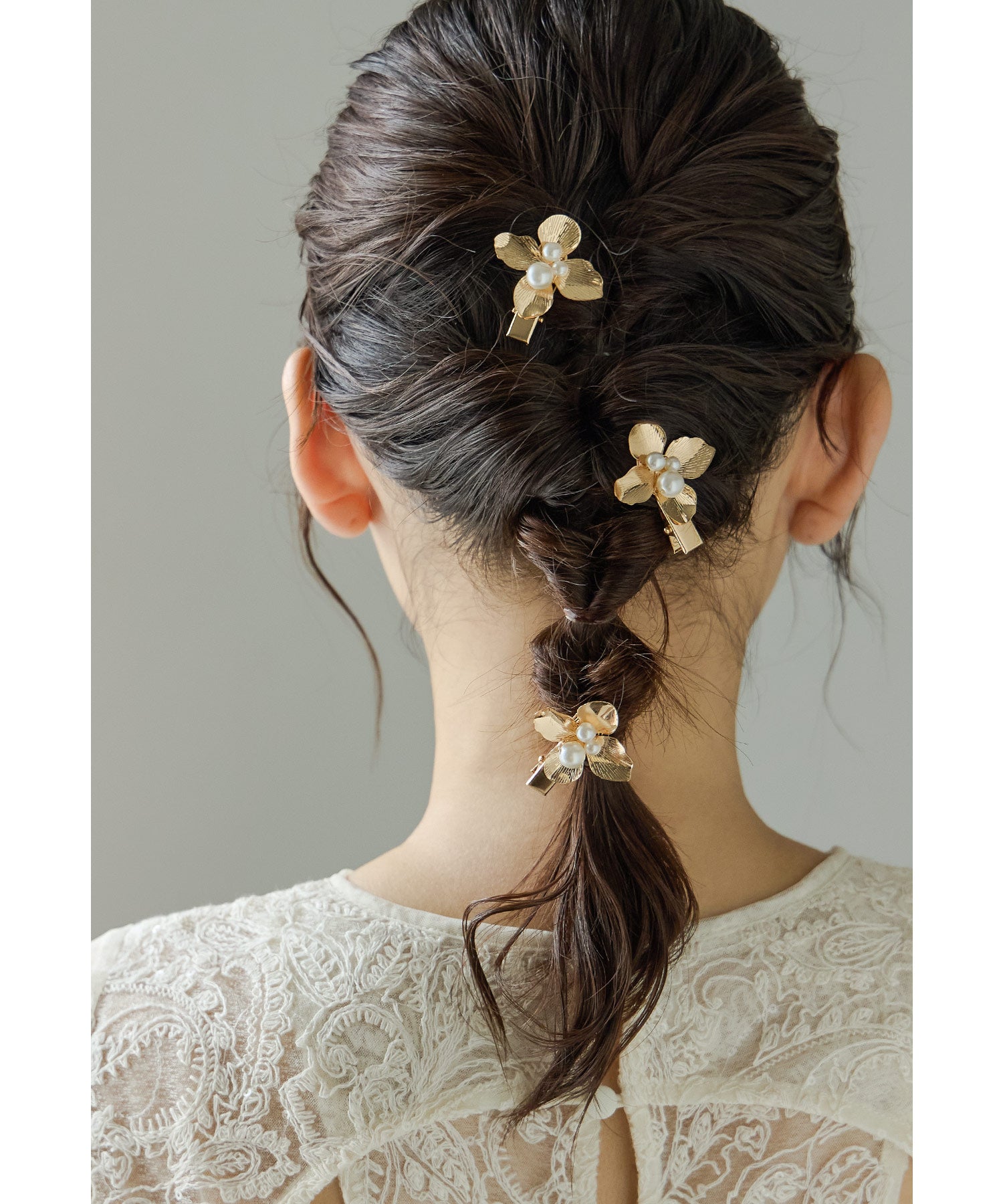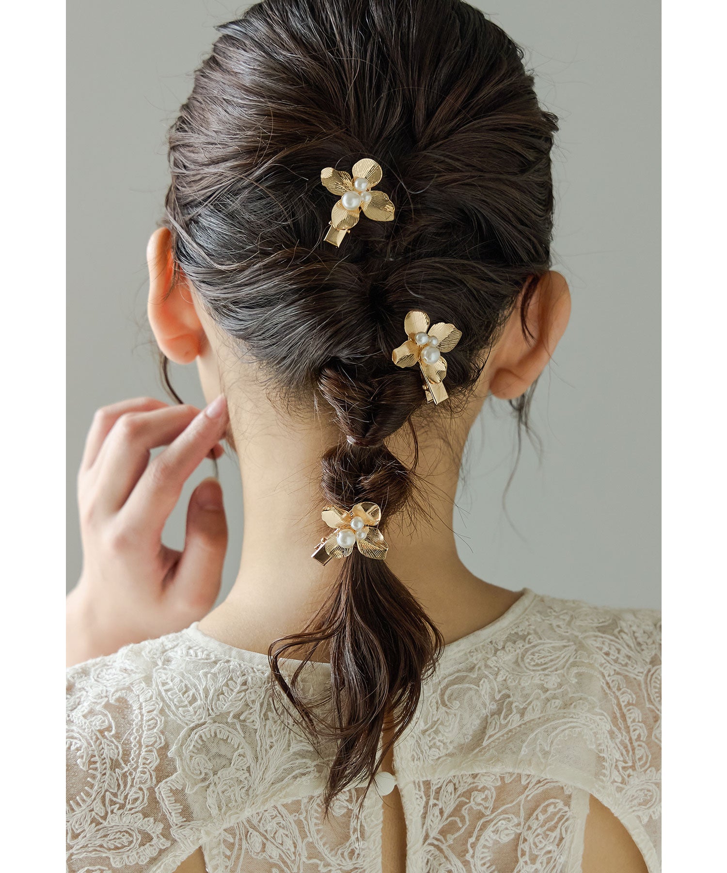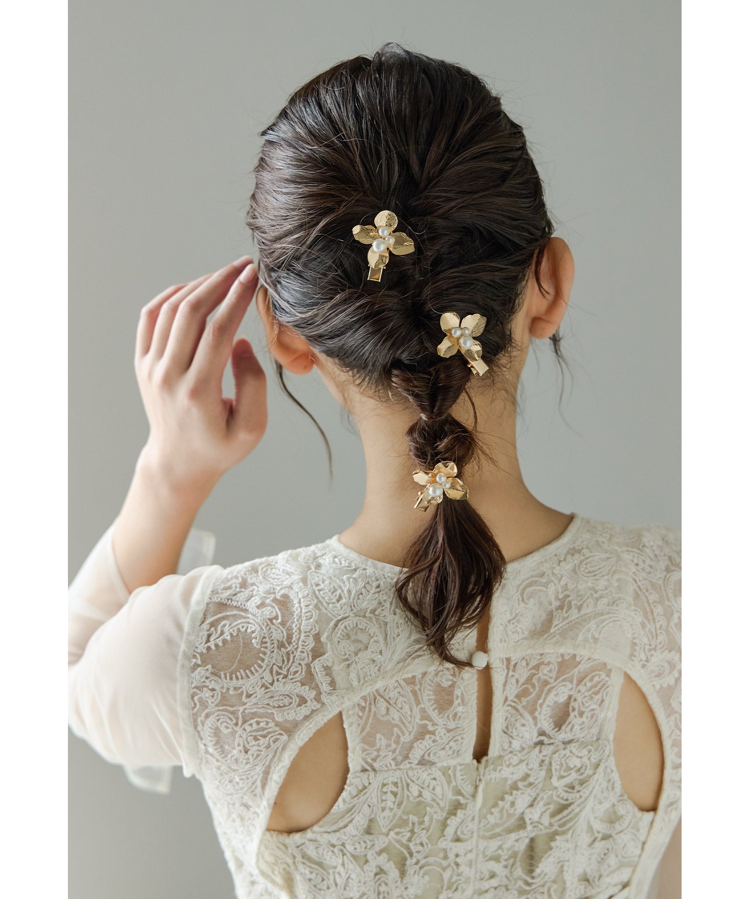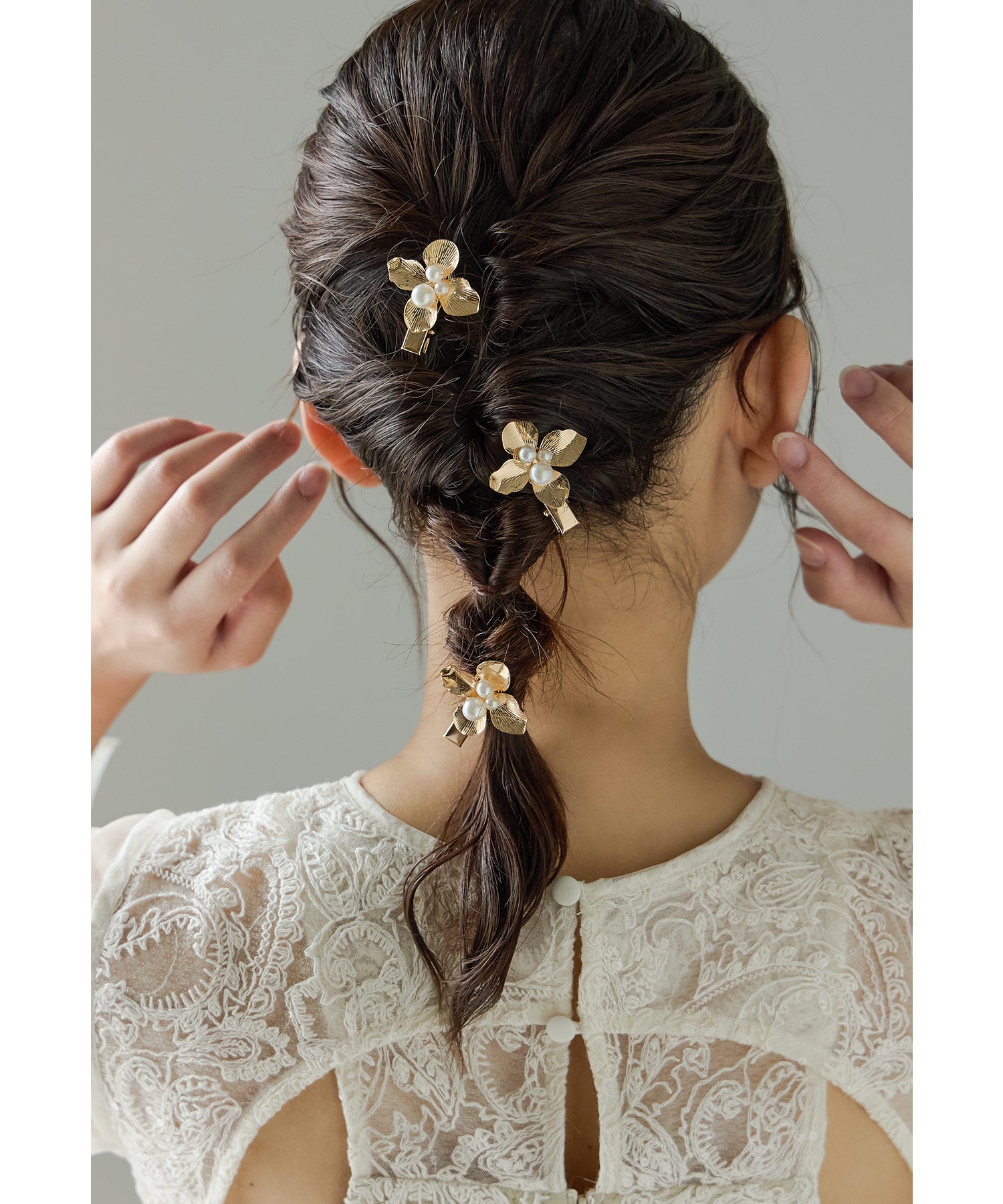 メタリックの花びらにパールをあしらったヘアクリップ3点セット。