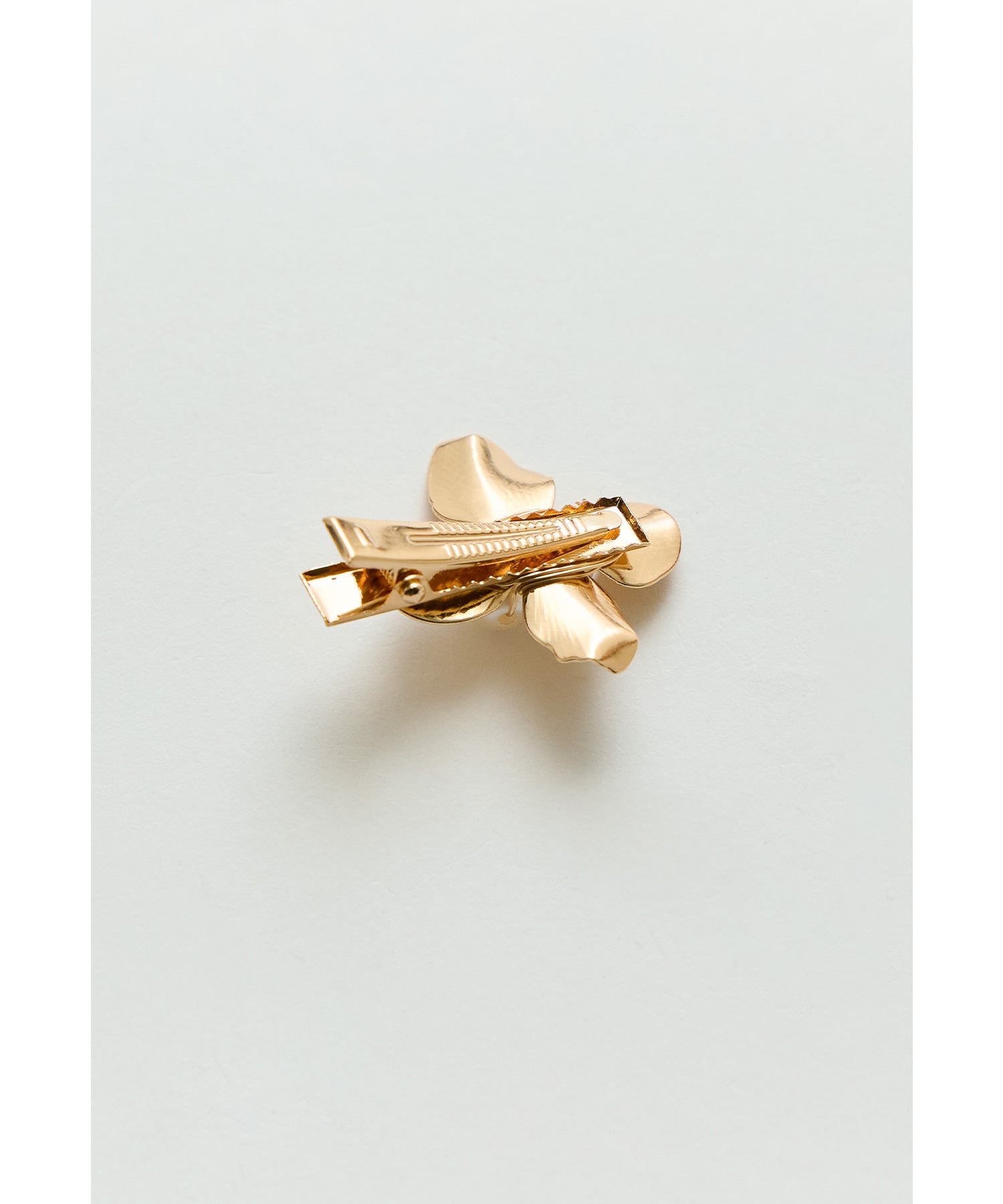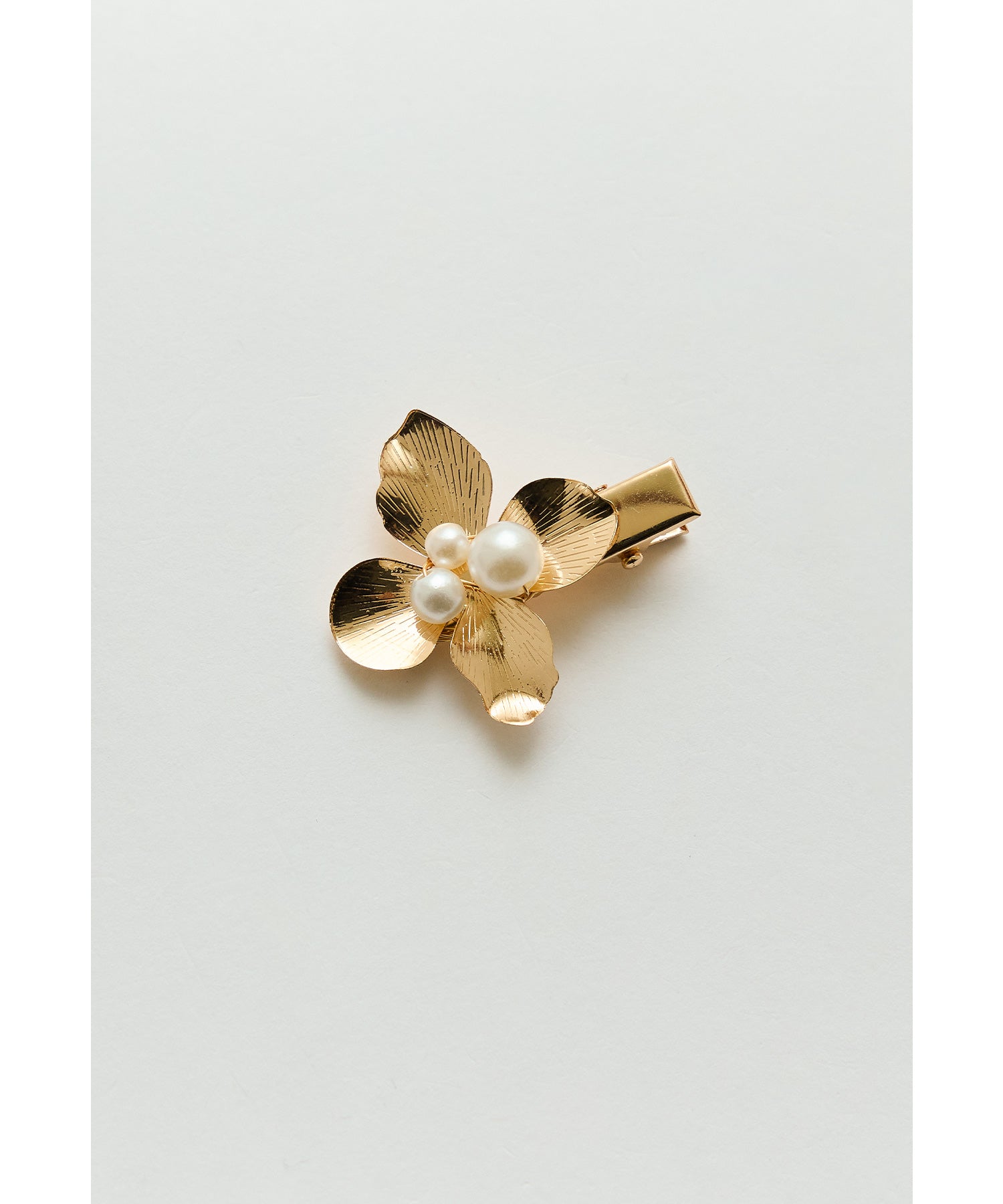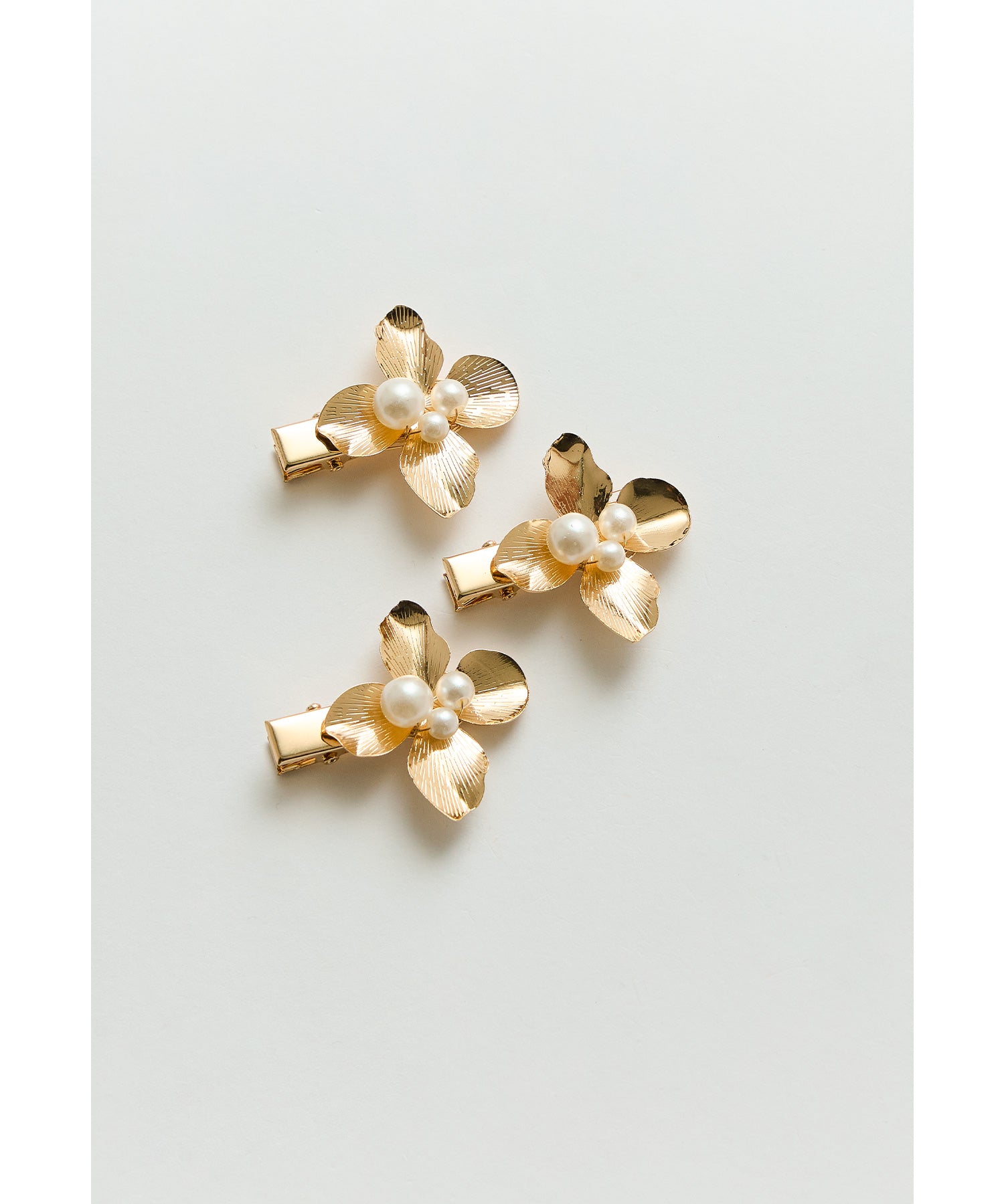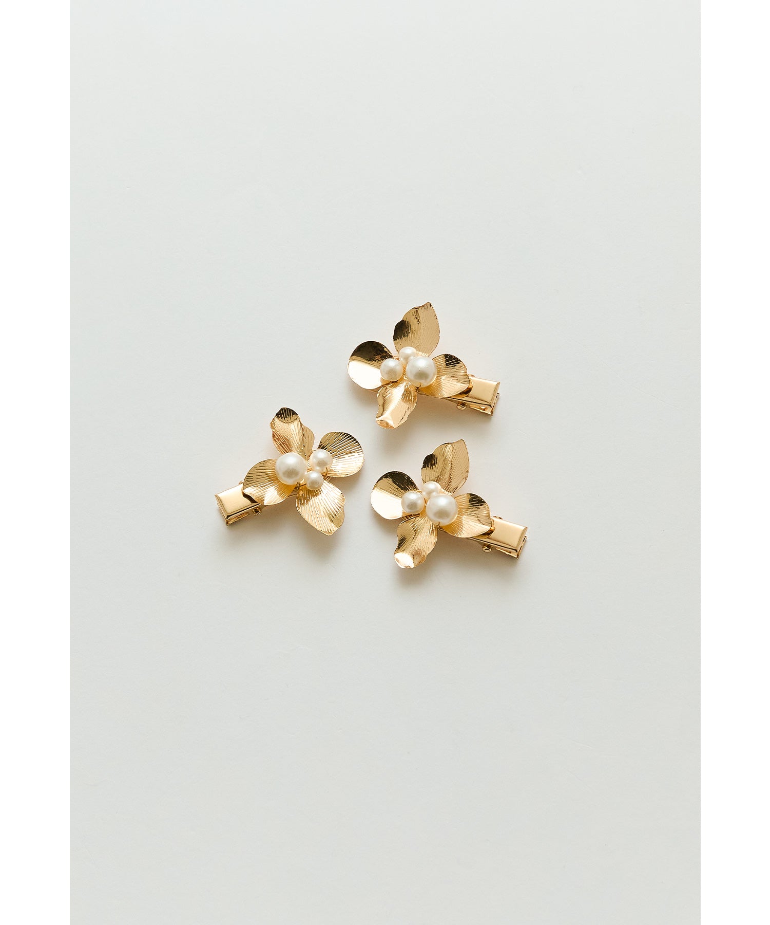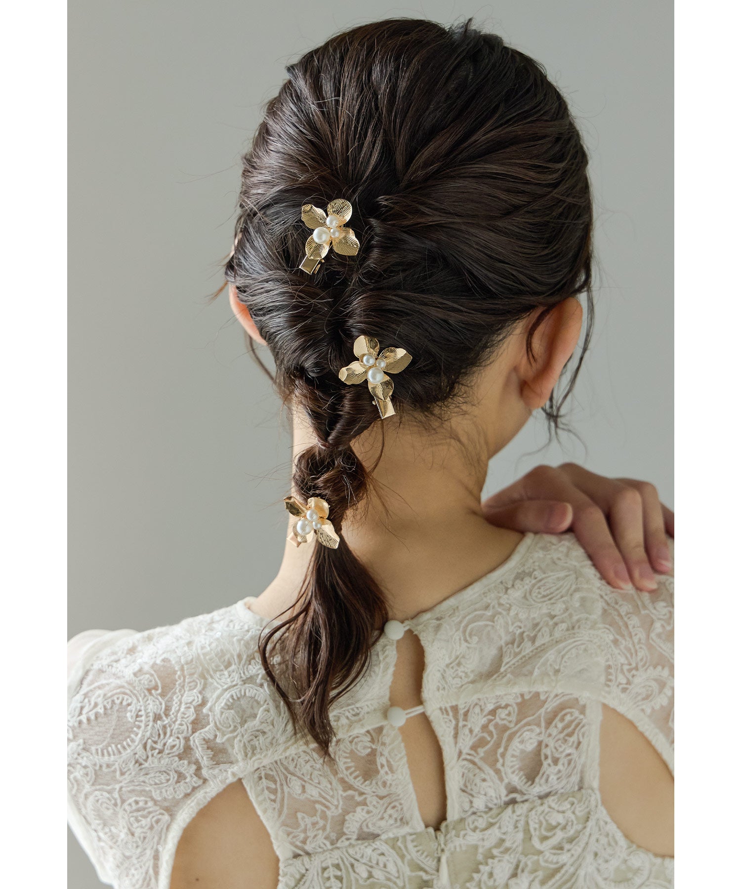 メタリックの花びらにパールをあしらったヘアクリップ3点セット。