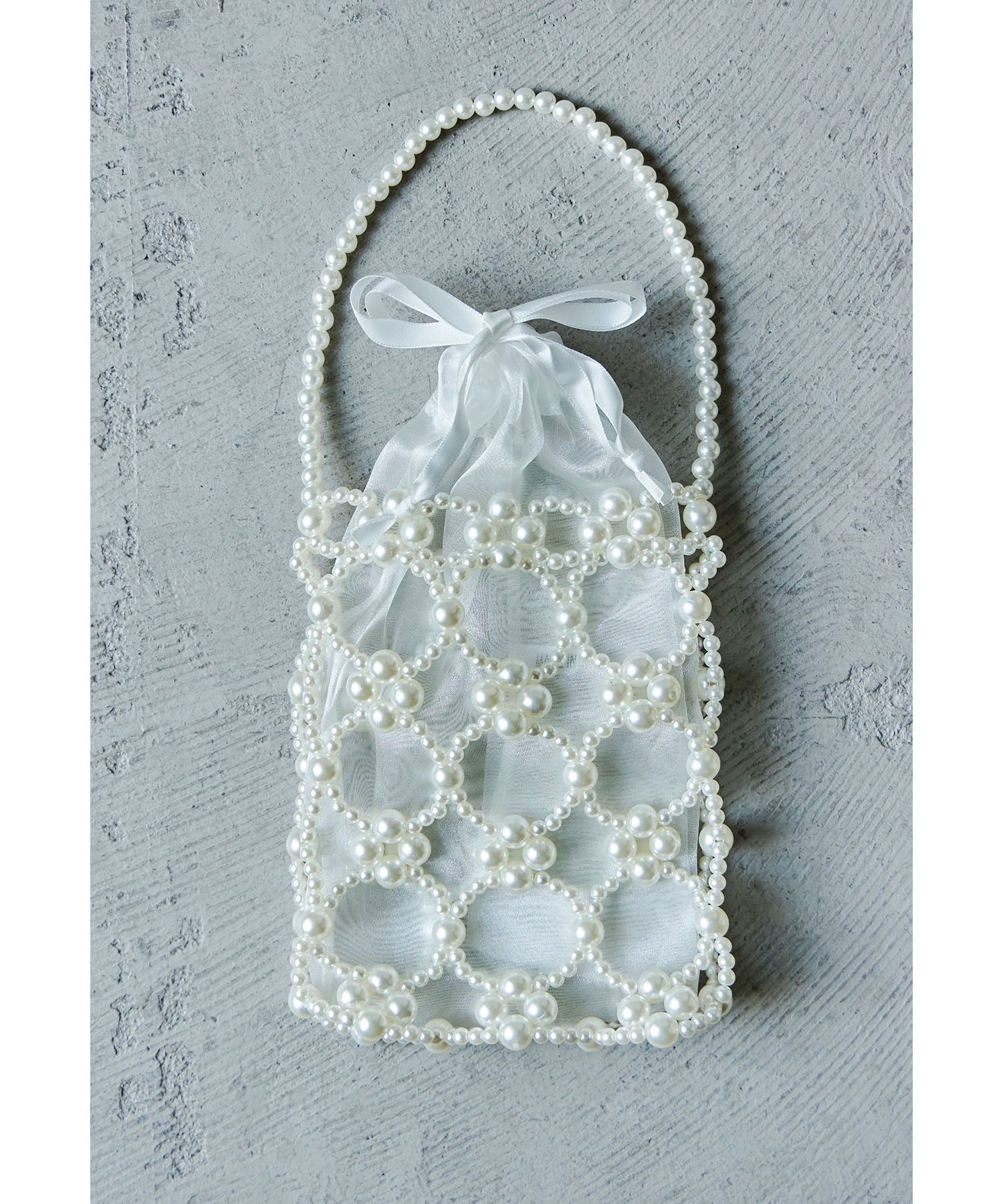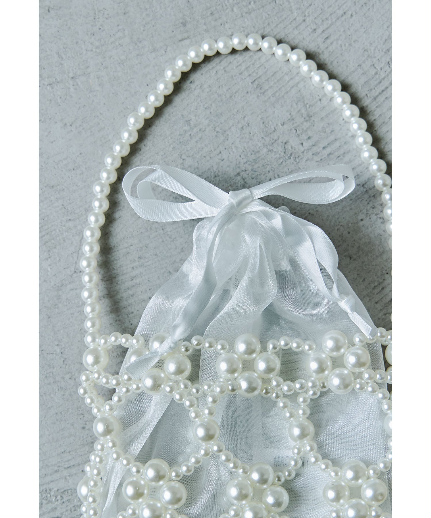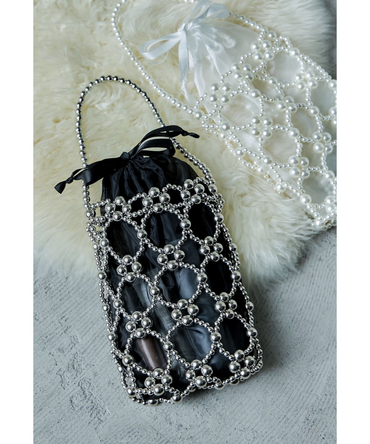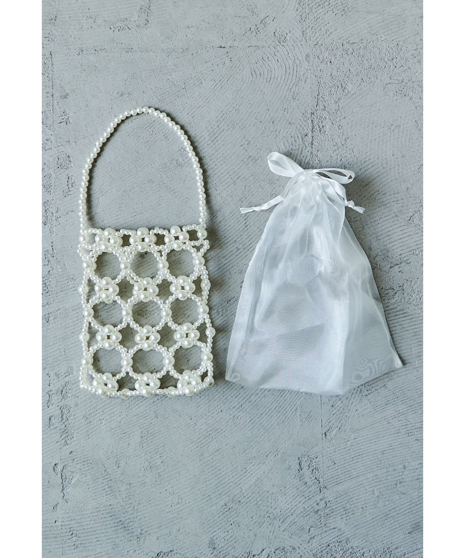 大きさが異なるフェイクパールを使った本体と上品な透け素材の巾着を組み合わせたデザイン。
