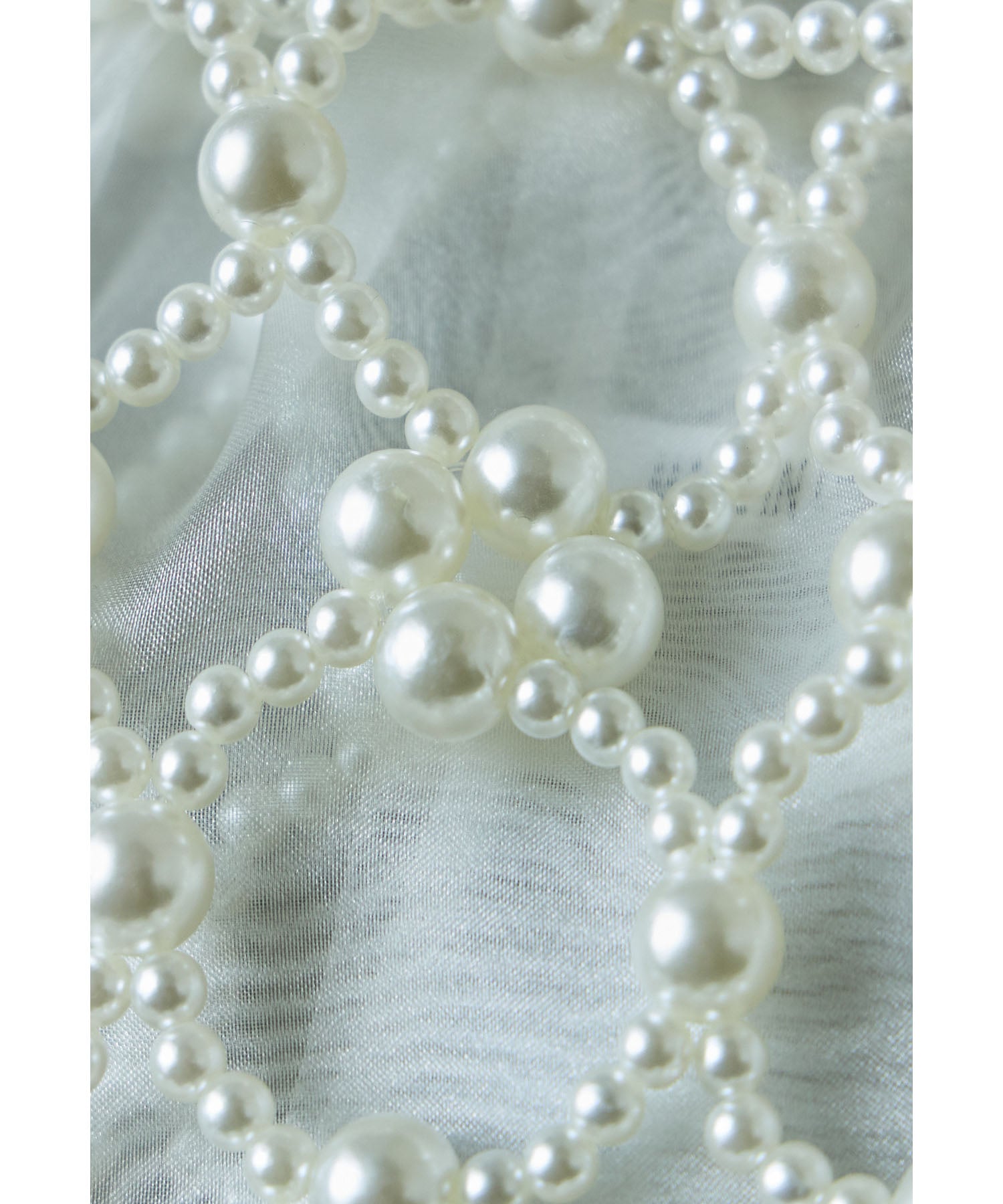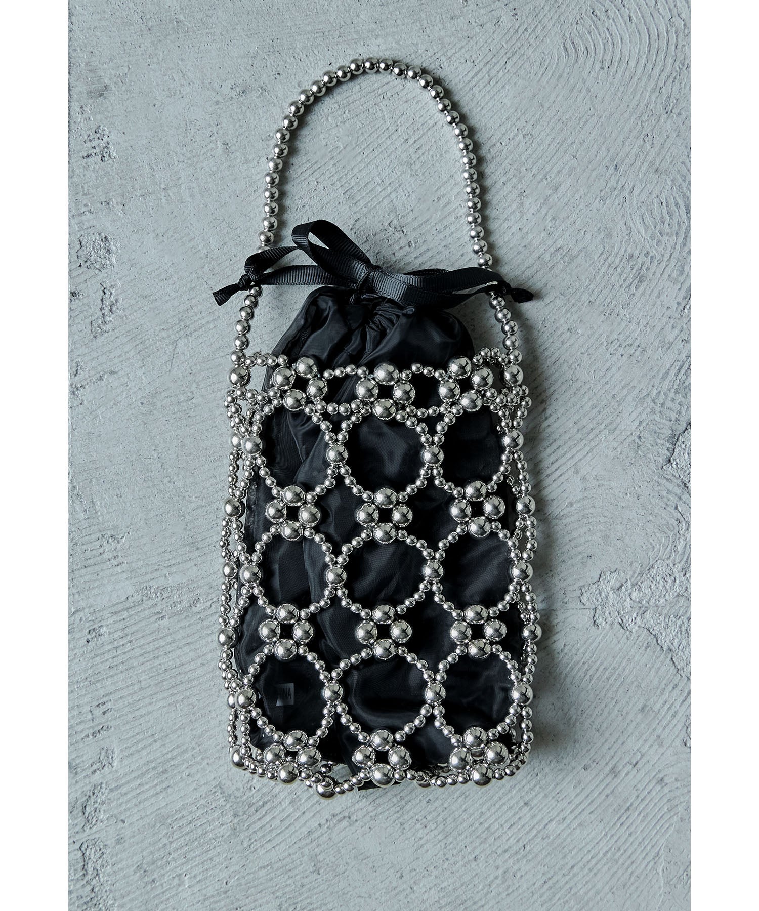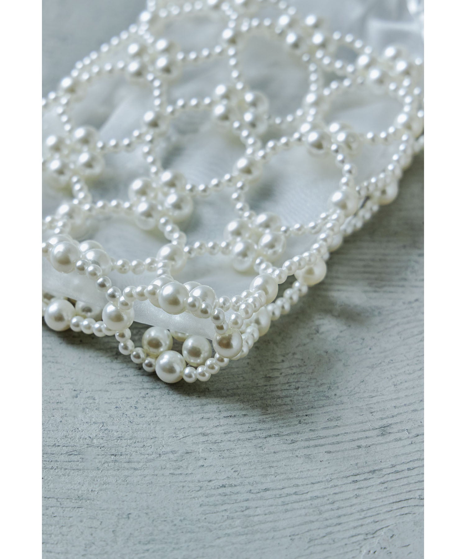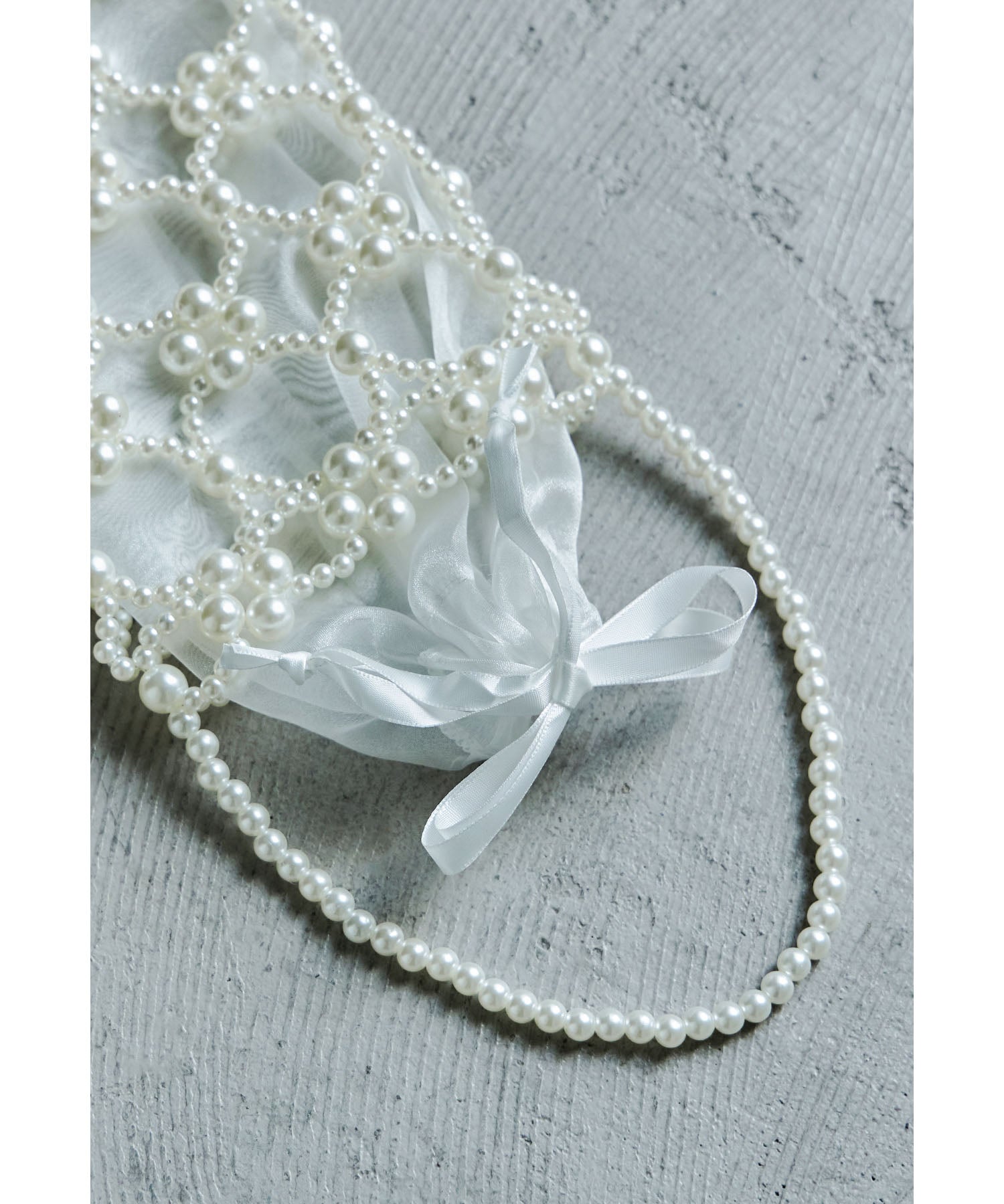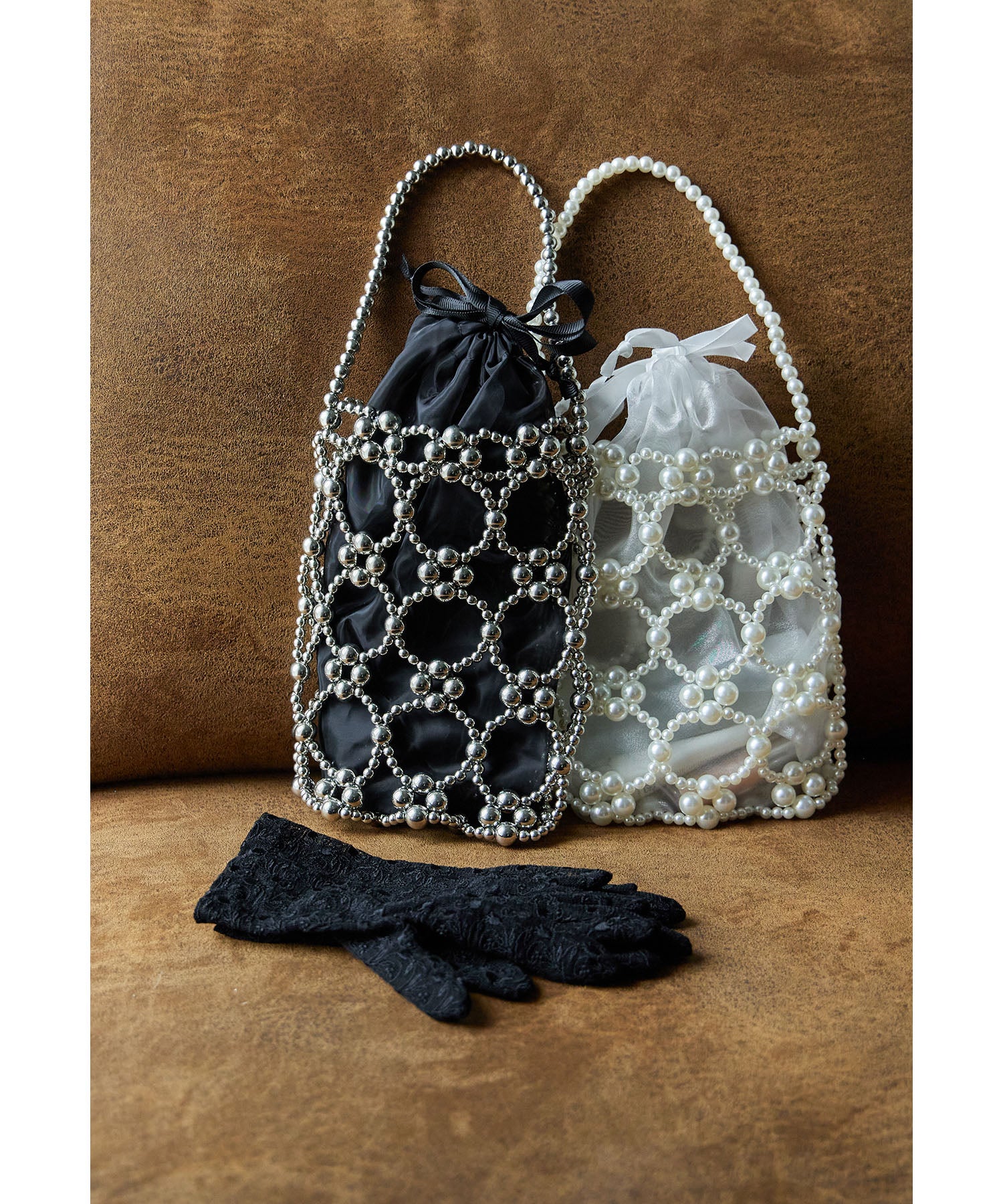 大きさが異なるフェイクパールを使った本体と上品な透け素材の巾着を組み合わせたデザイン。