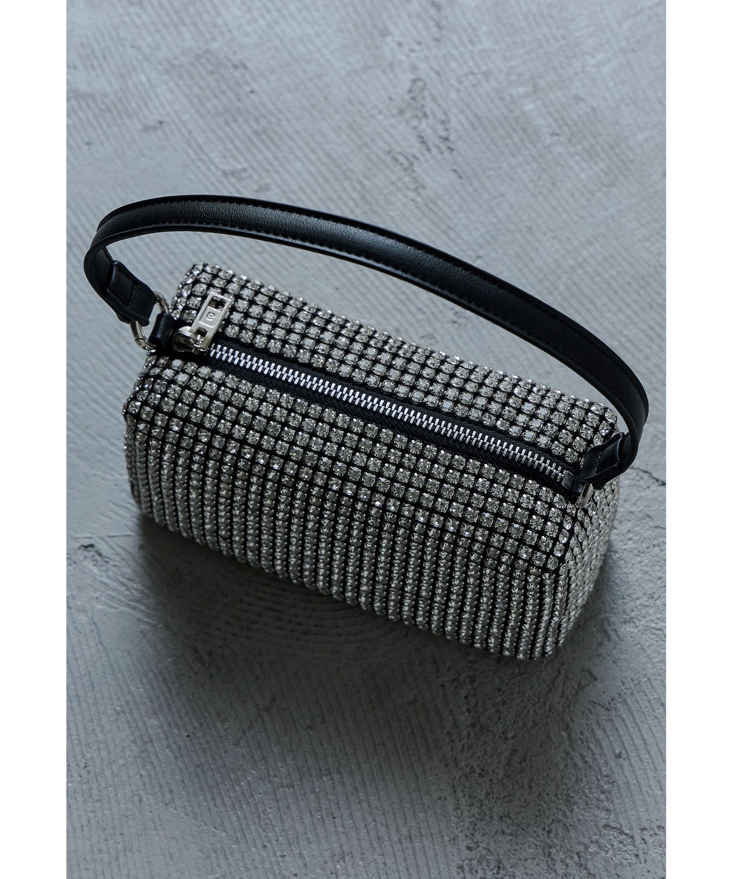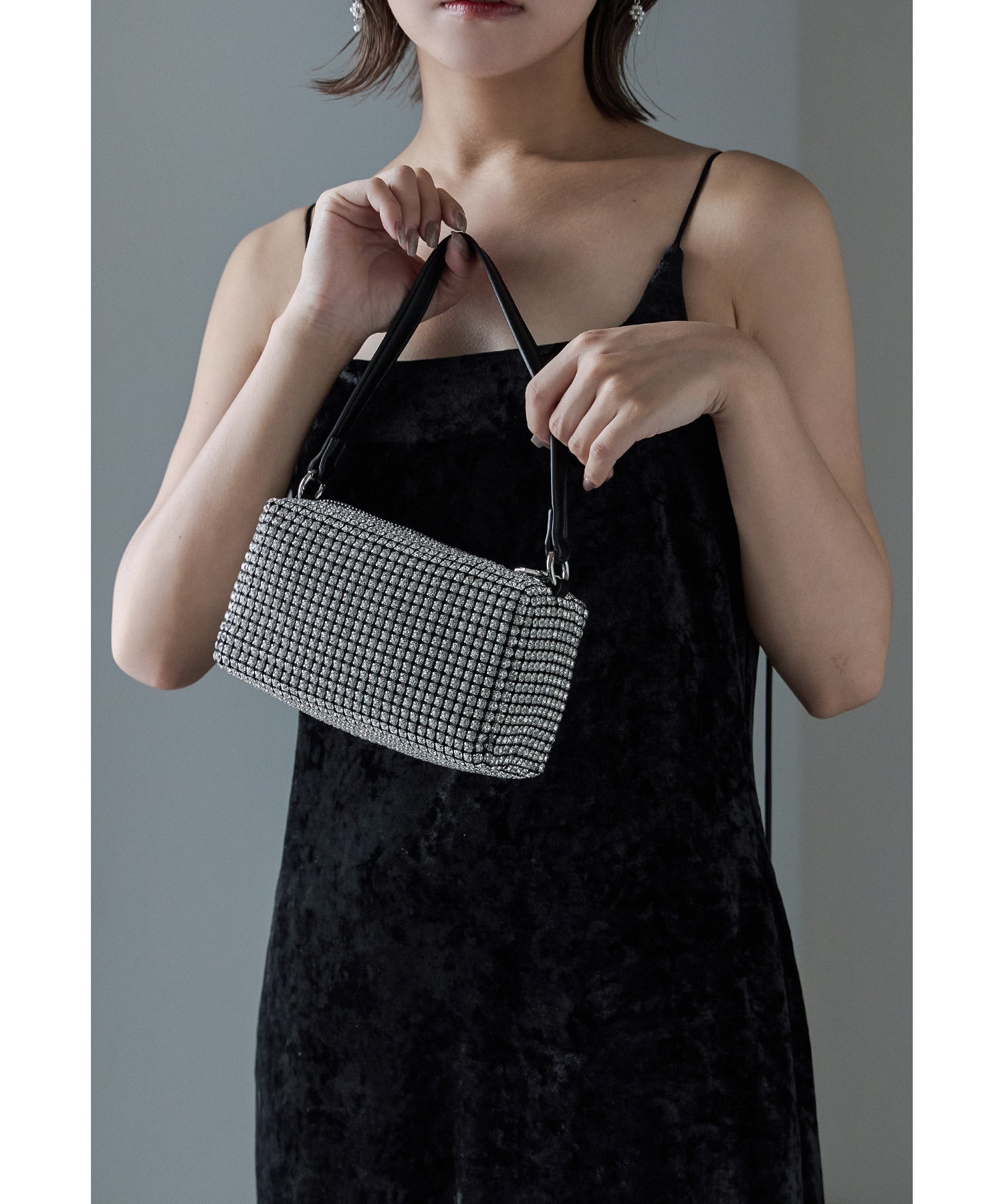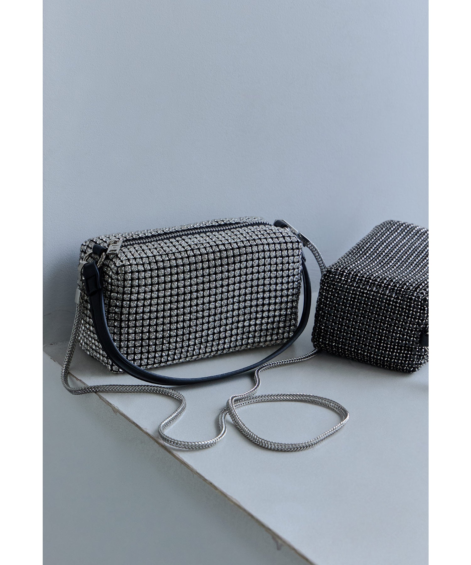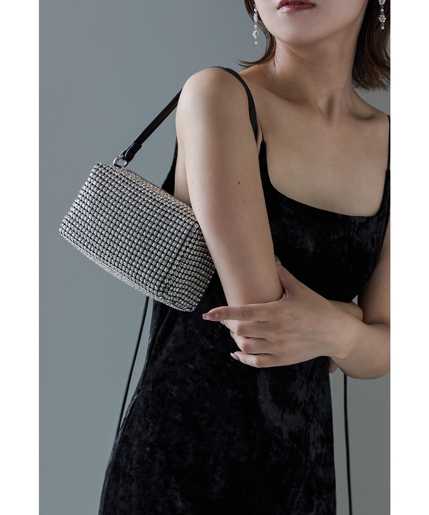 全体に施されたラインストーンが煌めくスクエア型バッグ。