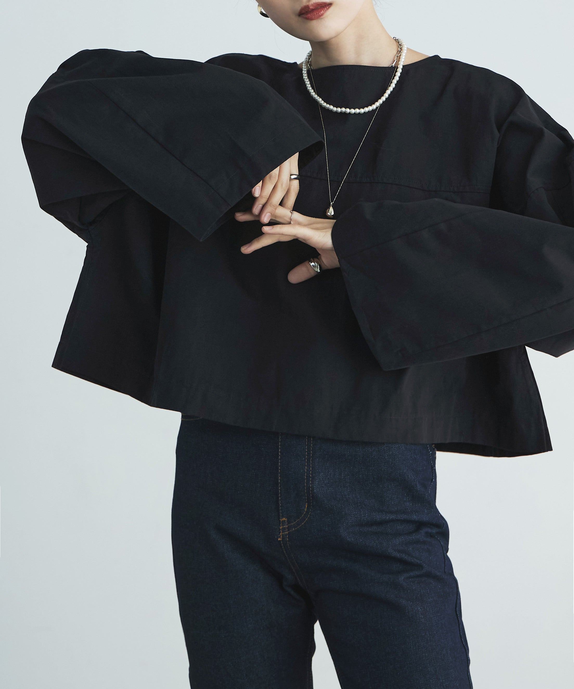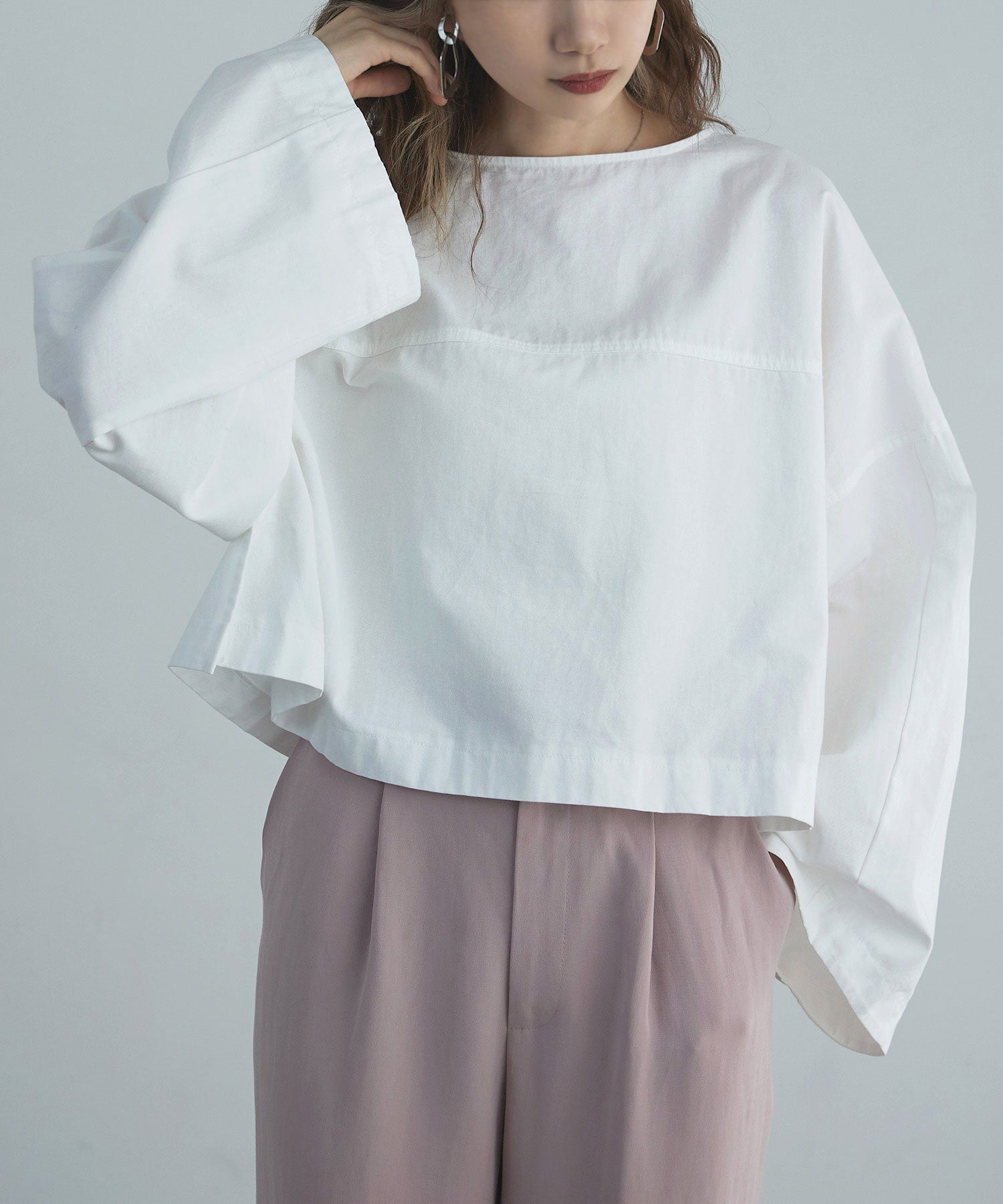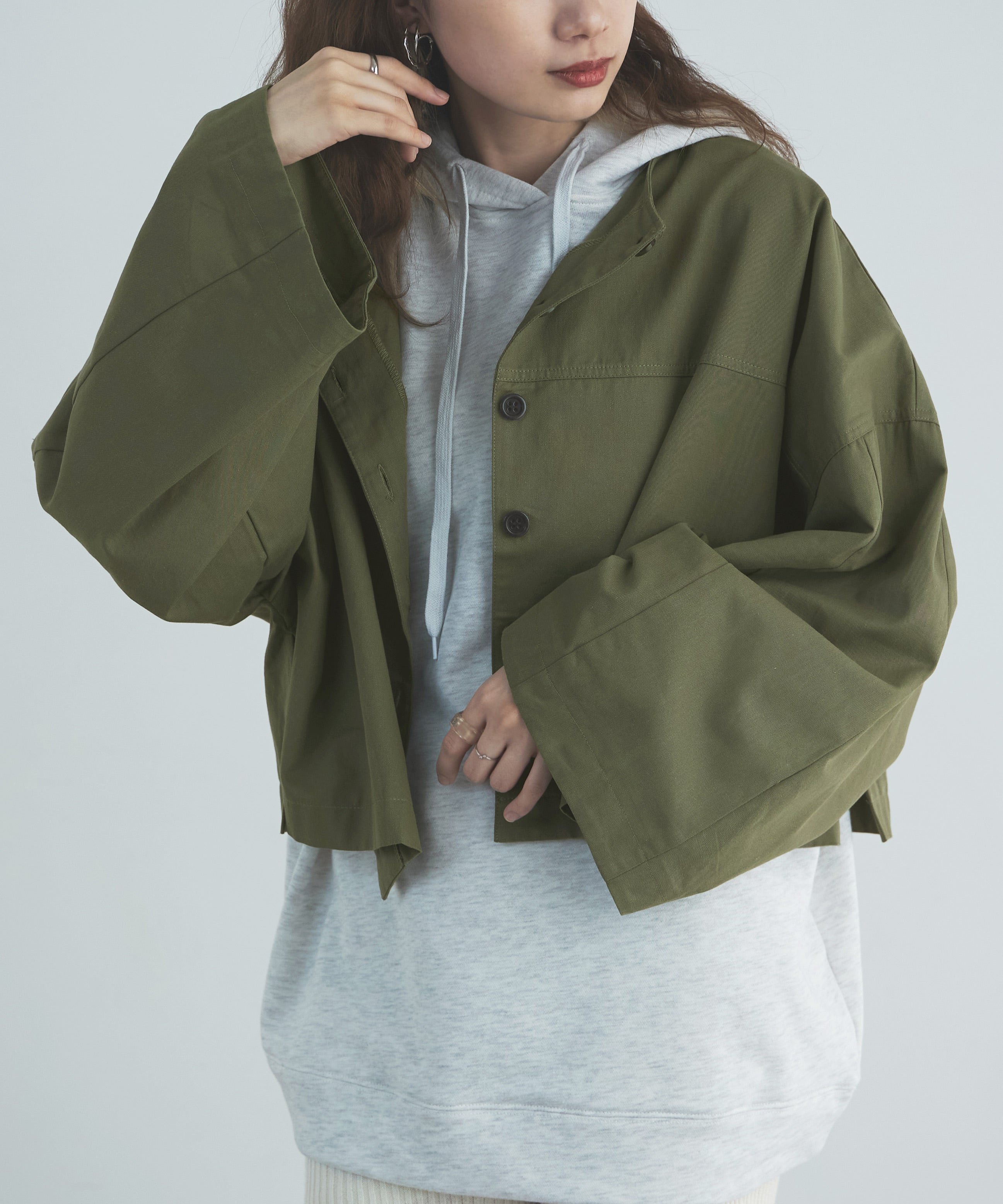 Rname 2wayコットンオーバーブラウス トップス アウター シャツ ブラウス 長袖 綿 綿100 コットン ノーカラー クルーネック ビッグシルエット 前後2way 羽織り ミリタリーシャツ クロップド ショート丈